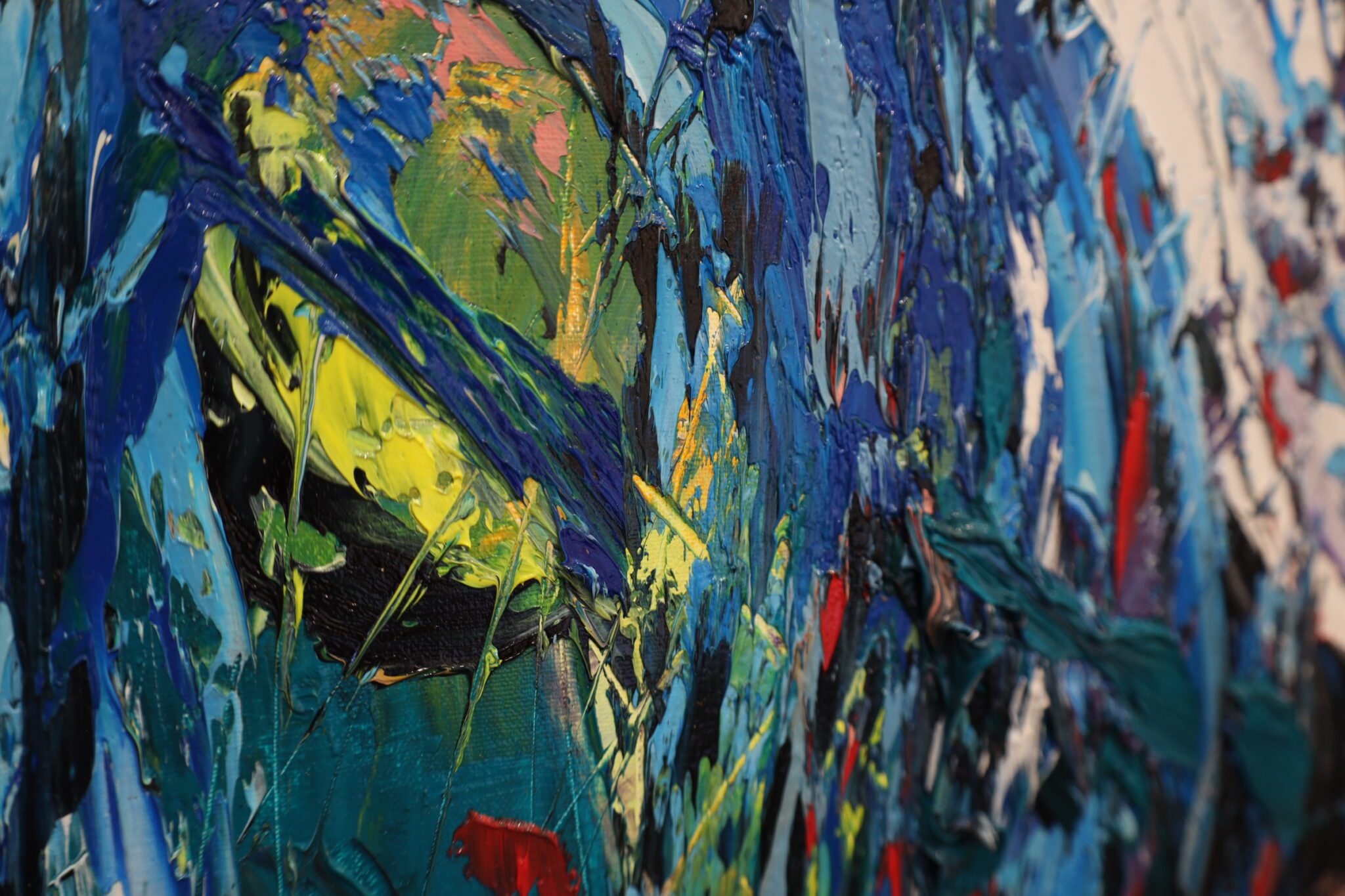 The composition is split between control and chaos. The upper portion of the canvas, with its serene green gradient, recalls the soft, atmospheric backgrounds of classical painting. Yet, as the eye moves downward, the scene erupts into a maelstrom of aggressive impasto, splattered paint, and near-violent texture. The rich fabrics and delicate flesh that traditionally define reclining nudes are obliterated in a storm of abstraction, where deep blues, fiery reds, and tangled strokes suggest both opulence and destruction.