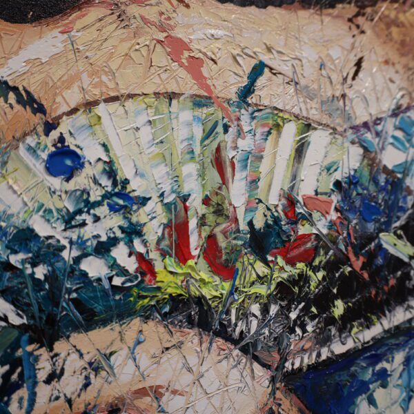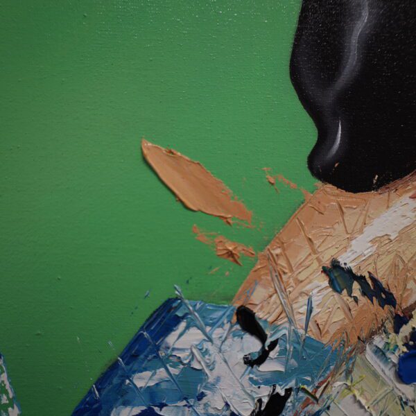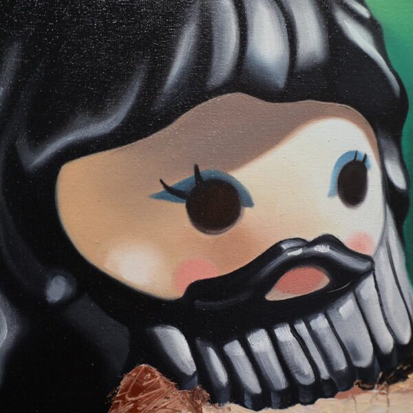 Madrigal’s use of textural layering and expressive mark-making forces the viewer to question what is being preserved and what is being erased. The Playmobil head, with its plastic simplicity and manufactured uniformity, stands in stark contrast to the expressive, painterly chaos below, offering a sharp commentary on the commodification of identity, the artificiality of beauty, and the tension between tradition and modernity.