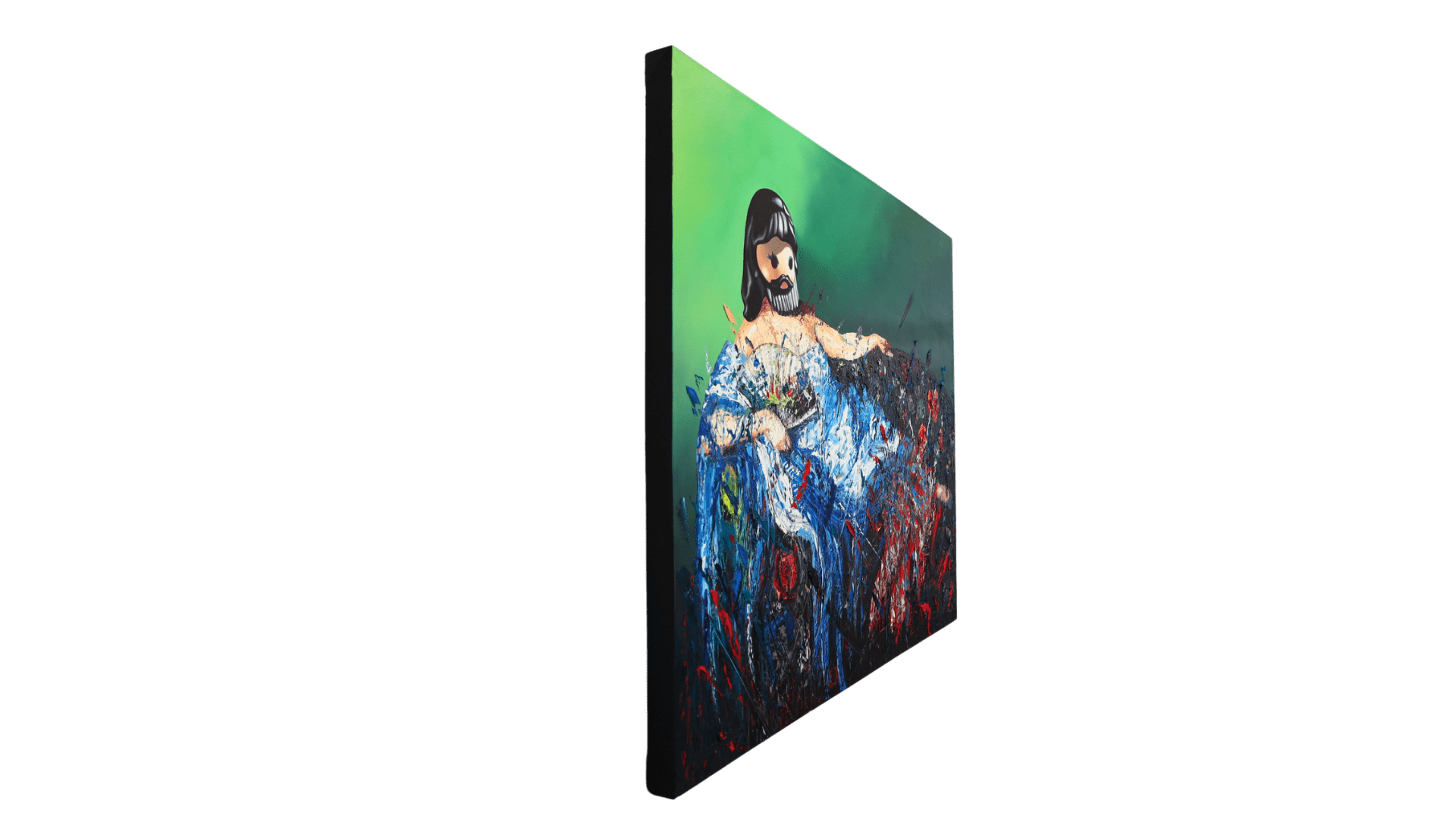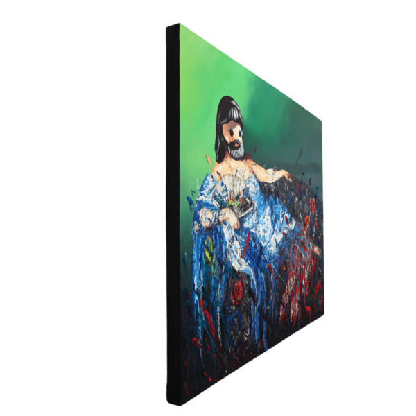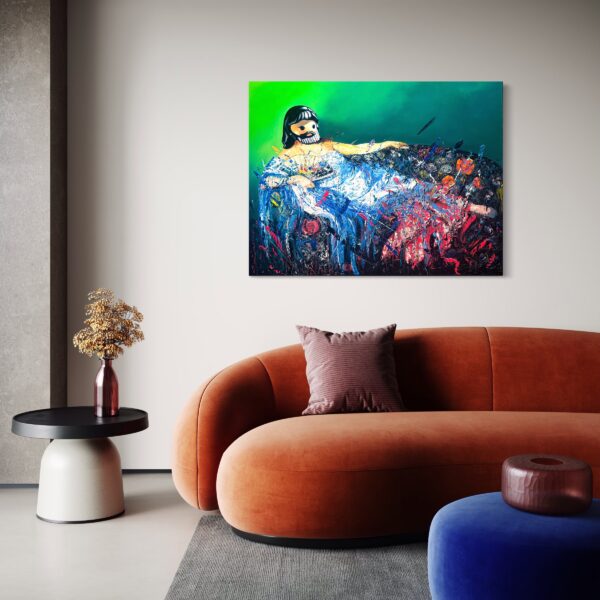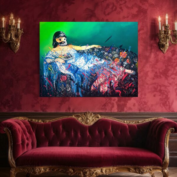 Ivan Madrigal’s Reclining Venus Reimagined is a daring fusion of classical portraiture, pop surrealism, and visceral abstraction, where art history and contemporary satire collide in a chaotic, yet deliberate, act of visual rebellion. Inspired by the great reclining nudes of Western art—most notably Titian’s Venus of Urbino or Manet’s Olympia—Madrigal subverts the genre by replacing the subject’s face with a Playmobil-like toy figure, transforming a symbol of sensuality into an unsettling yet humorous emblem of mass-produced nostalgia and depersonalization.
