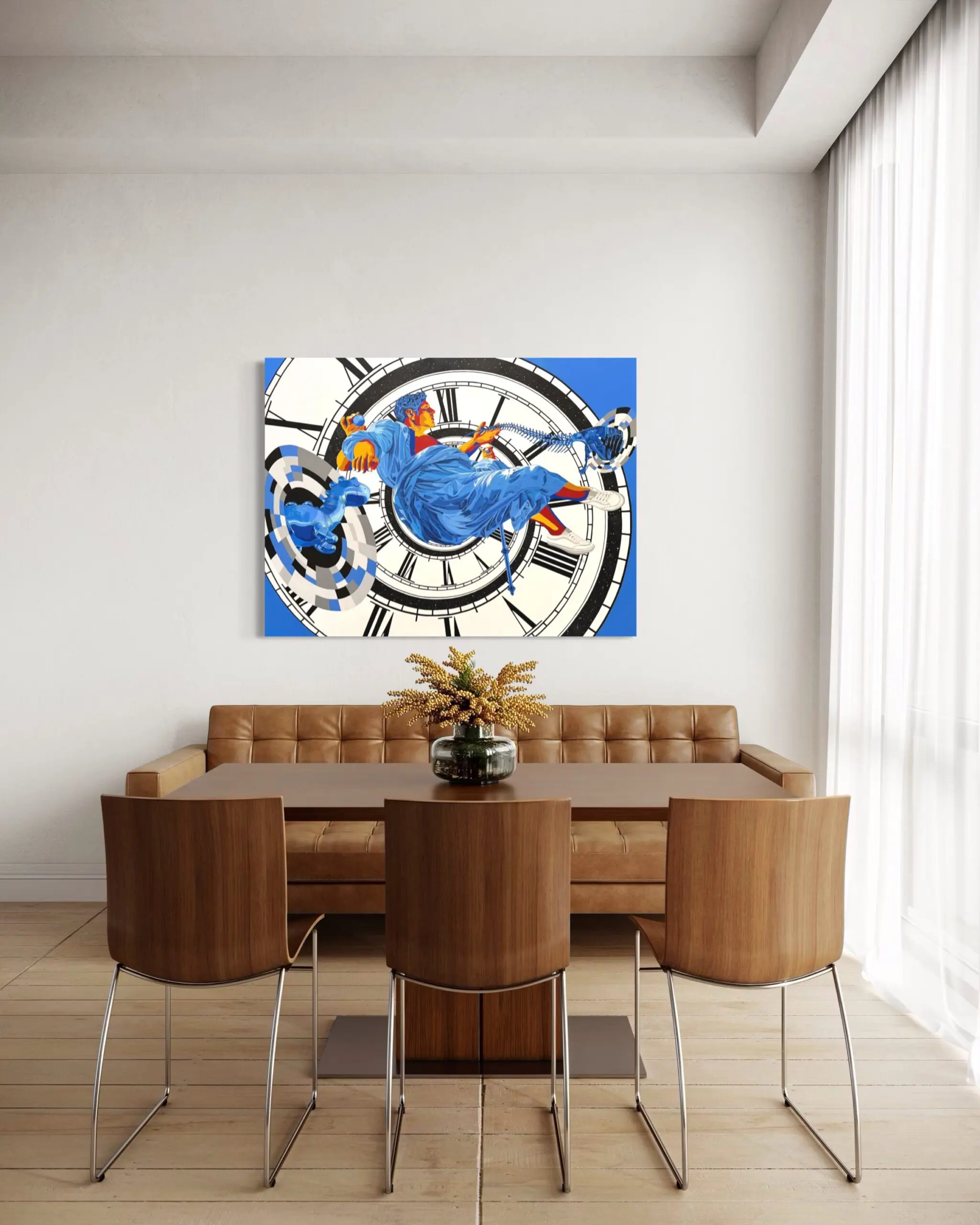 The background’s monumental clock face, with its stark black and white Roman numerals, serves as both a literal and metaphorical anchor, reinforcing themes of fate, inevitability, and cyclical time. The painting’s geometric distortions and kaleidoscopic patterns heighten the sense of displacement, as though the very fabric of reality is glitching, forcing the viewer to question: Are we in control of time, or merely passengers in its relentless current?