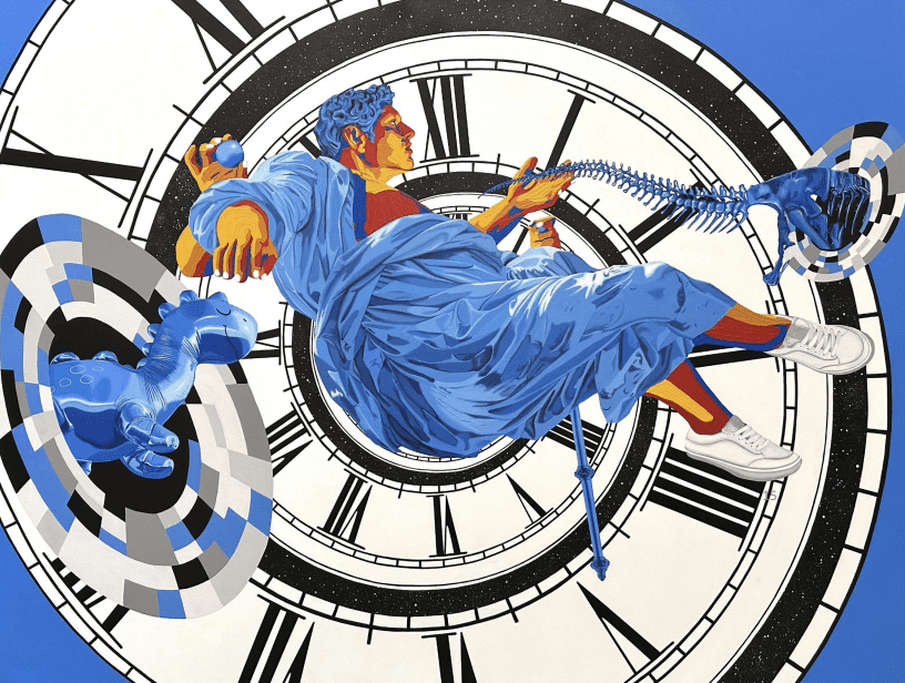 Rendered in bold, hyper-saturated hues of electric blue, fiery gold, and deep crimson, the figure’s form recalls both ancient Greco-Roman sculpture and futuristic digital avatars. Clutching a dismantled spinal column, their hands grasp at both the organic and the artificial, as if trying to piece together the fragments of selfhood while being flung across time’s relentless march. An inflatable dinosaur emerges from one portal, while a skeletal hand reaches through another—playful nostalgia and impending mortality coexisting in a paradoxical dance.