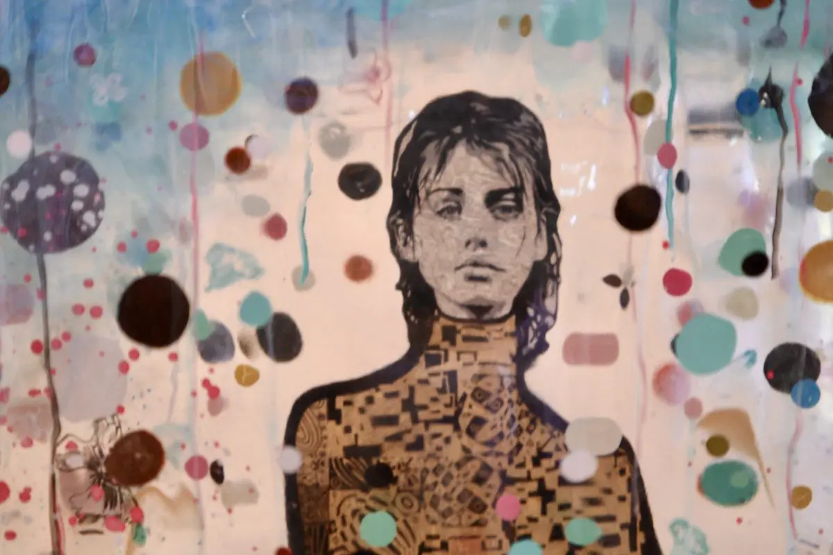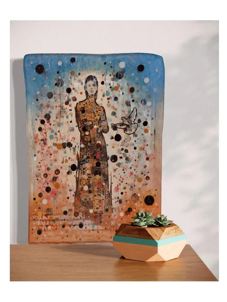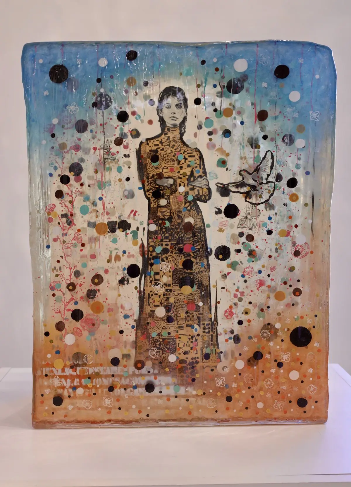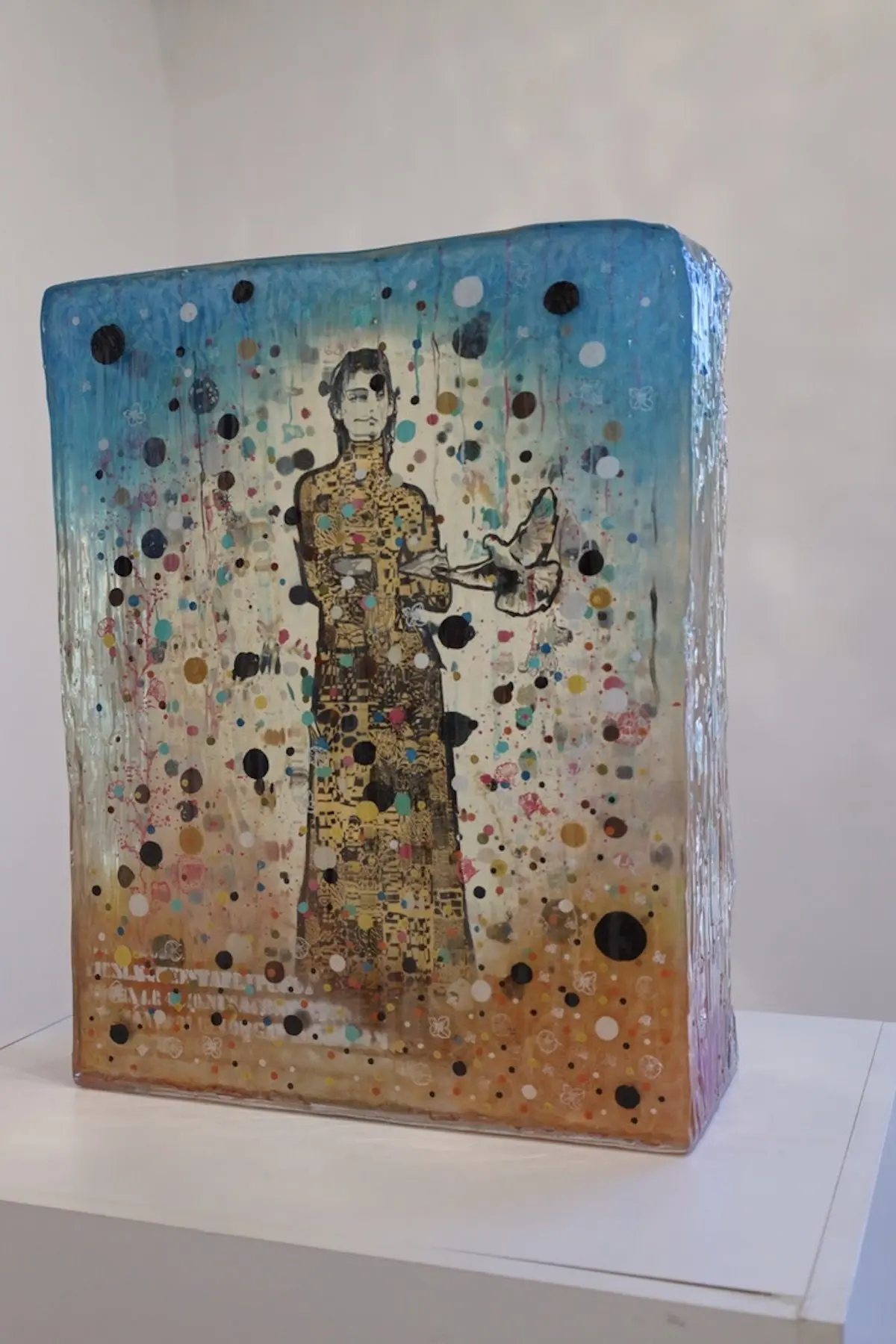 The resin sculpture “Interior Light” by Jose Cacho features the figure of a man, realistically rendered and standing amidst a beautifully chaotic array of colorful dots, floral patterns, and whimsical elements like butterflies. The man’s textured, patterned outfit integrates  with the composition of multi-colored circles and decorative motifs suspended in the clear resin. The outer edges of the cube are subtly tinted blue, enhancing the dreamlike quality of the artwork. The use of resin not only preserves the vibrancy of the colors but also creates an effect of depth and movement, inviting viewers to explore the intricate relationship between the figure and the surrounding space.