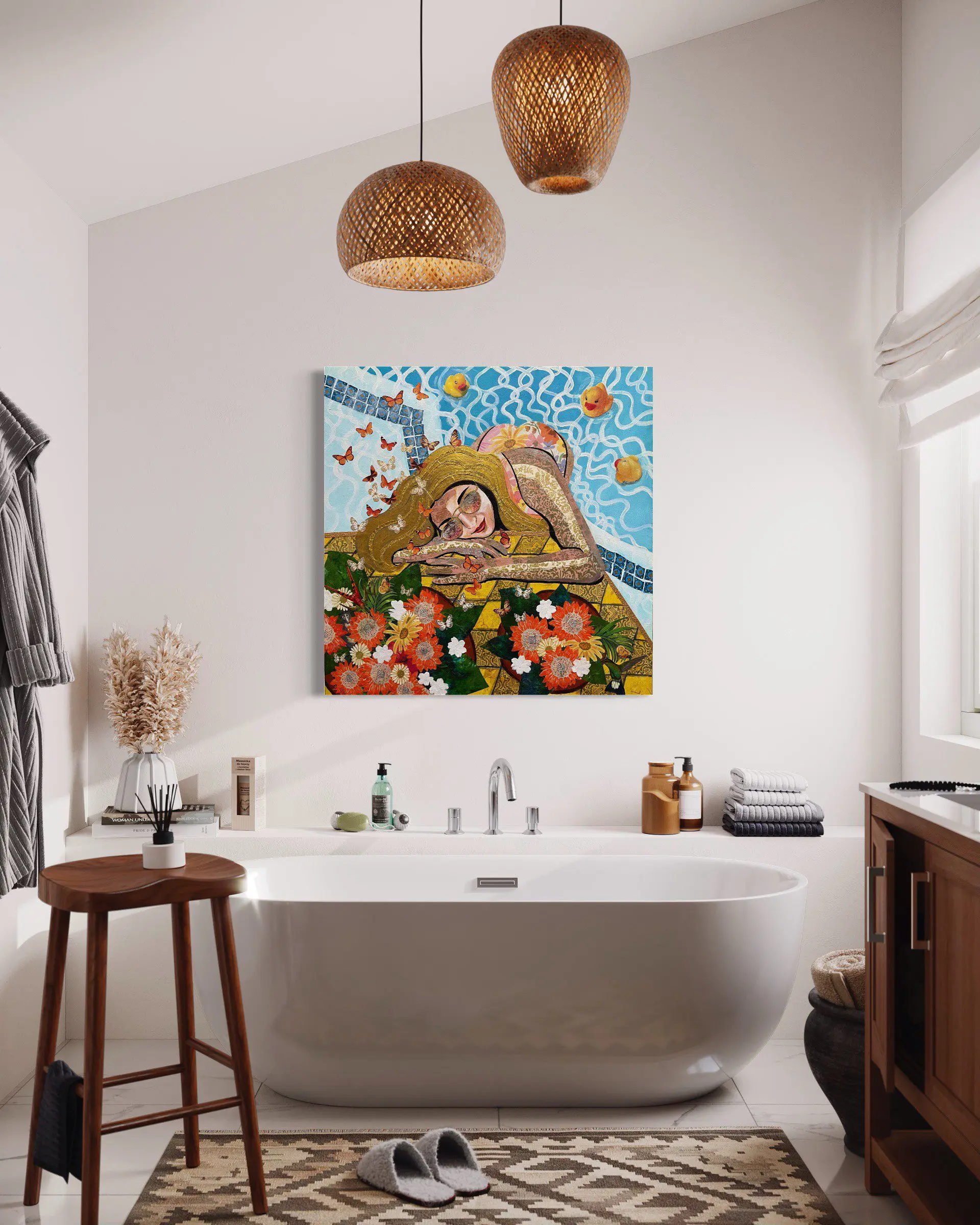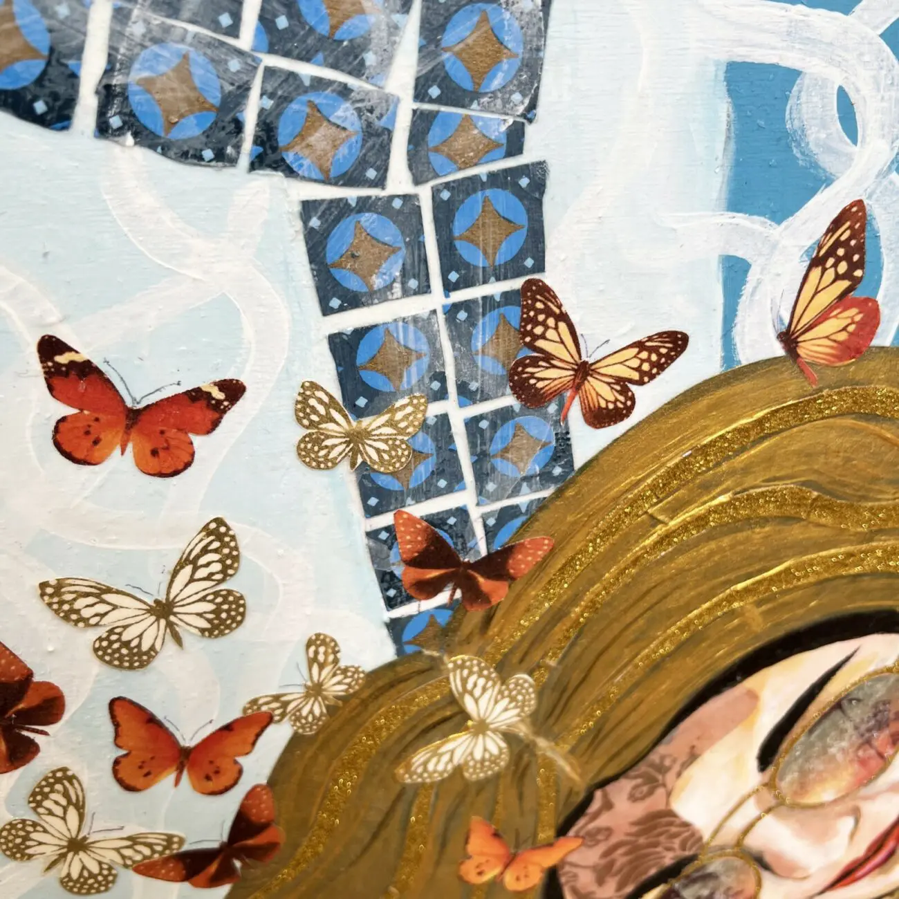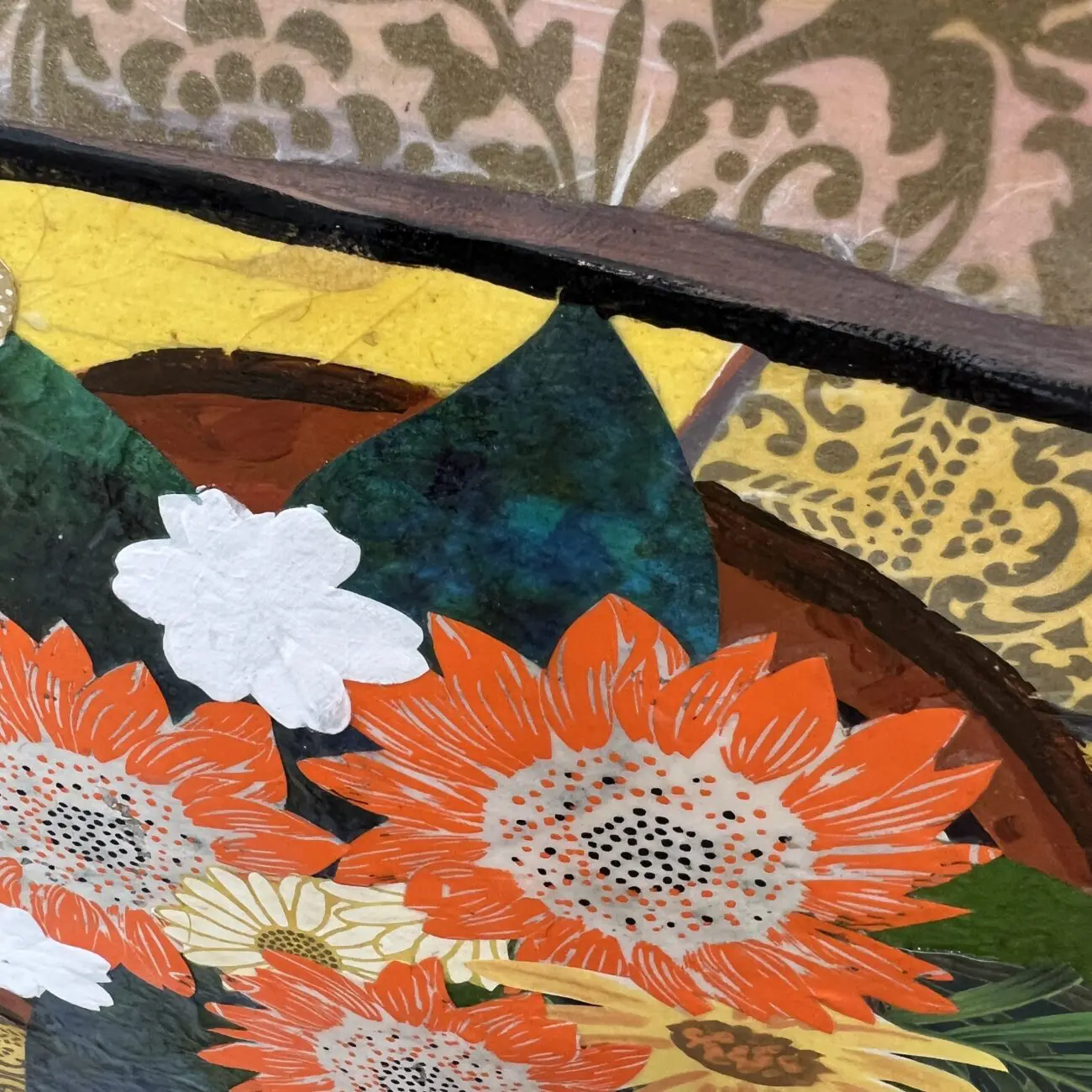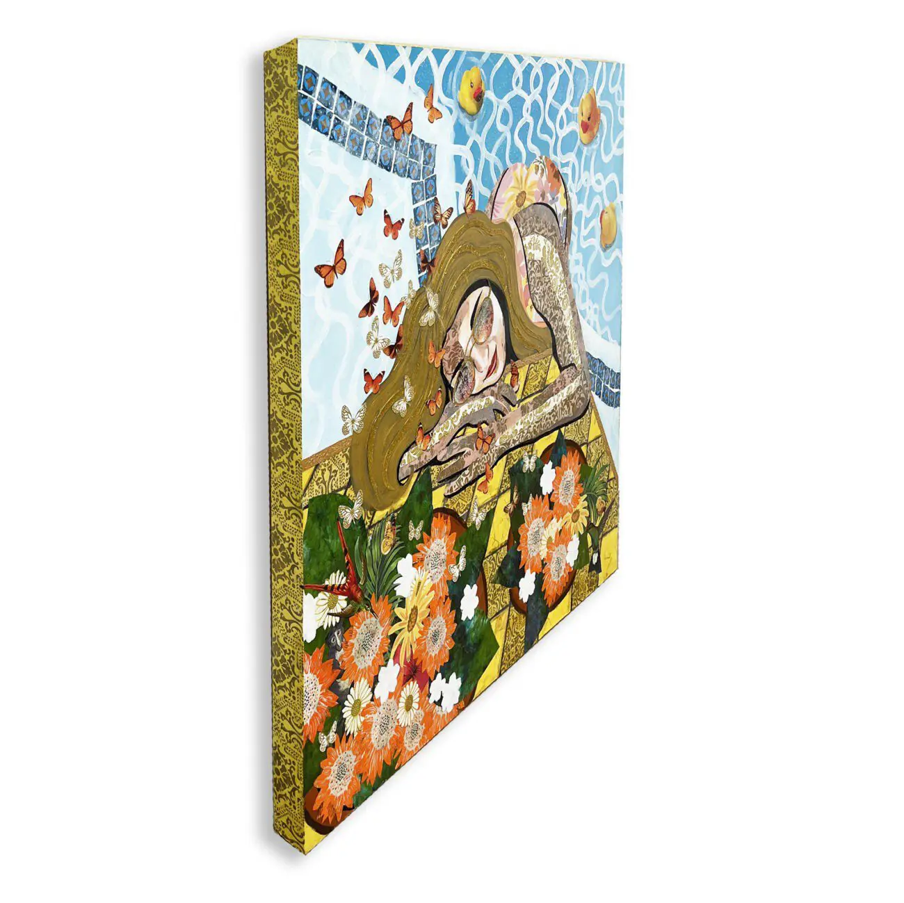 This 30 inch square original mixed media painting on wood arrives ready to hang. Layers of patterned collage elements and acrylic paint bring this artwork to life. The layering and unique texture of colorful clippings and geometrical designs create a window looking into a luxurious escape perfect for any home or office. The sides of the artwork are painted and it does not require framing. It is signed and titled by the artist on the back of the artwork.