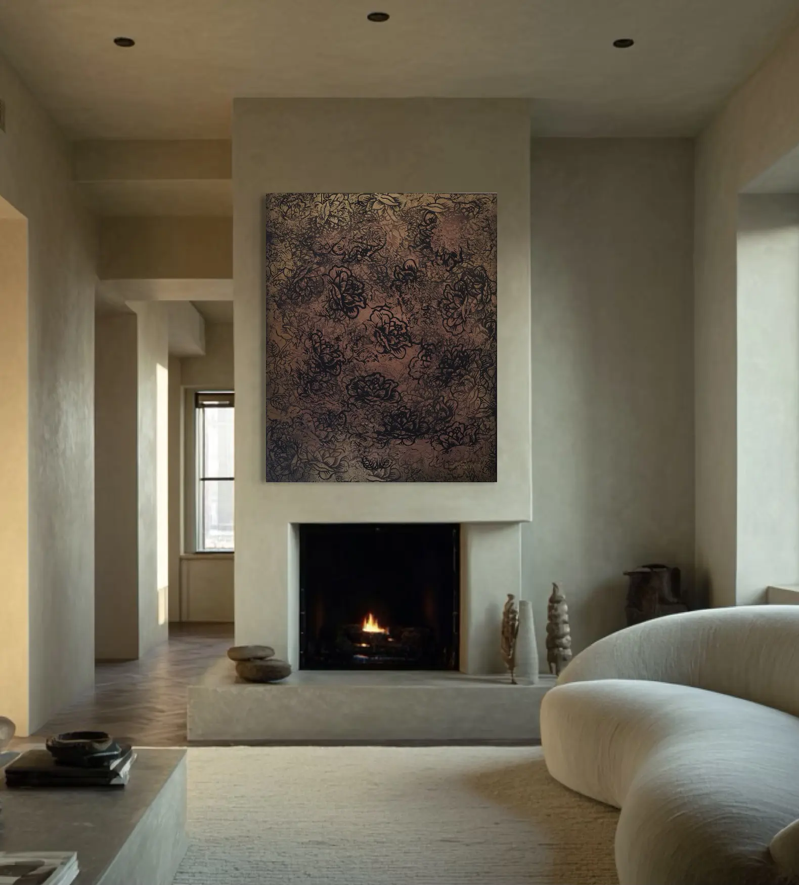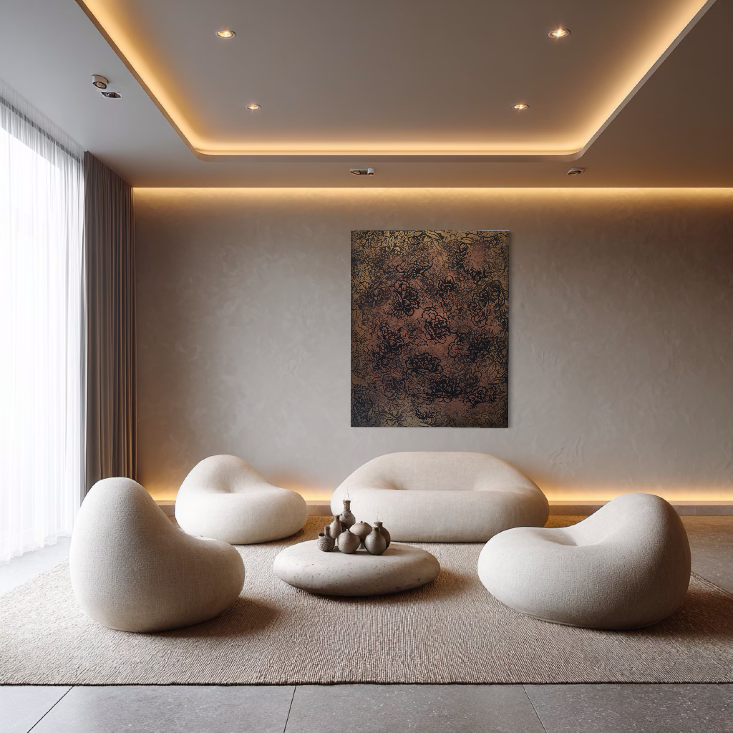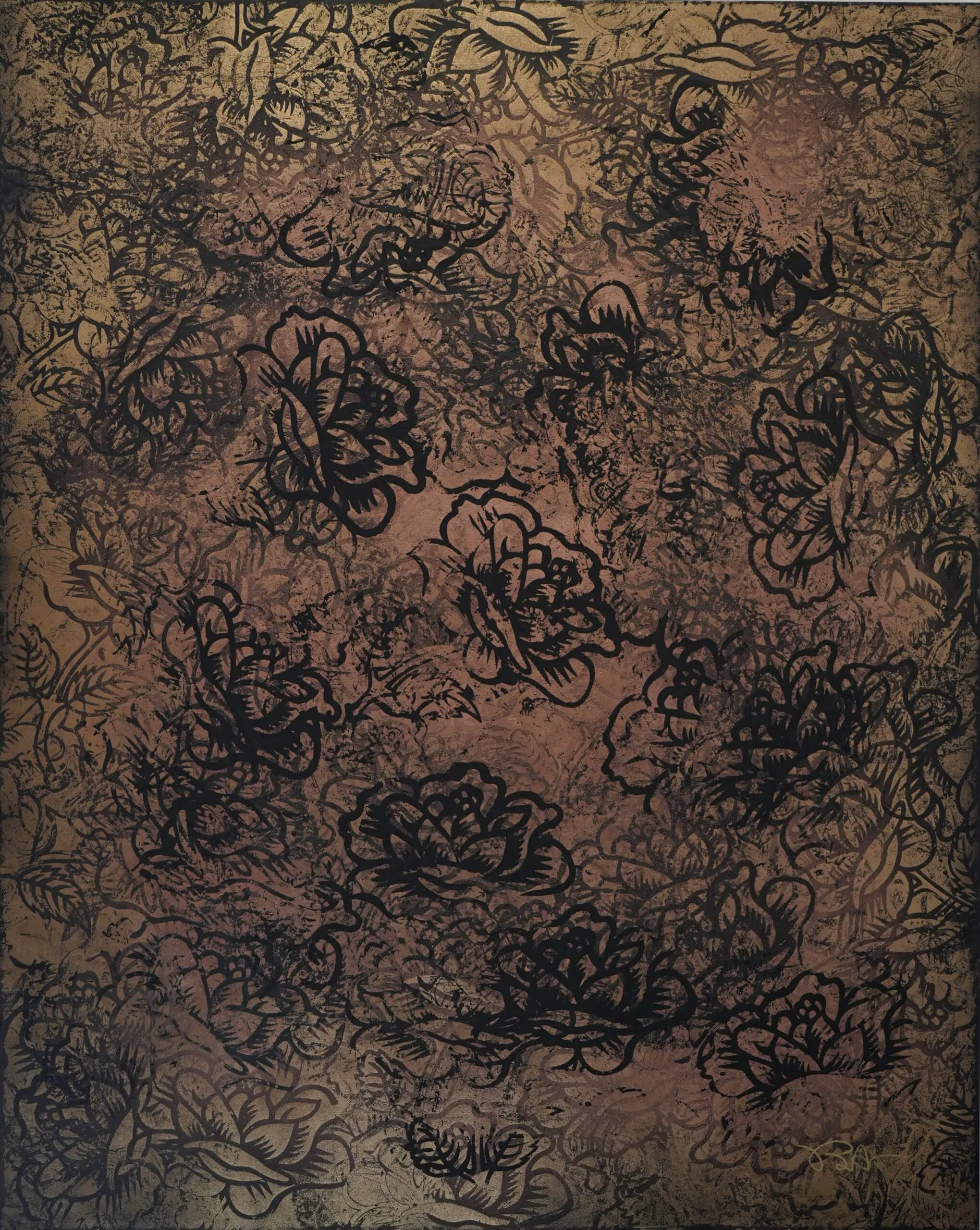 Presented as part of Burton Morris’ solo exhibition Icons in Bloom at MASH Gallery, Jardin d’Or is a monumental work from the artist’s Sea of Roses series, where the single rose expands into a dense and immersive abstract field. Set against a warm golden ground, layers of black floral linework accumulate and dissolve across the surface. The rose, historically associated with romance, beauty, and luxury, is no longer isolated as a singular emblem.
