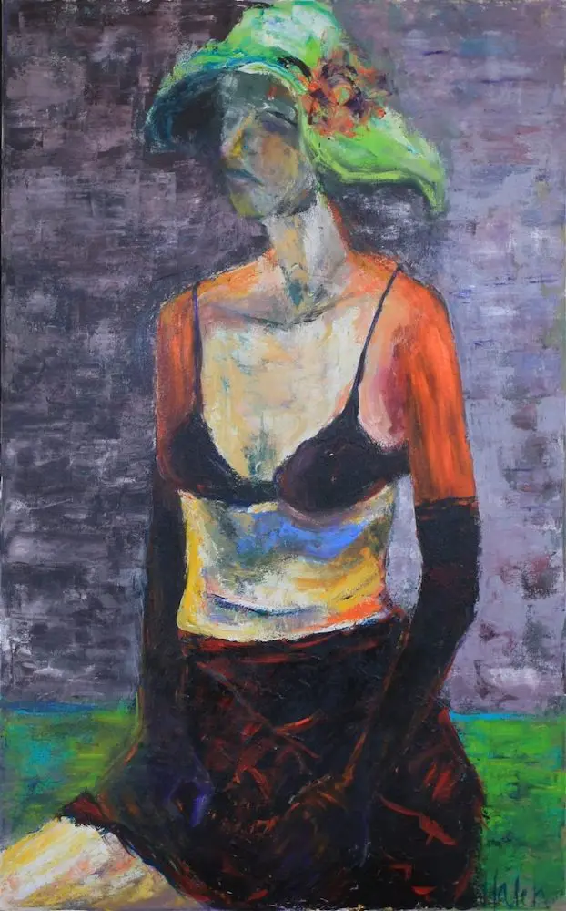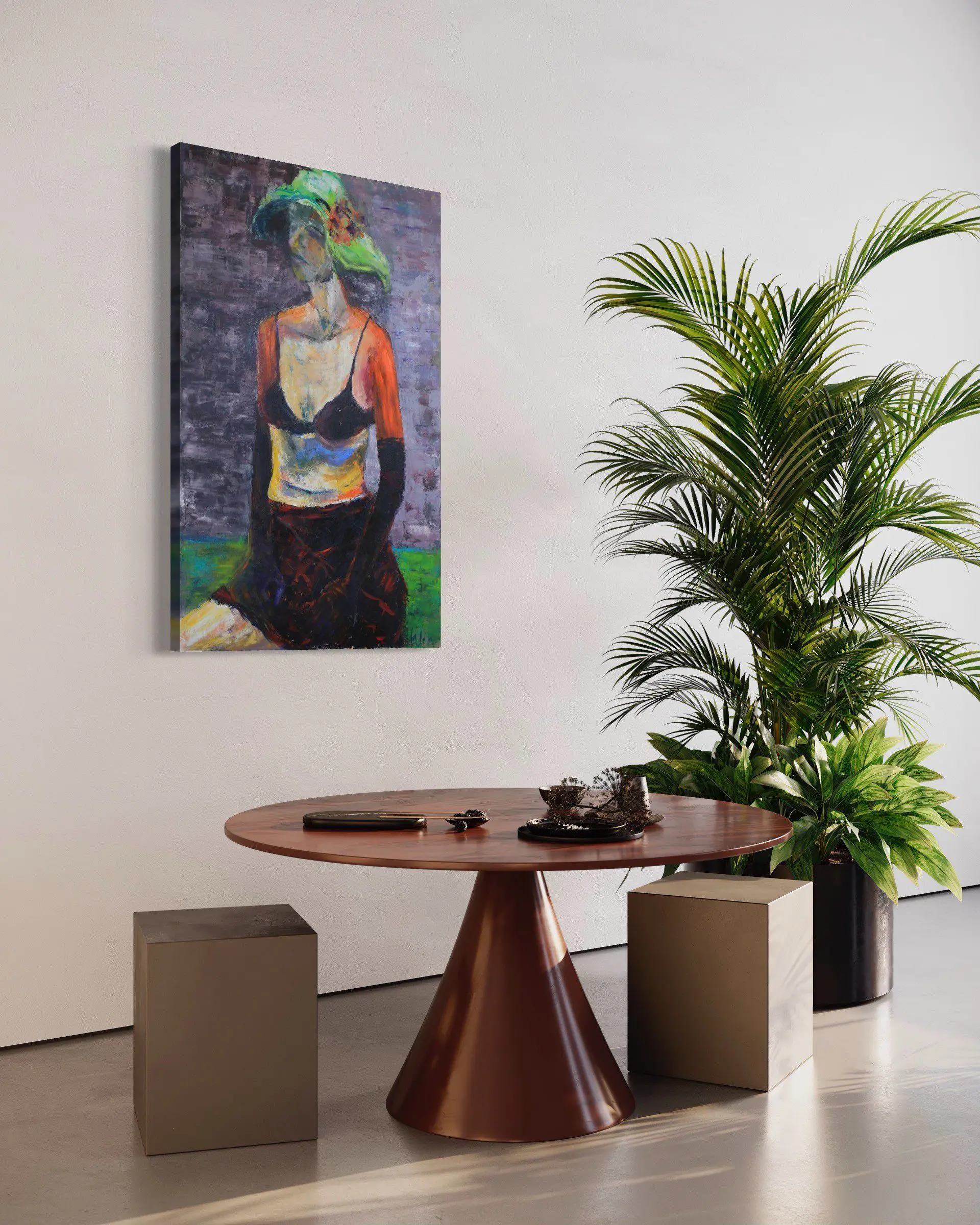 The vivid green hat, adorned with a delicate floral accent, serves as a focal point, standing in stark contrast to the deep, moody hues surrounding it. This interplay of color creates tension—between refinement and mystery, exposure and anonymity. The brushwork, fluid and expressive, gives the figure an almost sculptural quality, recalling the emotional intensity of early 20th-century expressionists like Egon Schiele and Ernst Ludwig Kirchner.