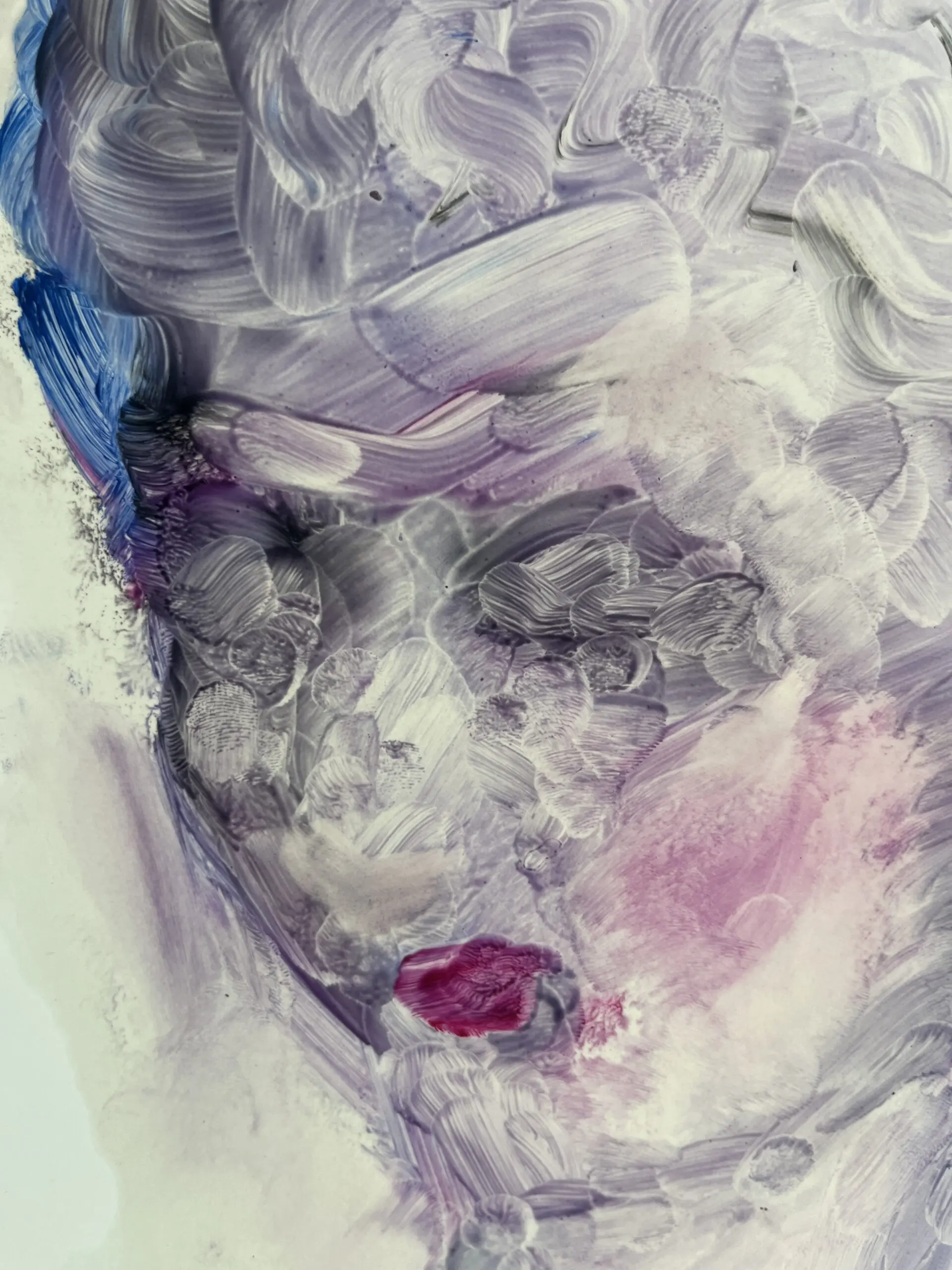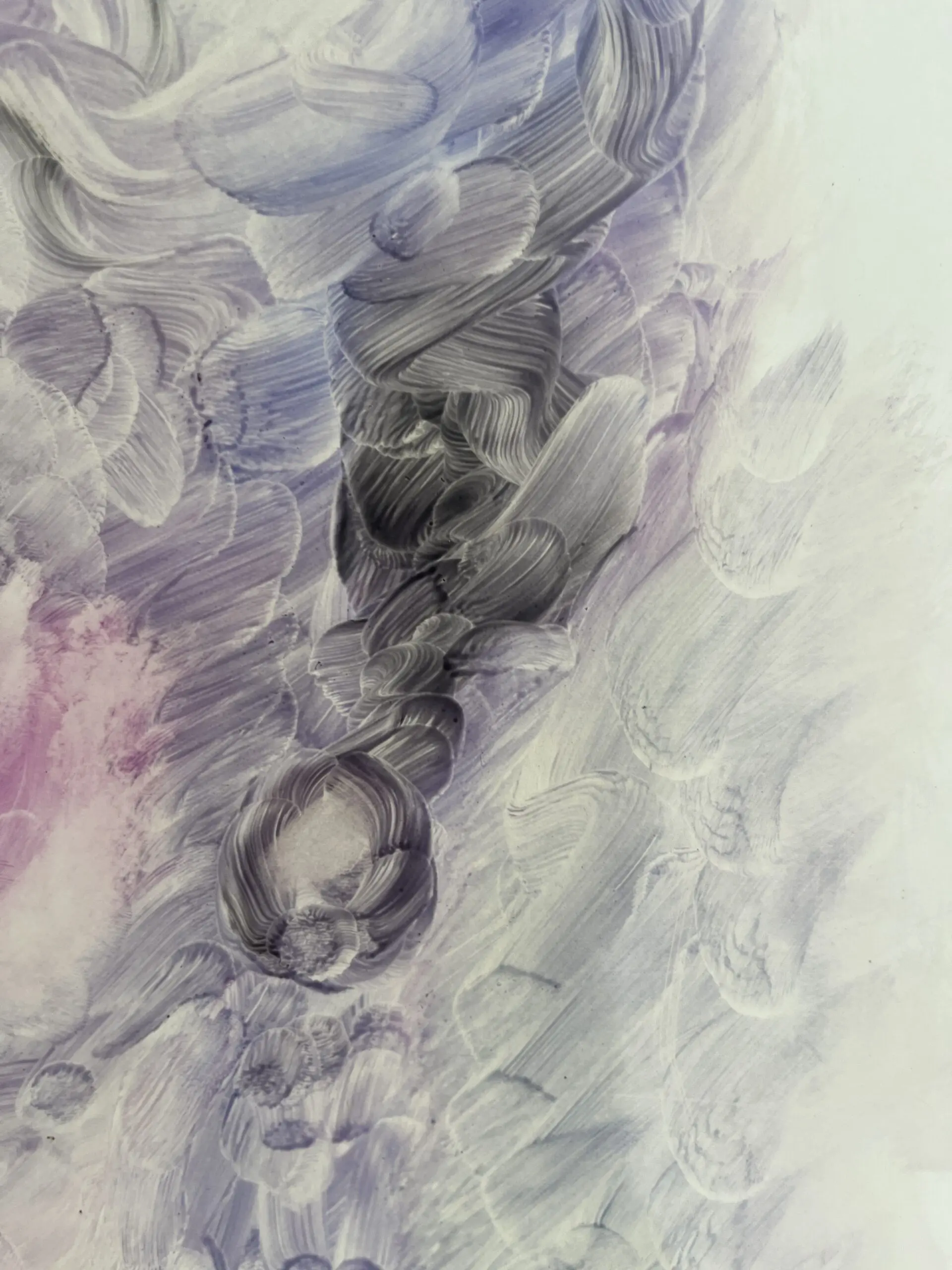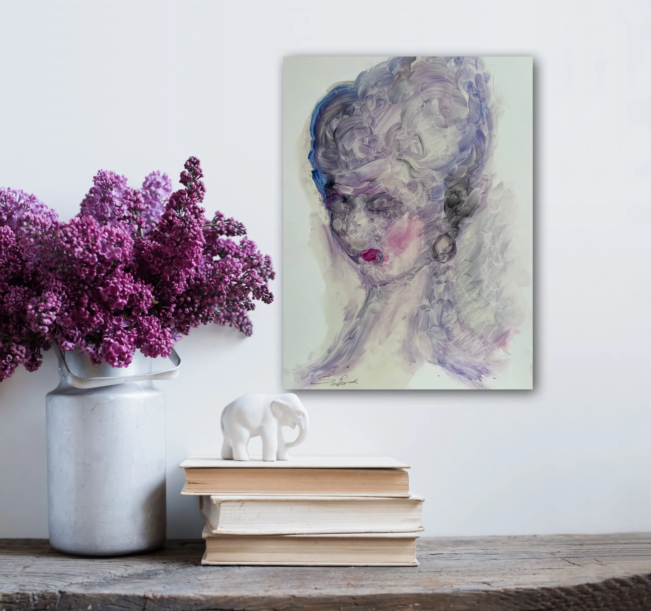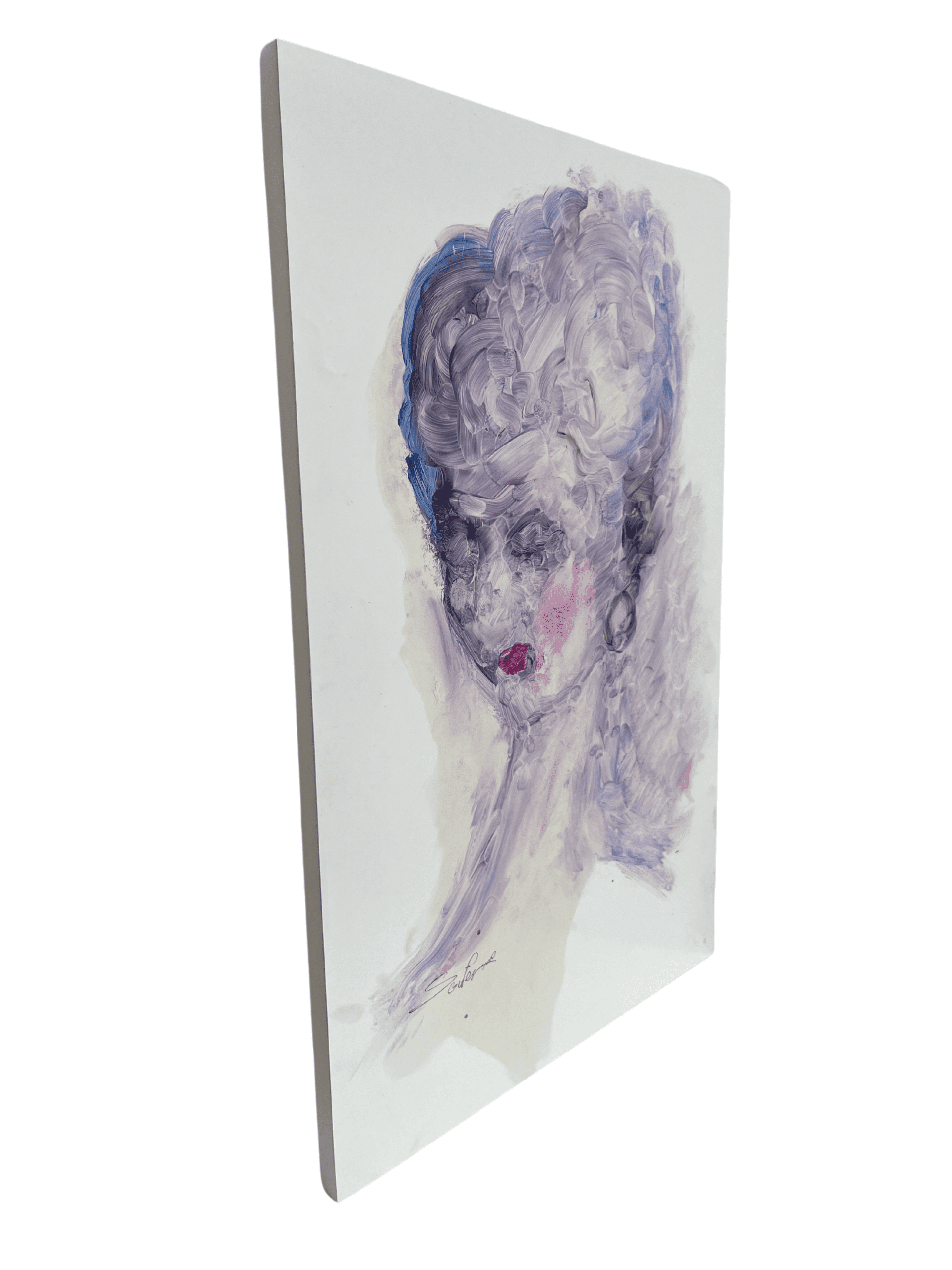 The painting portrays a woman with closed eyes, emanating a sense of peacefulness and tranquility.The gentle hues of lavender blue and pink create a dreamy ambience, inviting viewers to lose themselves in a realm of relaxation and self-reflection.