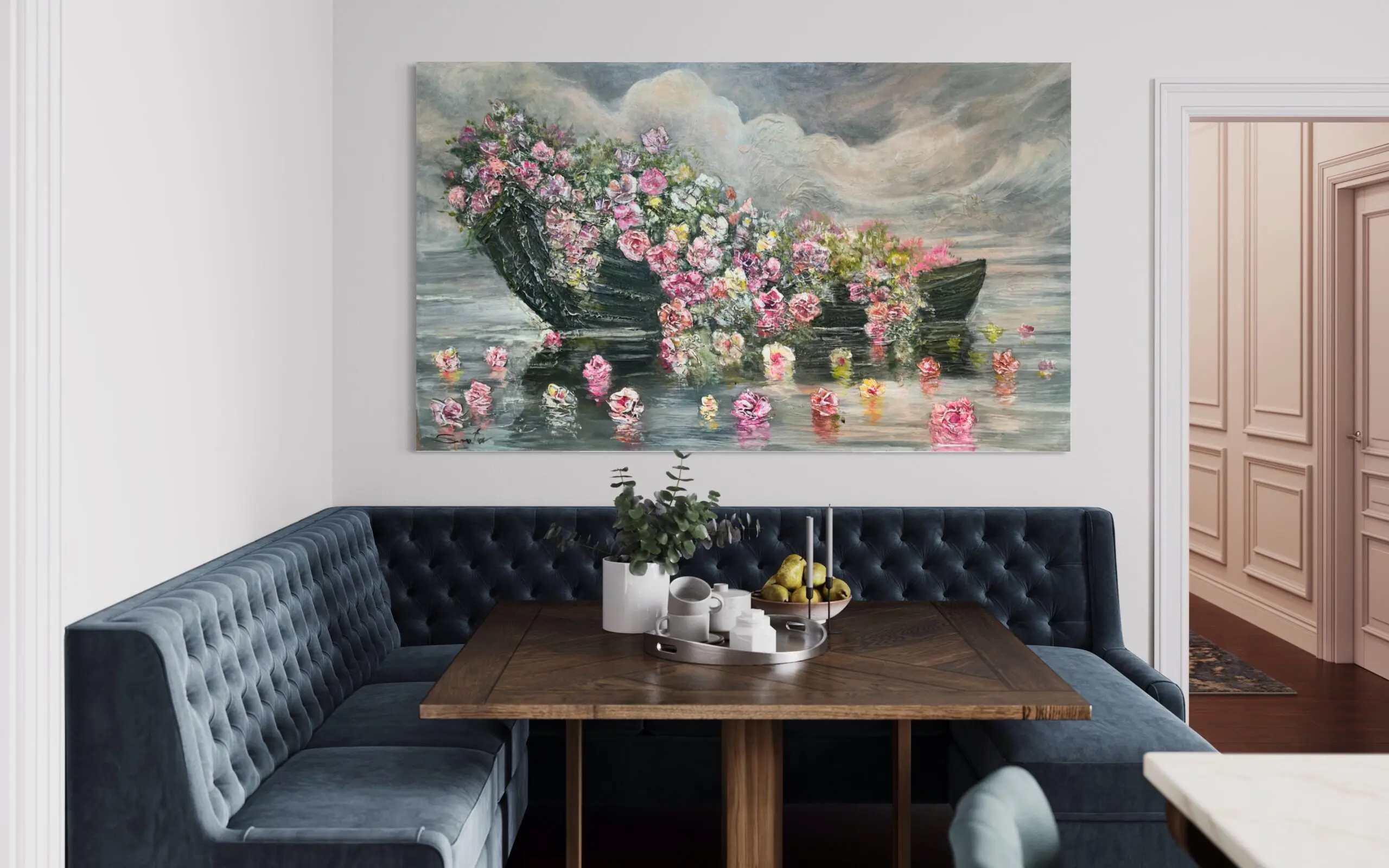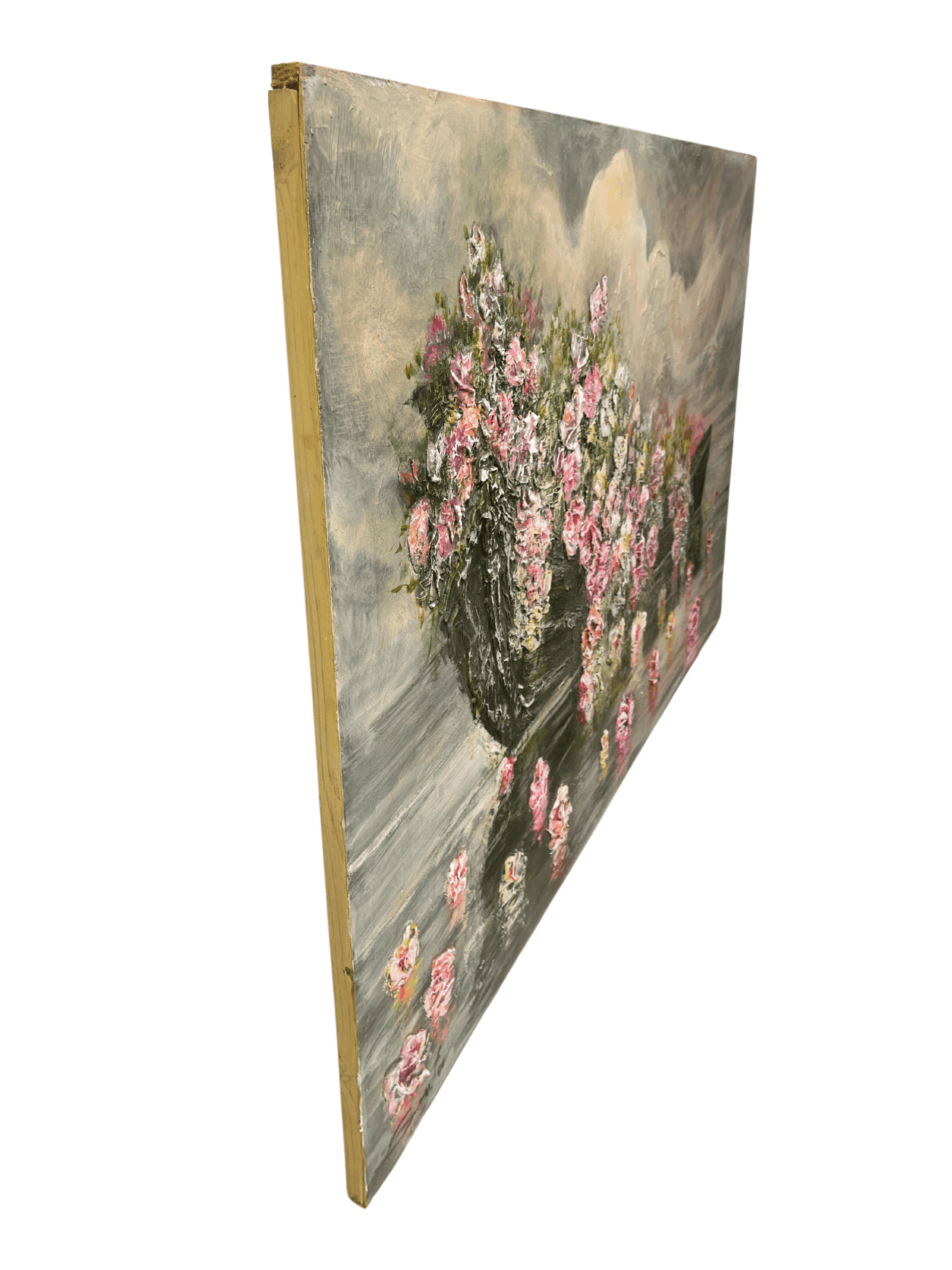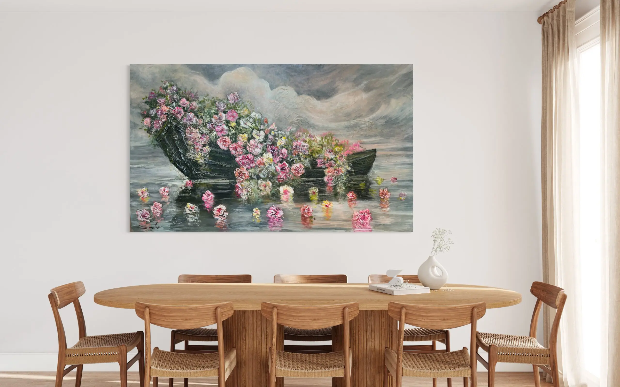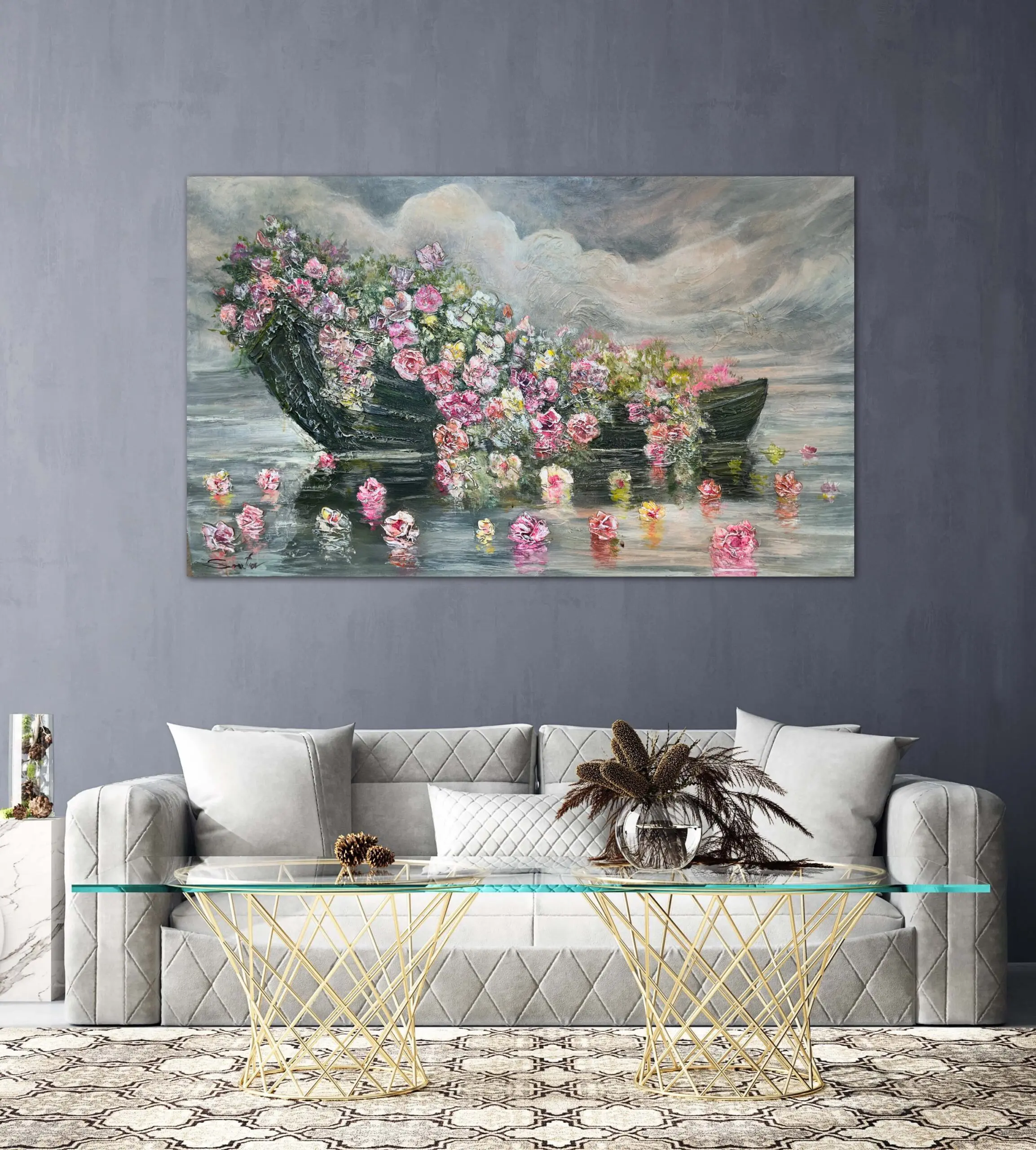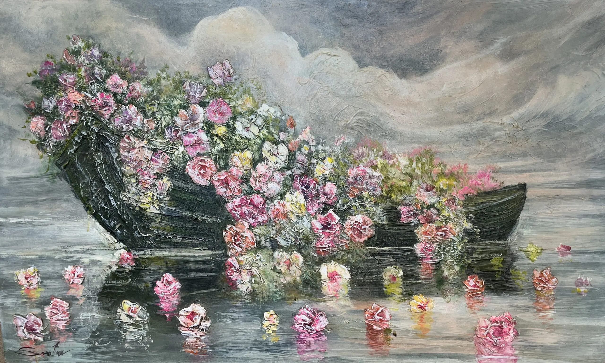 This painting is a masterful blend of realistic and surrealistic elements. The painterly brushwork and textural elements create a sense of abundance and opulence, while the interplay of light and dark adds depth and dimension. The composition depicts a boat on the serene seascape, overflowing with provocative soft and sculptural roses. The background of the painting is characterized by soft, curvy mist and clouds, lending a dreamlike and ethereal quality to the artwork. This juxtaposition of the tumultuous and soft elements in the composition creates an interesting tension, further enhancing the surrealistic nature of the painting.