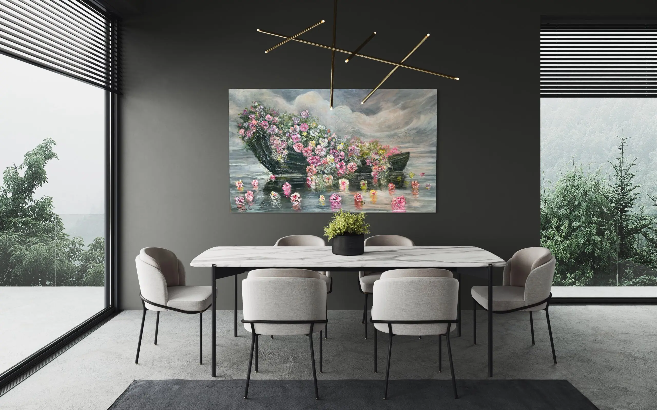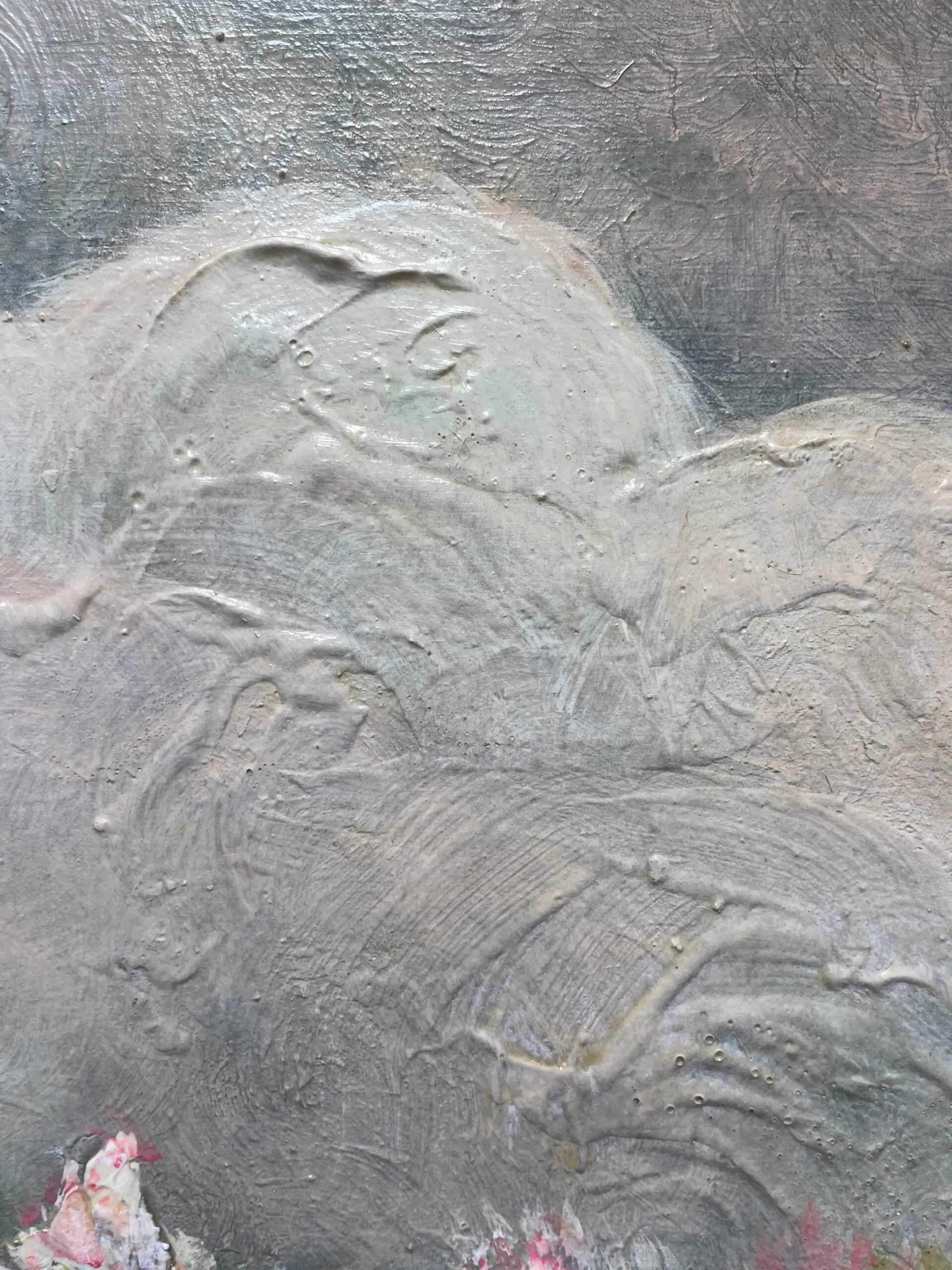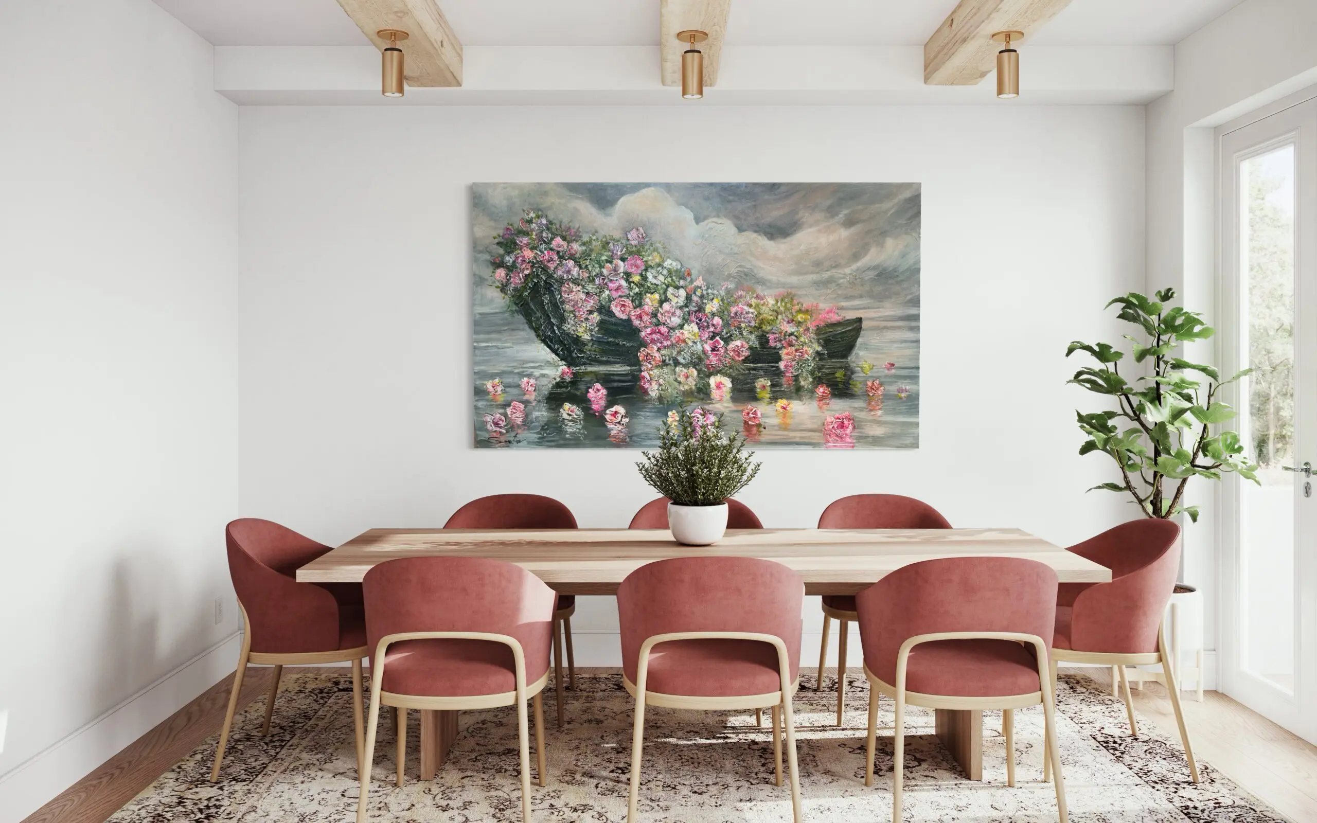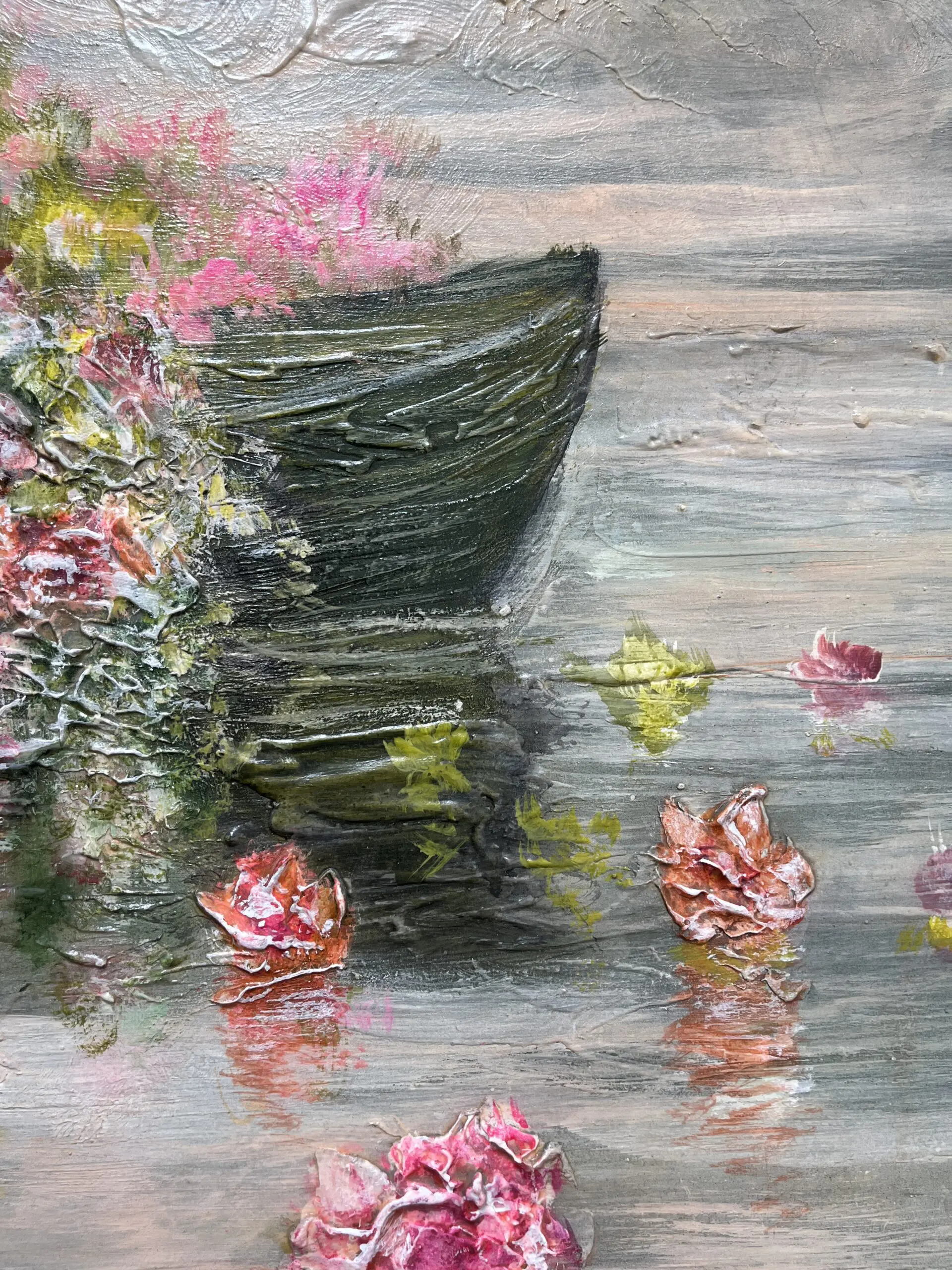 This painting is a masterful blend of realistic and surrealistic elements. The painterly brushwork and textural elements create a sense of abundance and opulence, while the interplay of light and dark adds depth and dimension. The composition depicts a boat on the serene seascape, overflowing with provocative soft and sculptural roses. The background of the painting is characterized by soft, curvy mist and clouds, lending a dreamlike and ethereal quality to the artwork. This juxtaposition of the tumultuous and soft elements in the composition creates an interesting tension, further enhancing the surrealistic nature of the painting.