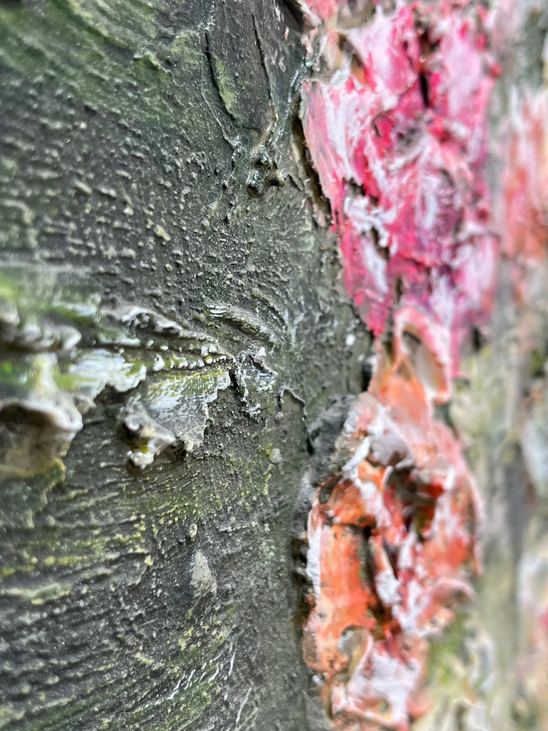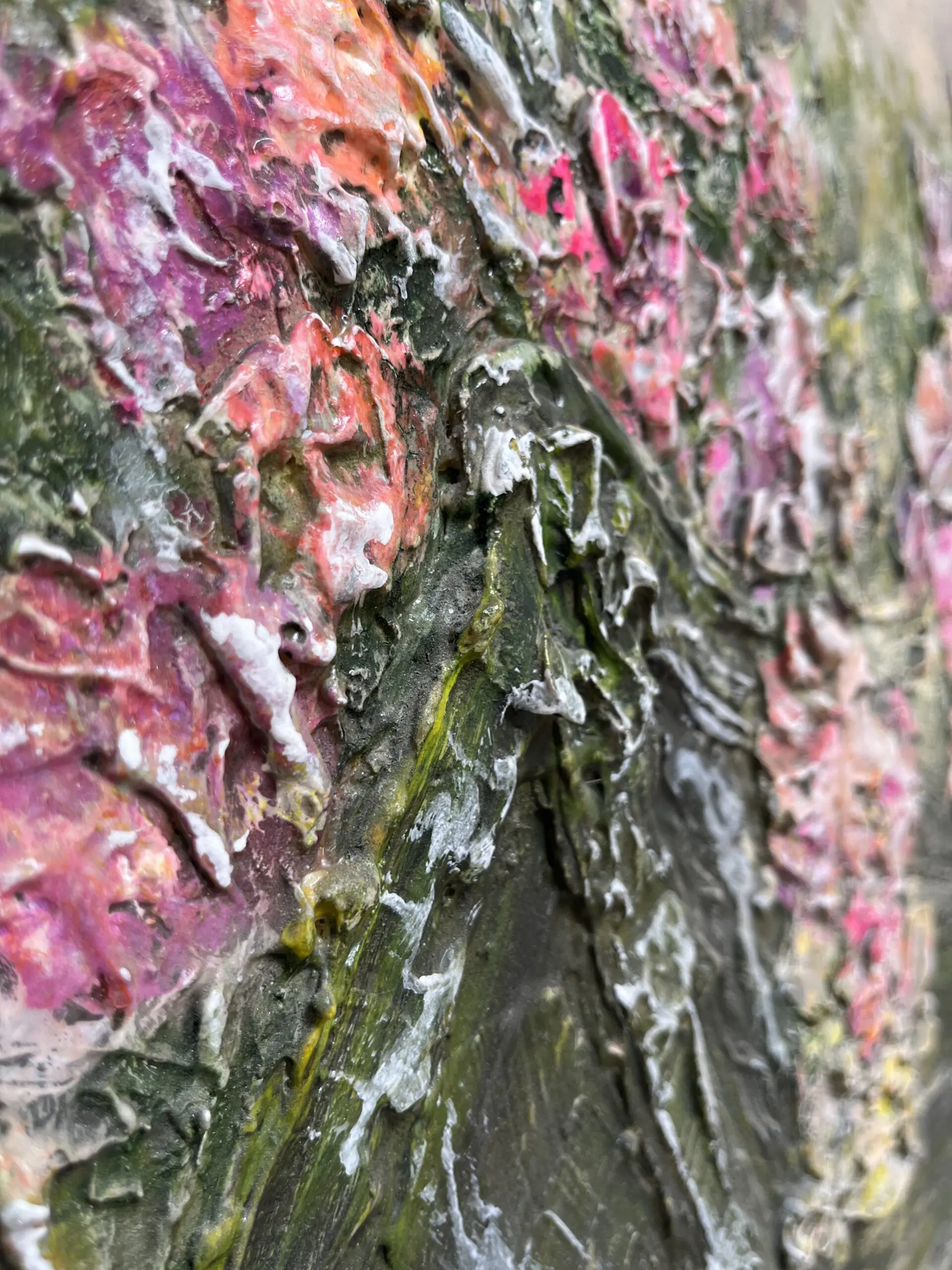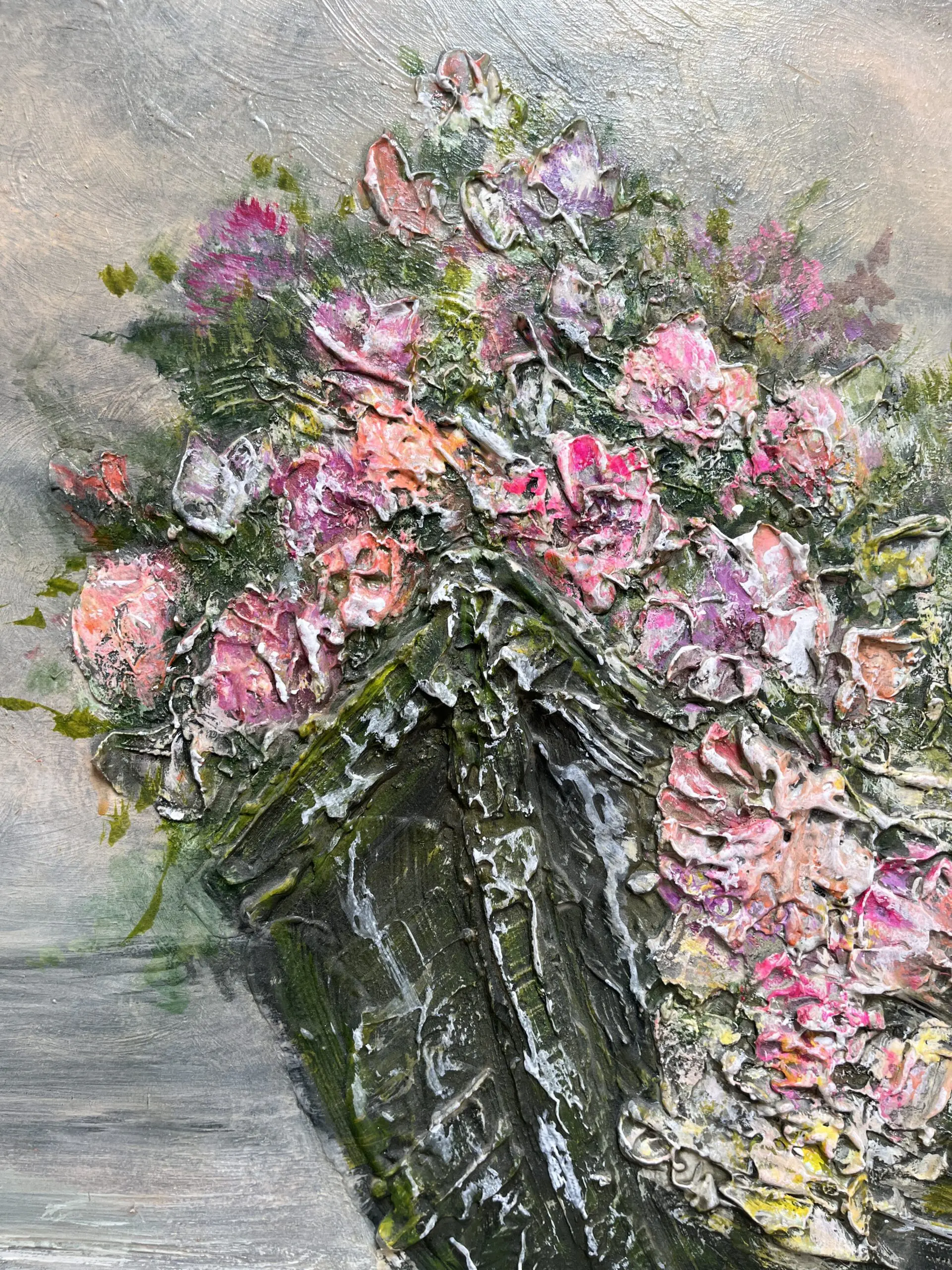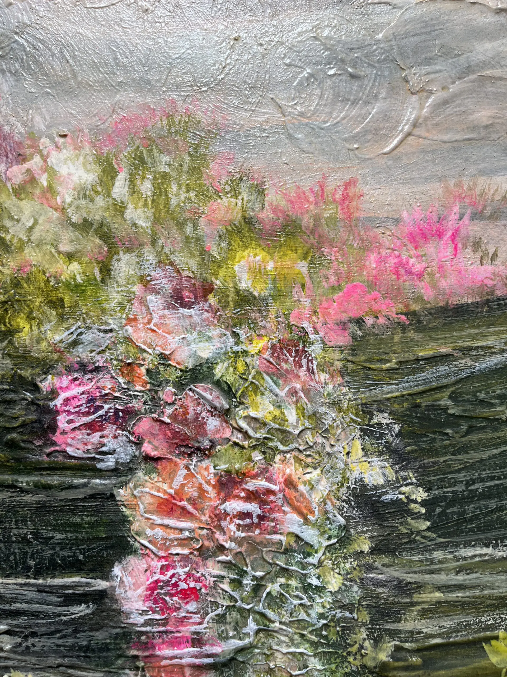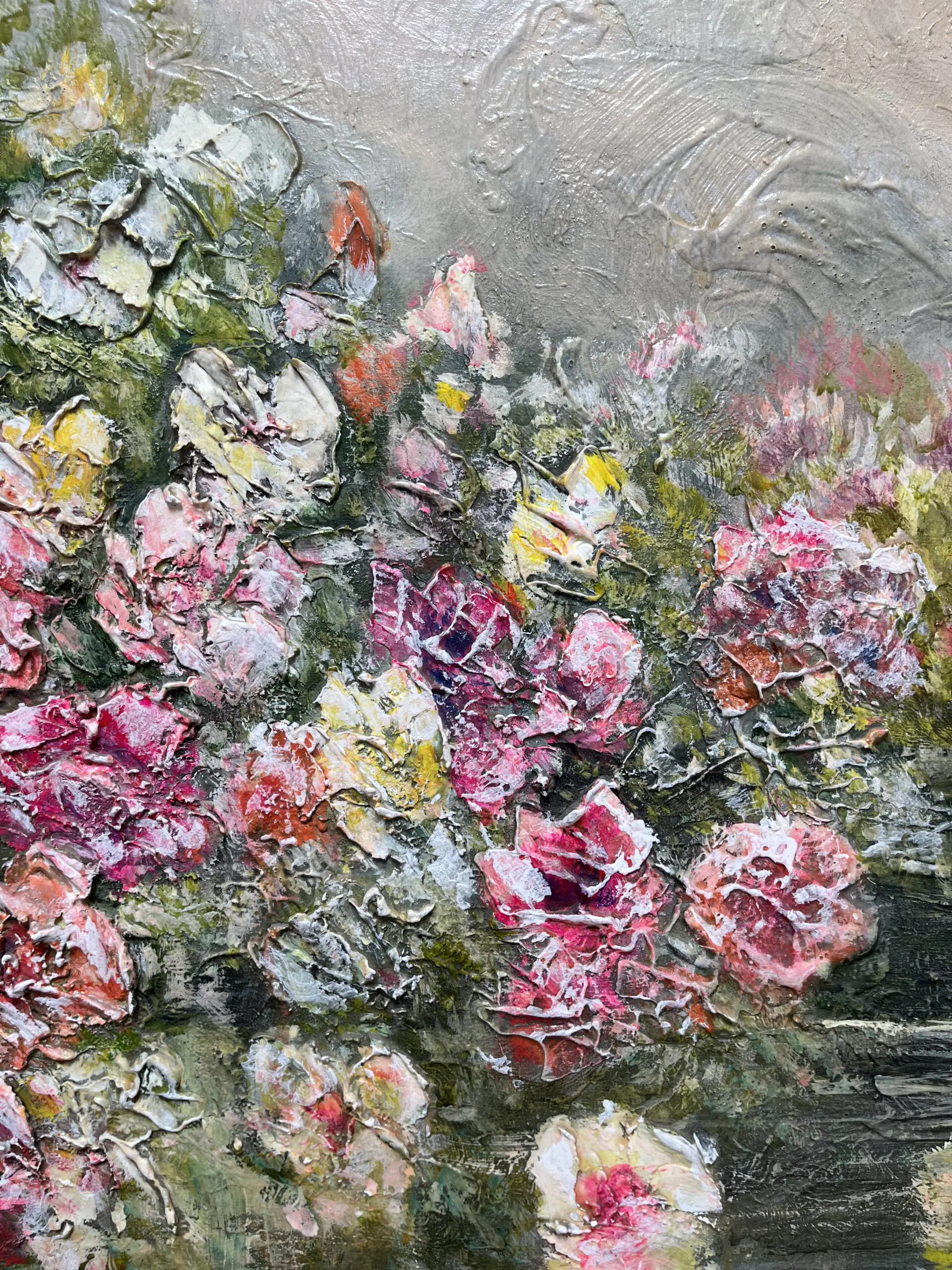 This painting is a masterful blend of realistic and surrealistic elements. The painterly brushwork and textural elements create a sense of abundance and opulence, while the interplay of light and dark adds depth and dimension. The composition depicts a boat on the serene seascape, overflowing with provocative soft and sculptural roses. The background of the painting is characterized by soft, curvy mist and clouds, lending a dreamlike and ethereal quality to the artwork. This juxtaposition of the tumultuous and soft elements in the composition creates an interesting tension, further enhancing the surrealistic nature of the painting.