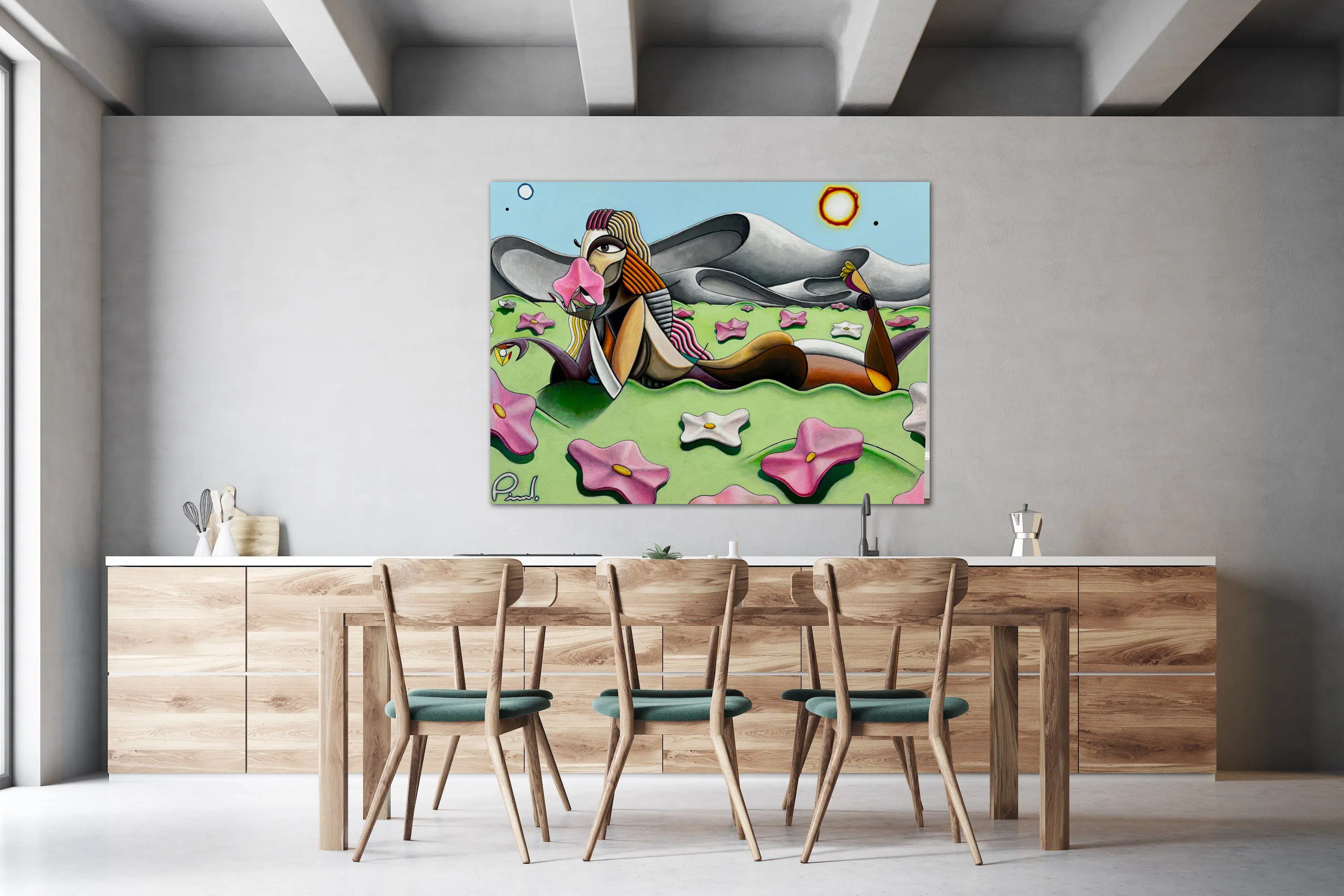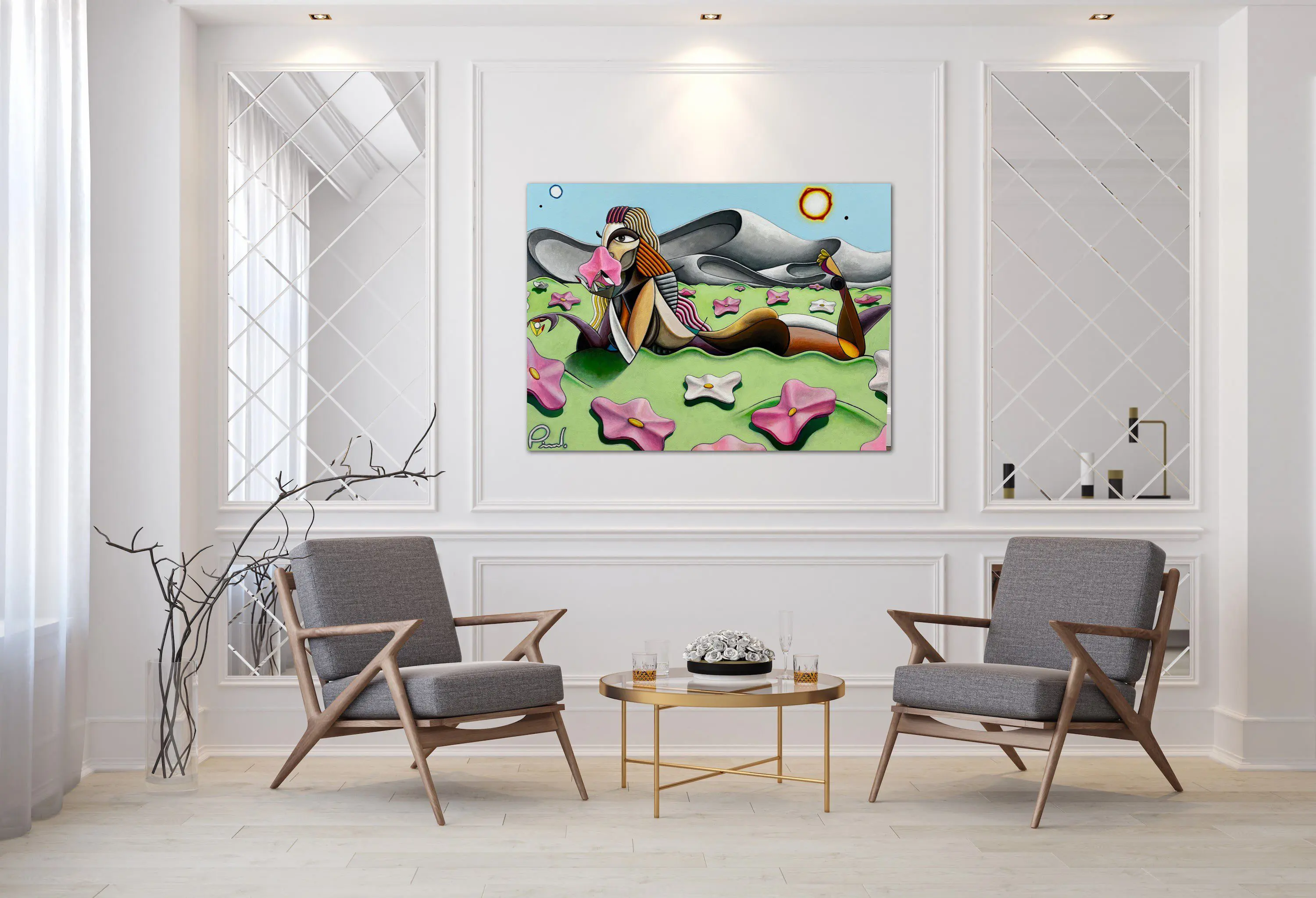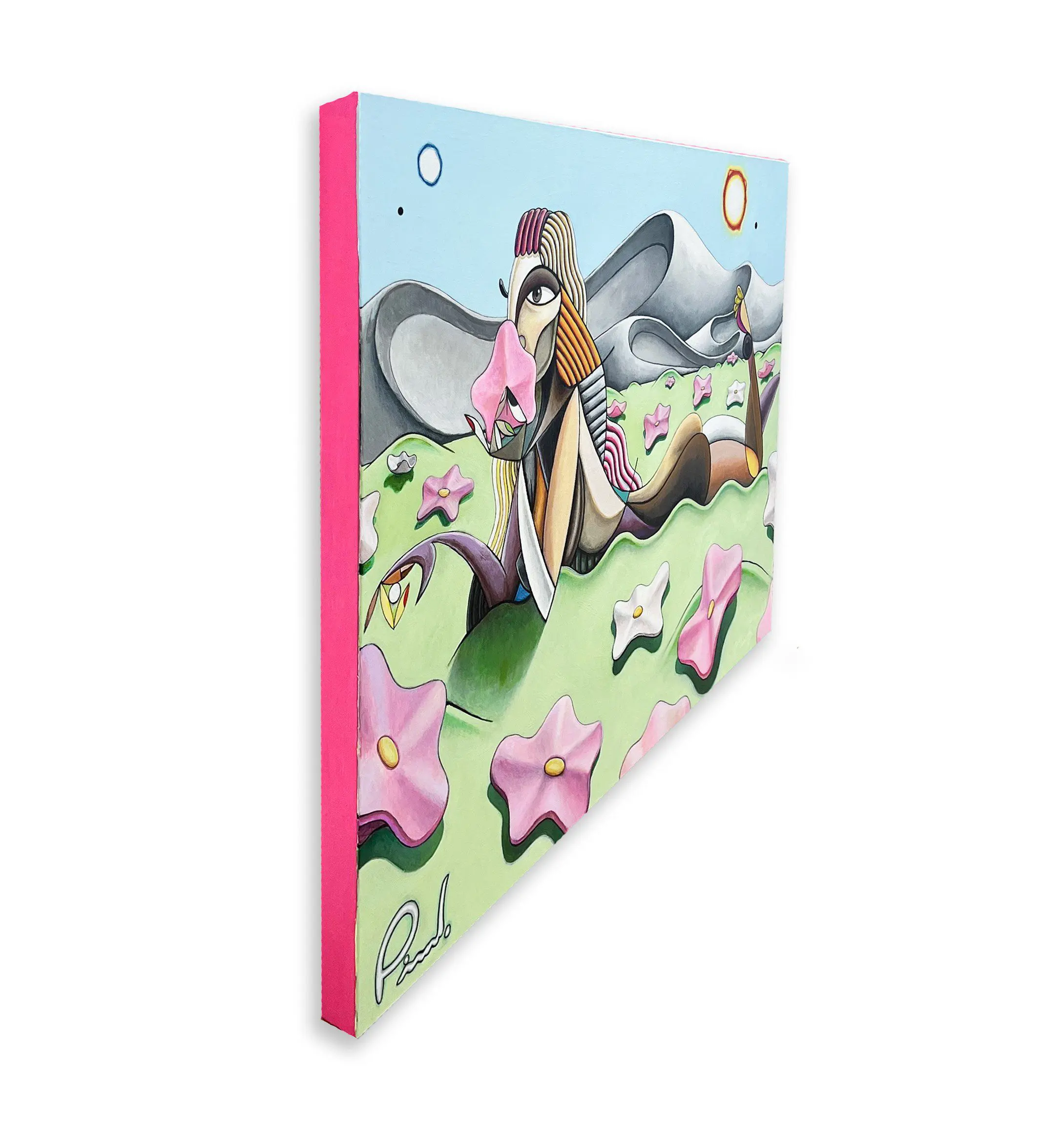 This horizontal 36 inch high and 48 inch wide cubist figurative painting is stretched and ready to hang. The sides are painted hot pink and it does not require framing. It is hand signed by the artist in the bottom left corner and on the back.