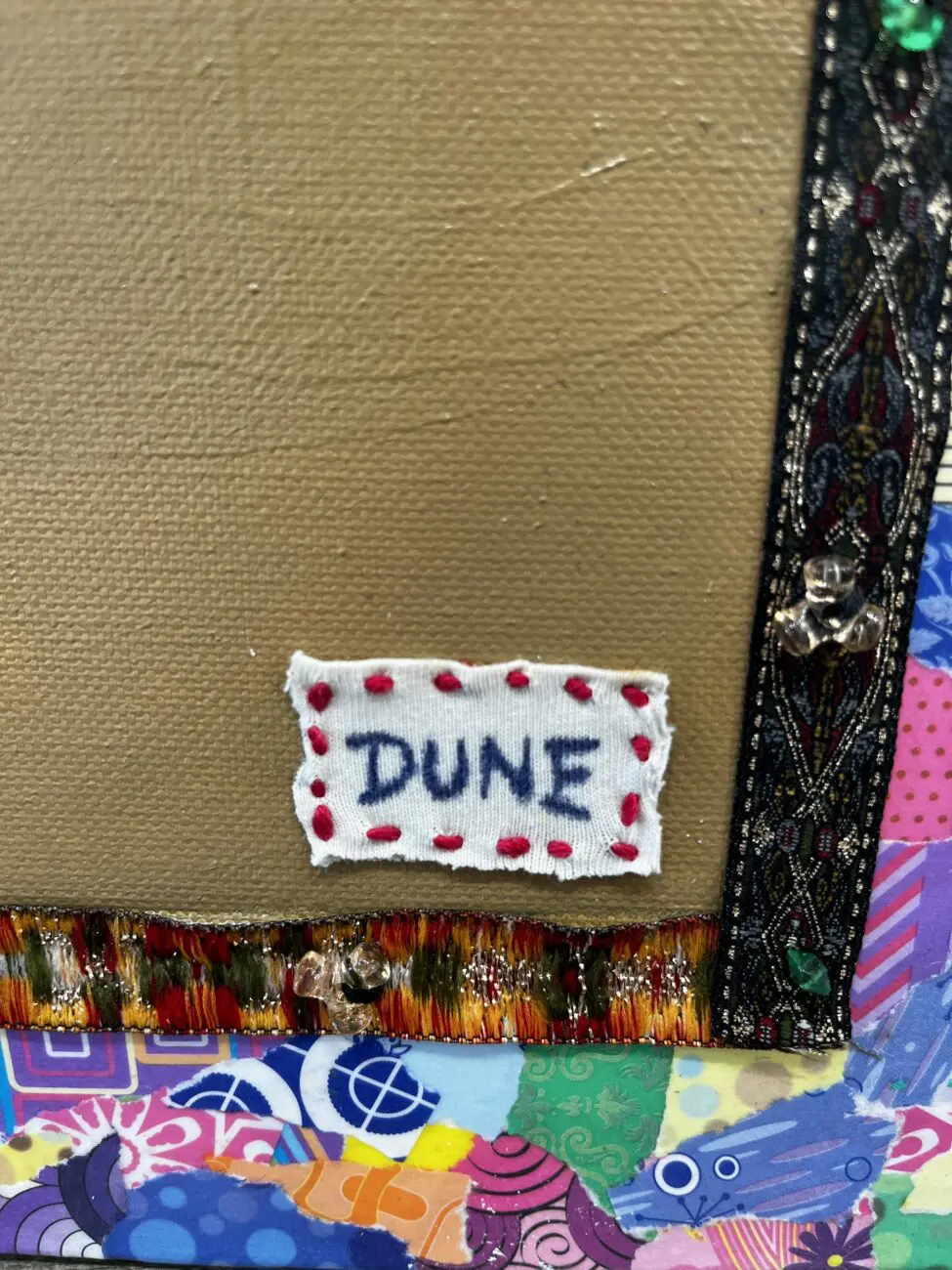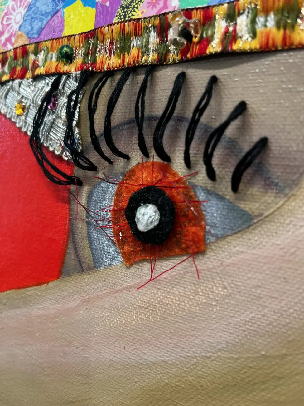 Every meticulous detail is made evident upon close inspection of this work. The artist chose to incorporate colorful and playful elements such as beads, fabric, acrylic, and wood, showing her unwavering dedication to the work.
