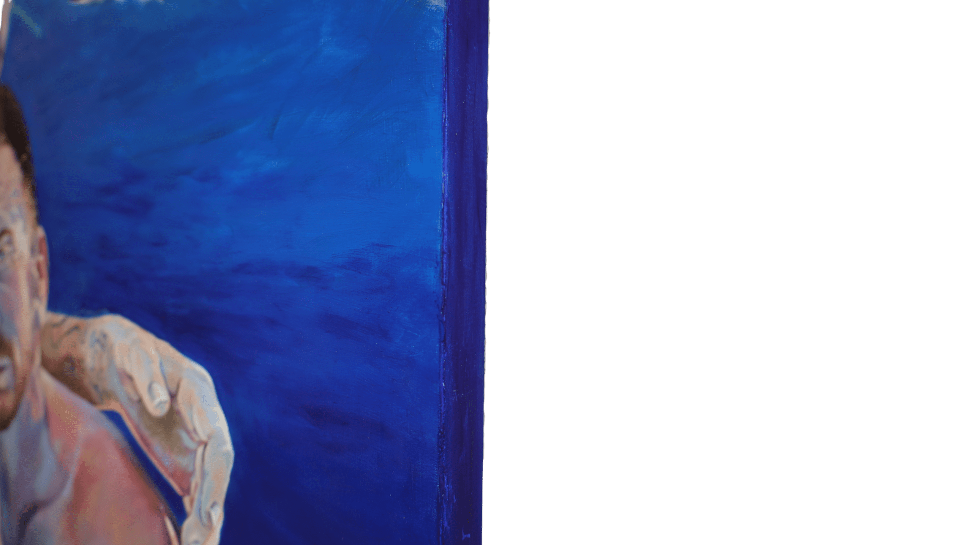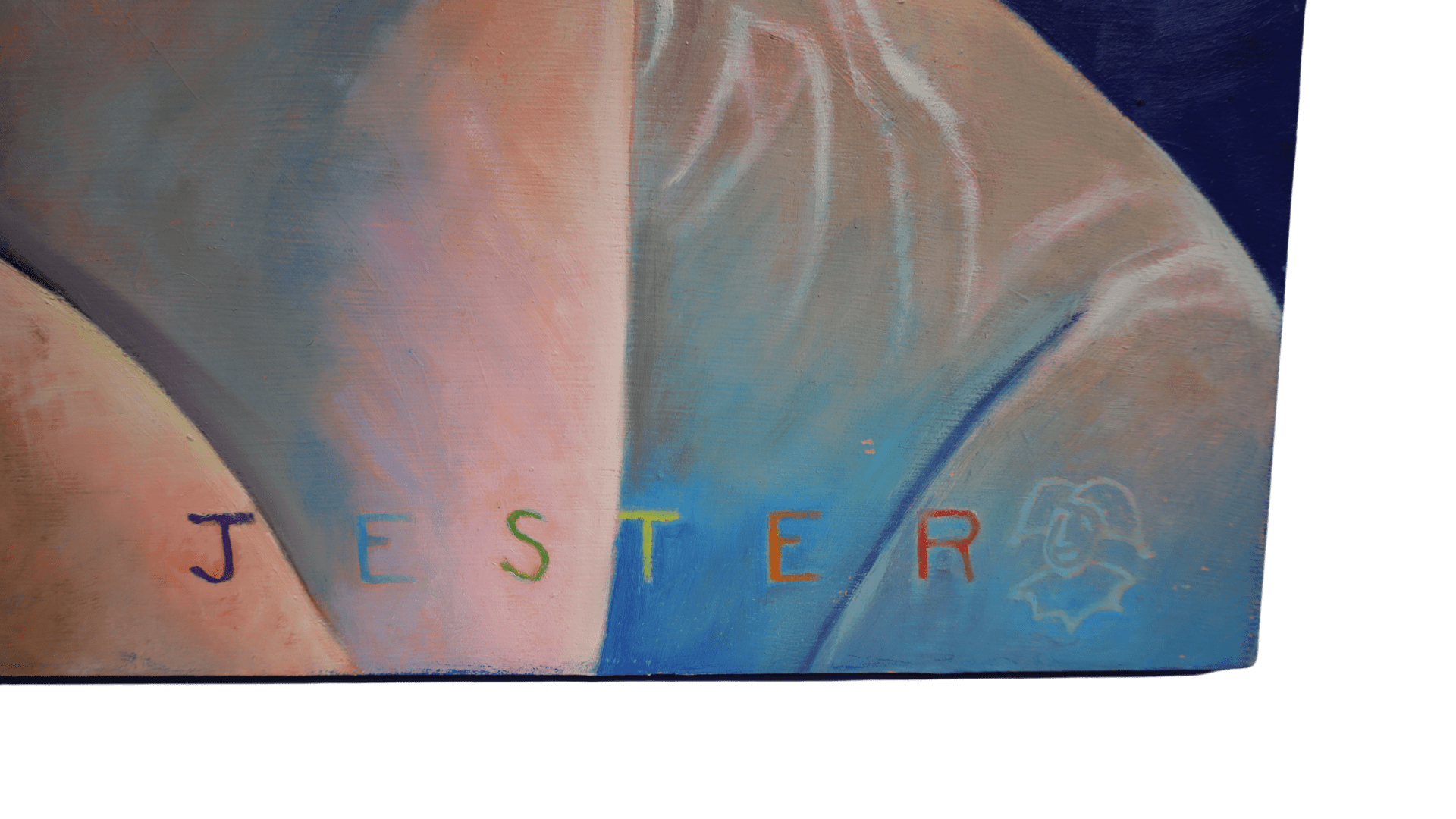Jester’s technique masterfully balances hyperrealism with subtle abstraction, using the distortion of water to explore themes of identity and perception. The tattoos, intricate and varied, serve as personal narratives etched into the subjects’ skin, each one telling a story of individuality and self-expression. The tender, protective posture of the embrace speaks volumes without words, presenting love as both a sanctuary and a bold statement of visibility. The contrast between the serene blues of the background and the warm, flesh-toned figures draws the viewer’s focus to the emotion radiating from their gaze and gesture.