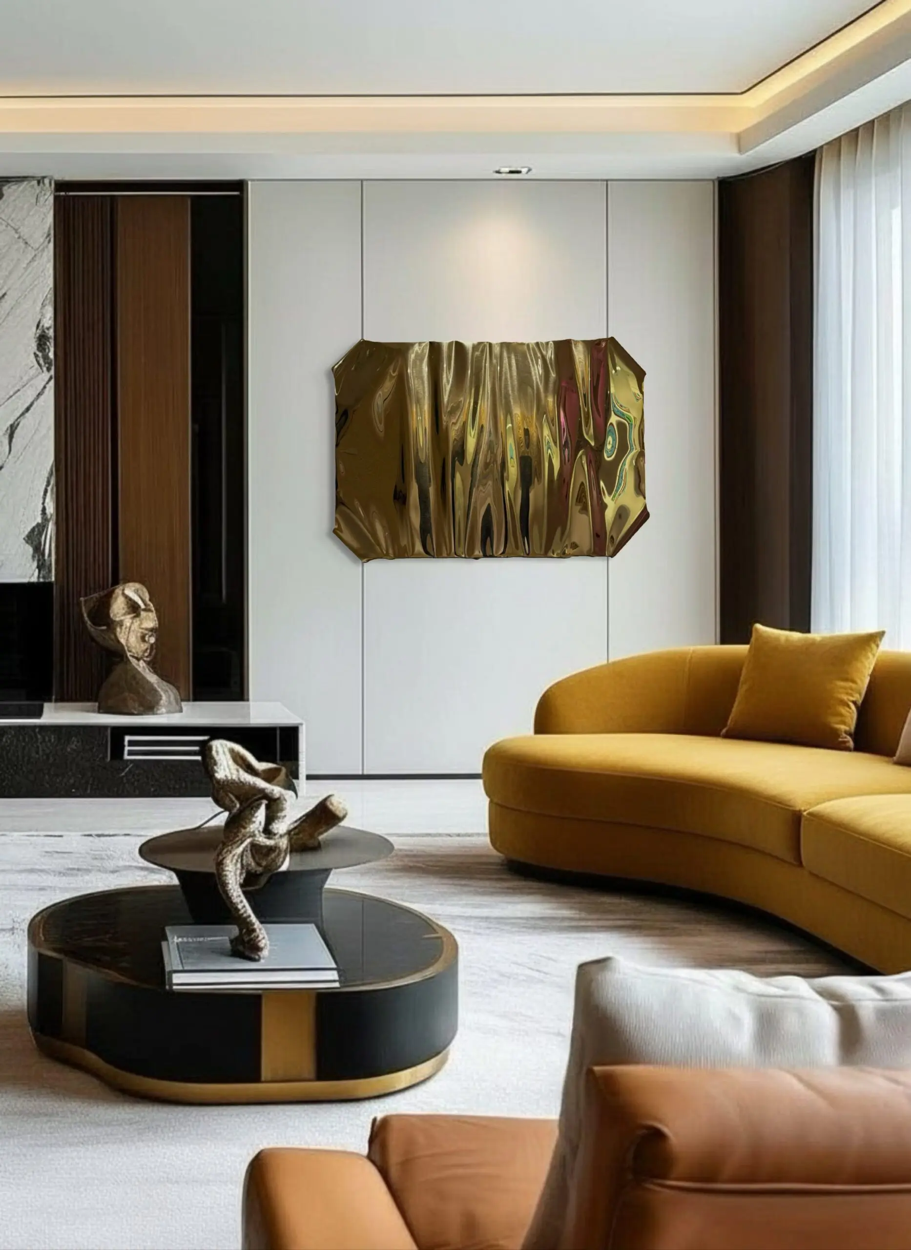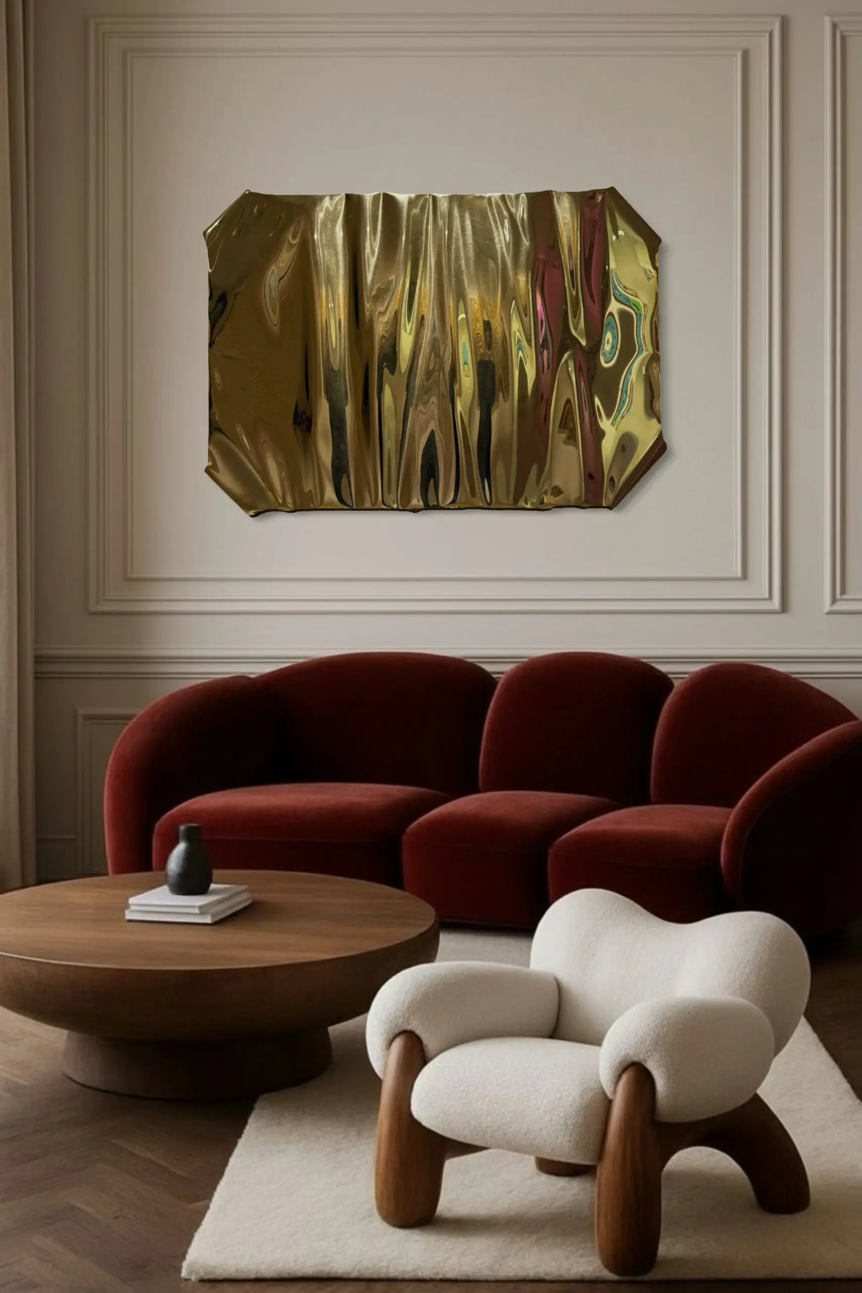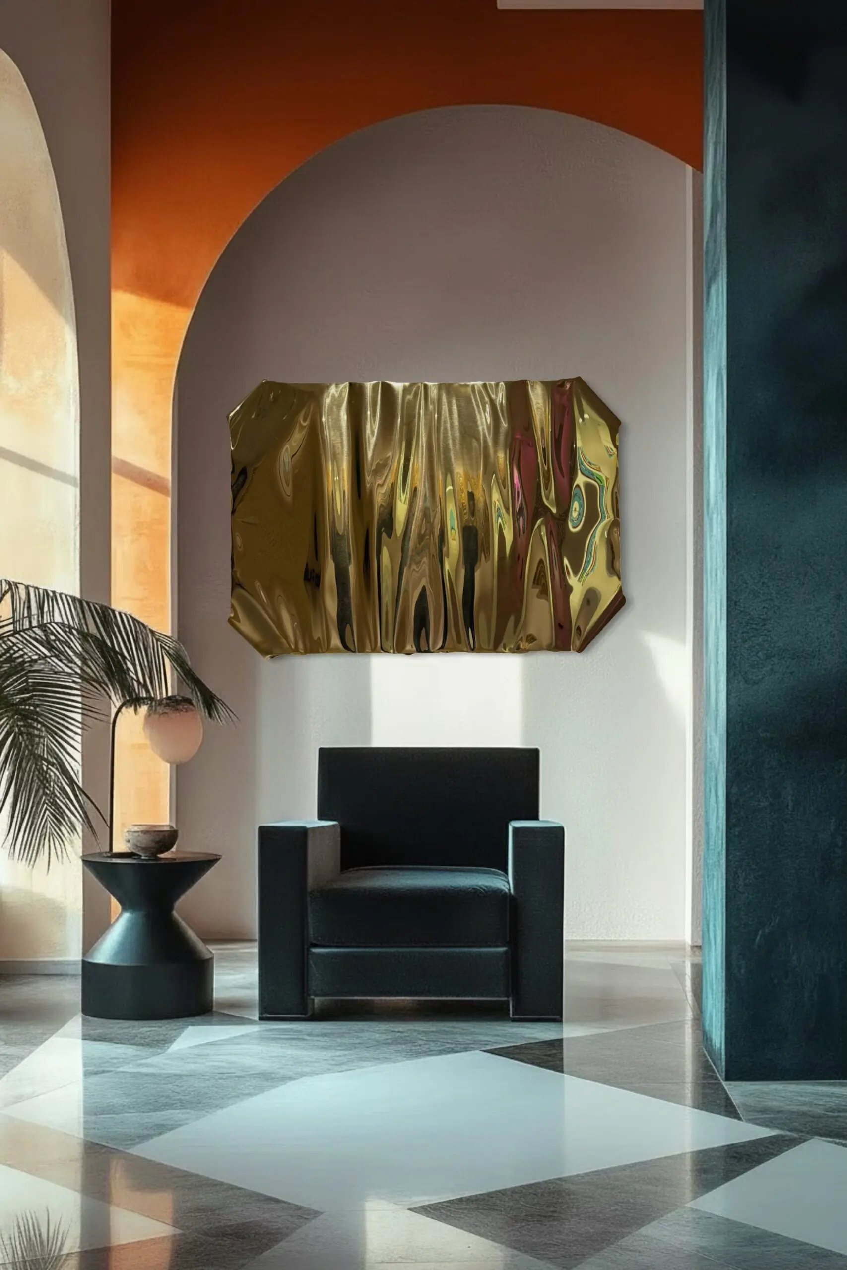 Lucid Sculpture by Piers Henry transforms the perception of materiality, presenting metal as fluid, responsive, and in motion. The highly polished gold surface is shaped into soft, undulating folds that appear draped. What is traditionally rigid reads as supple, creating a form that appears to shift and breathe before the viewer’s eyes.
