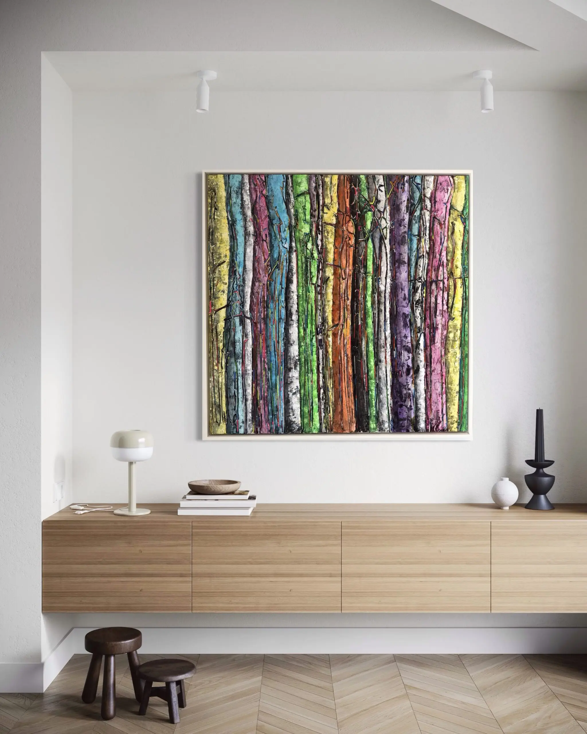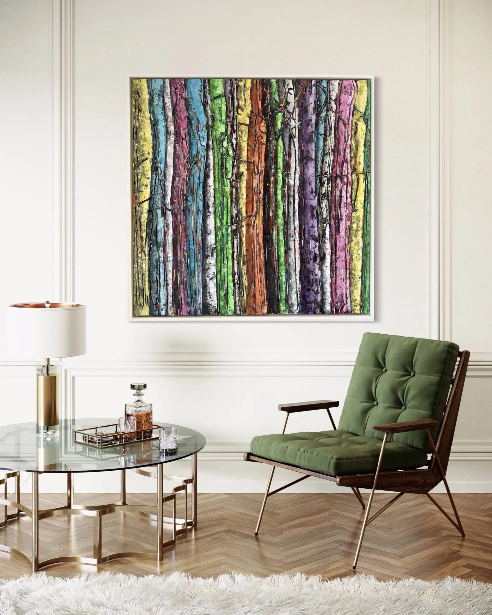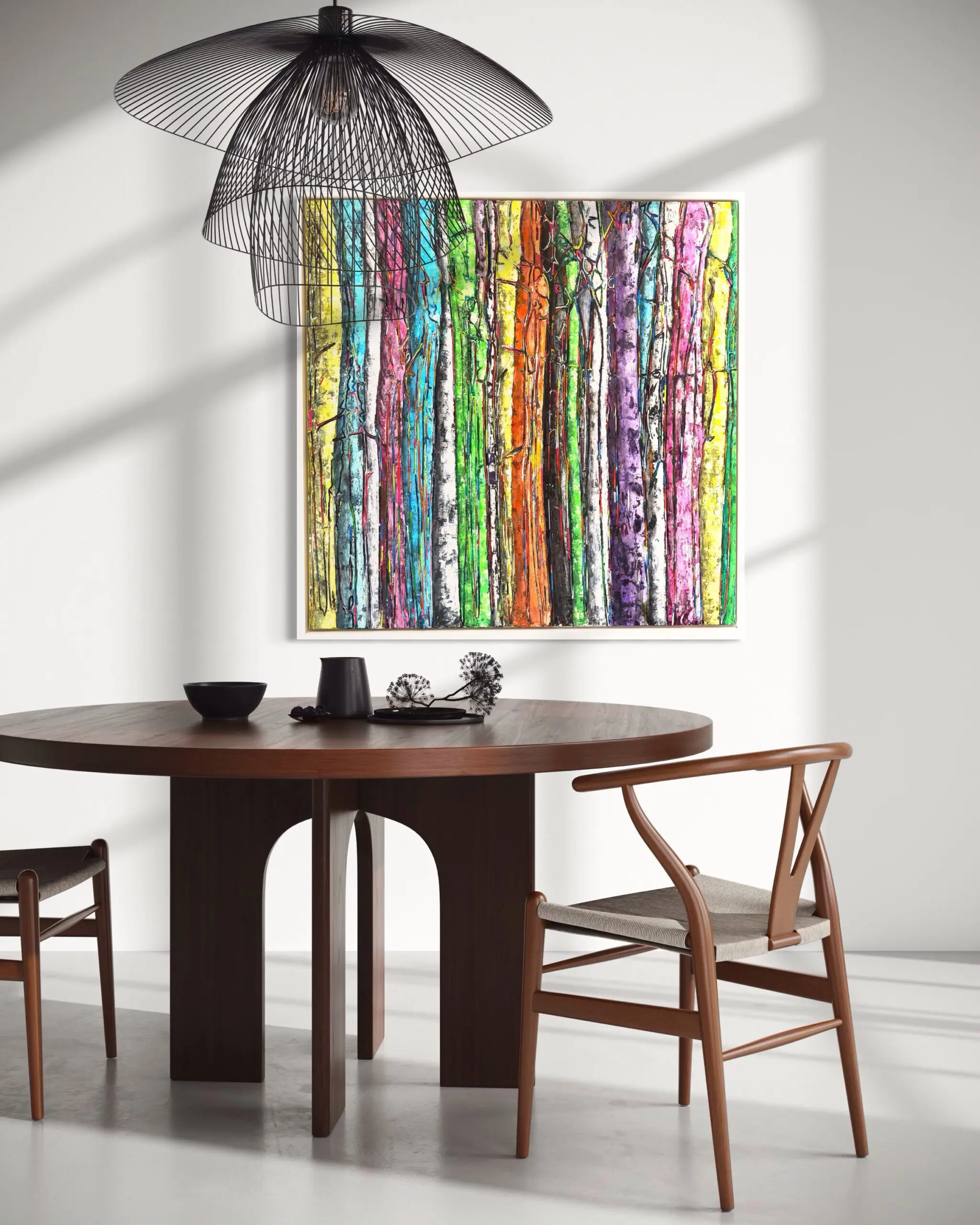 Carved directly into wood, Mashian transforms the forest into a radiant field of color, rhythm, and movement. The composition carries a sculptural presence, with vertical trunks rising in vivid hues of orange, green, yellow, purple, silver, and pink. The carved outlines and layered pigments create an organic sense of connection, as if each tree is part of a larger dance of nature.