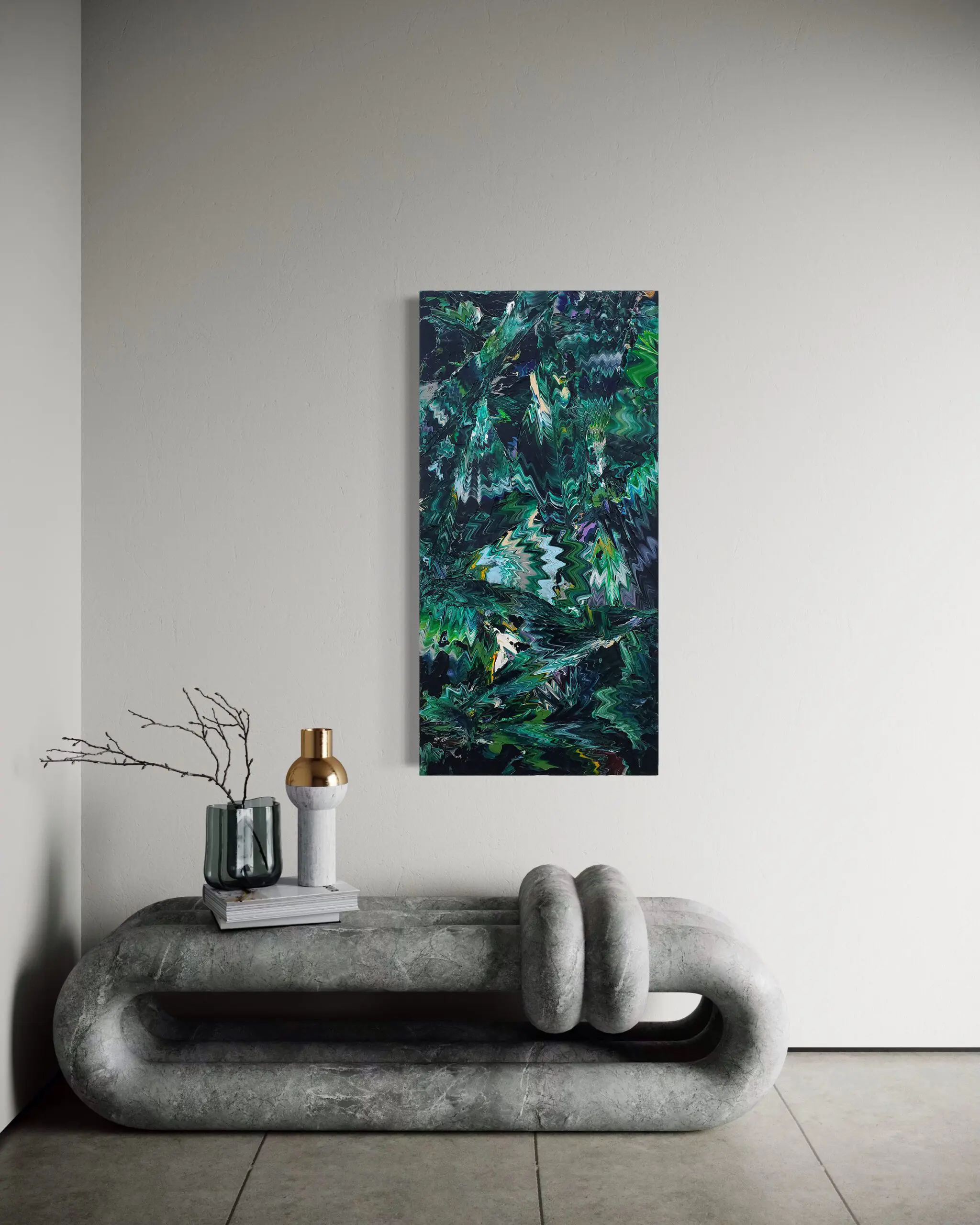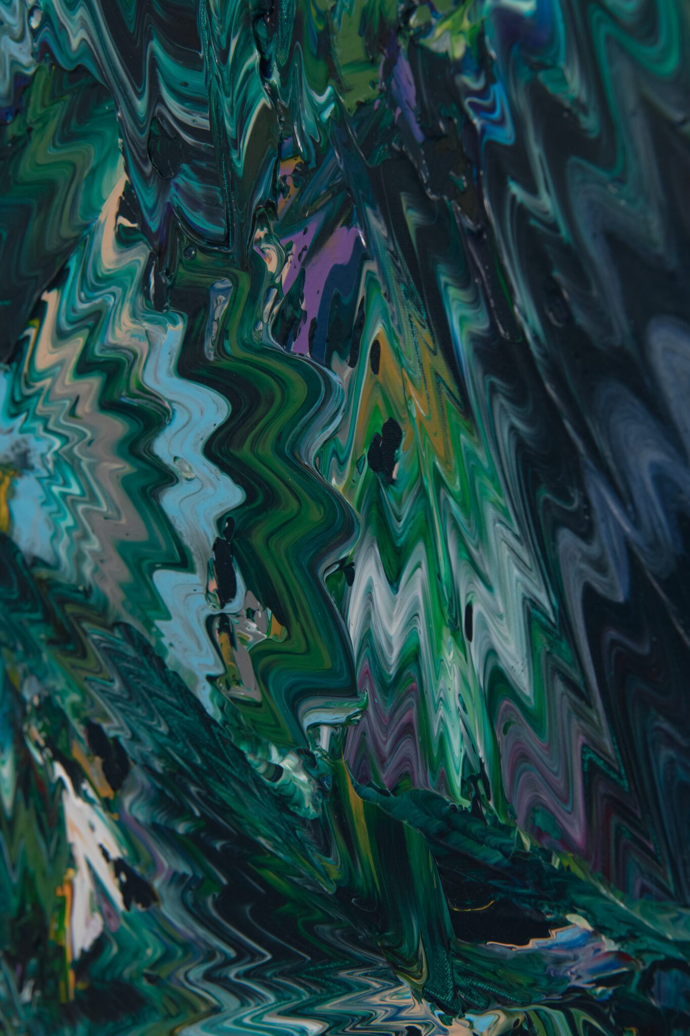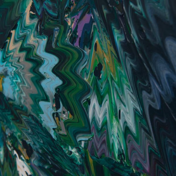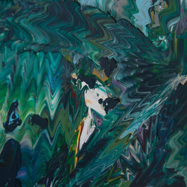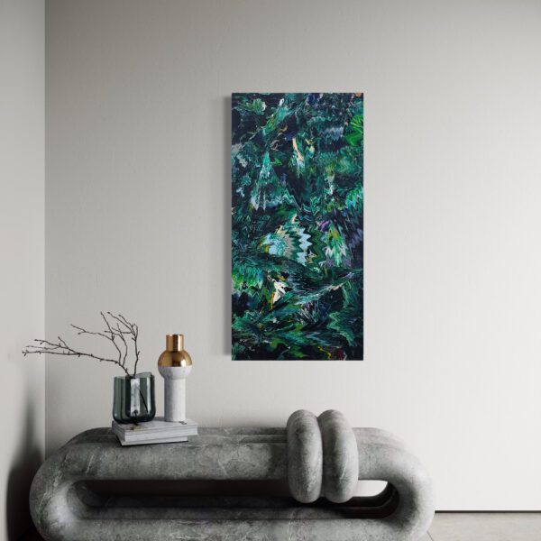 This painting presents a structured yet organic interpretation of a rainforest cross-section, utilizing a spectrum of green tones and fluid, interwoven forms. The composition is dynamic, with movement extending across multiple directions, yet it maintains a sense of cohesion. Light plays a crucial role, creating contrast and depth, highlighting the distinctions between the various shades of green. Despite the dynamic movement across different diagonals, the composition maintains a lyrical quality, enhanced by light filtering through and accentuating the contrast between the diverse greens.