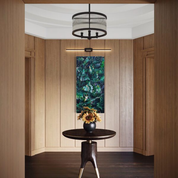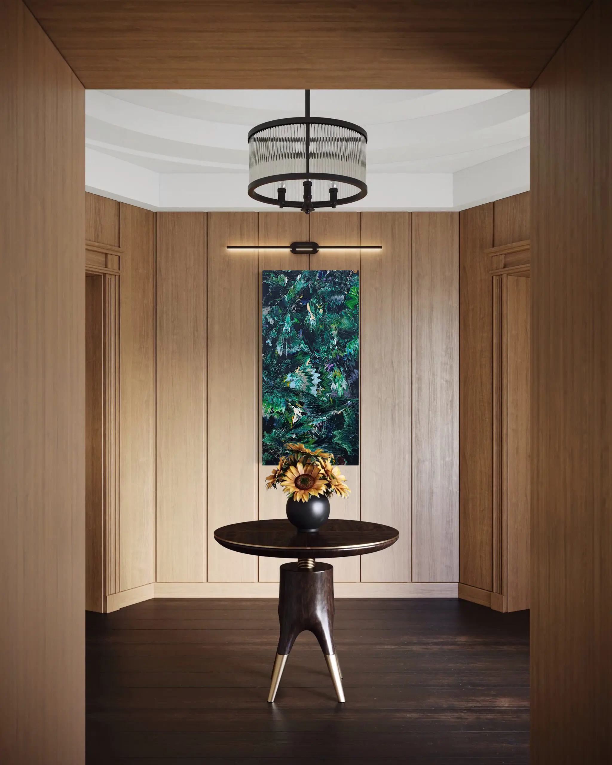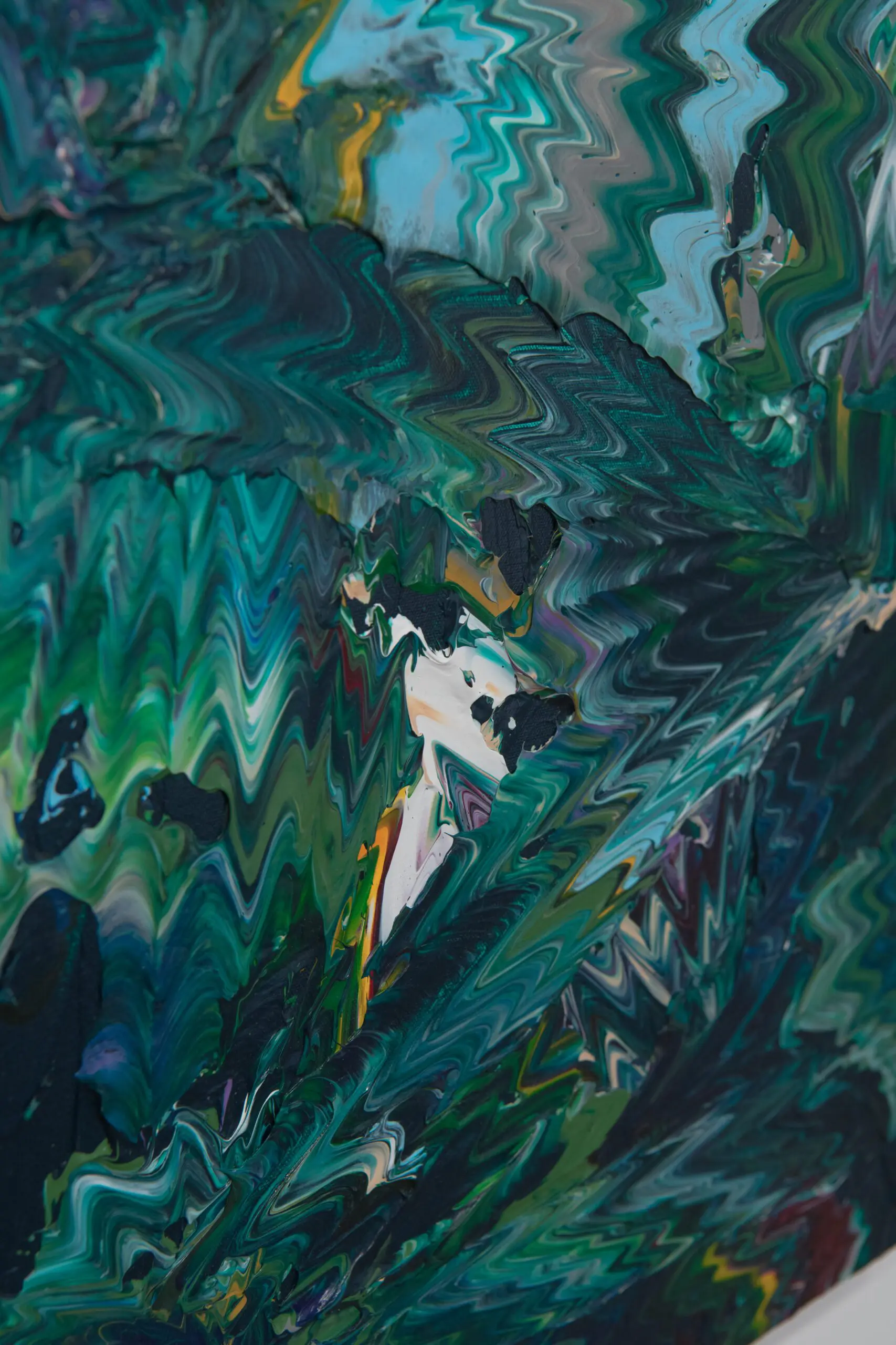 This painting presents a structured yet organic interpretation of a rainforest cross-section, utilizing a spectrum of green tones and fluid, interwoven forms. The composition is dynamic, with movement extending across multiple directions, yet it maintains a sense of cohesion. Light plays a crucial role, creating contrast and depth, highlighting the distinctions between the various shades of green. Despite the dynamic movement across different diagonals, the composition maintains a lyrical quality, enhanced by light filtering through and accentuating the contrast between the diverse greens.