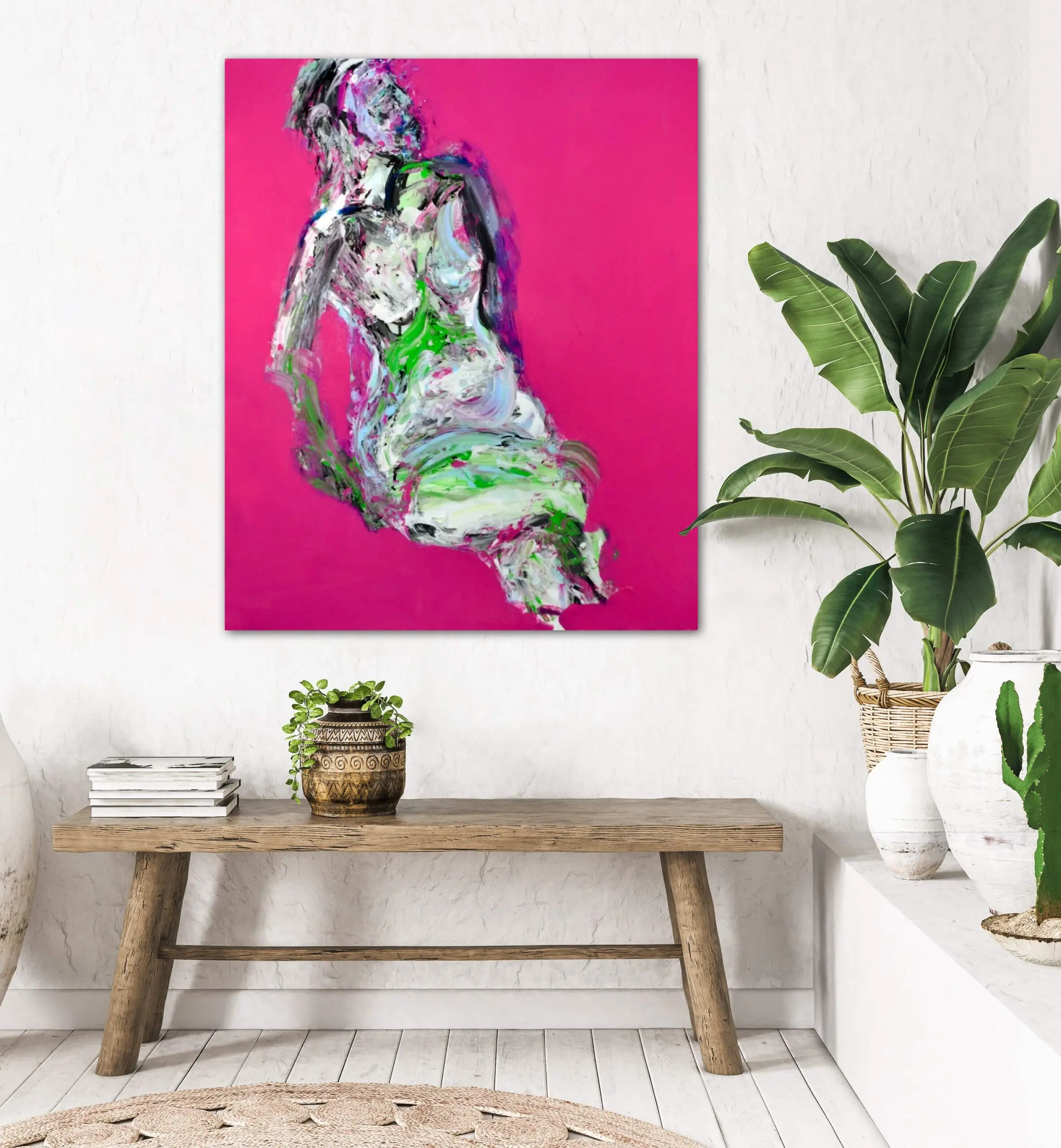 “Magenta 1” has a spell-binding ability to balance movement and abstraction. Mashian’s fearless approach to contemporary figurative abstraction makes this piece a fabulous statement in modern art, appealing to collectors and enthusiasts drawn to expressive, high-impact paintings that challenge perception and redefine presence.