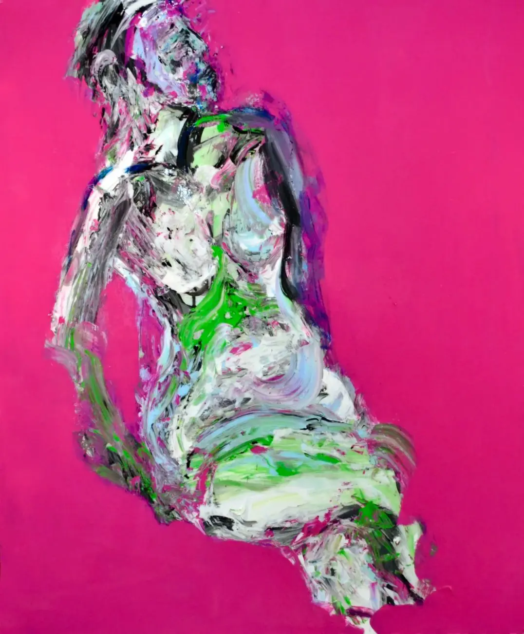 “Magenta 1” by Haleh Mashian is an electrifying exploration of movement, contrast, and expressive abstraction. Against a bold magenta background, the figure emerges in a flurry of gestural brushstrokes—its form constructed and deconstructed at the same time. The intense color choice is more than just aesthetic; it amplifies the painting’s energy, forcing the viewer to engage with the raw emotion embedded in every stroke.