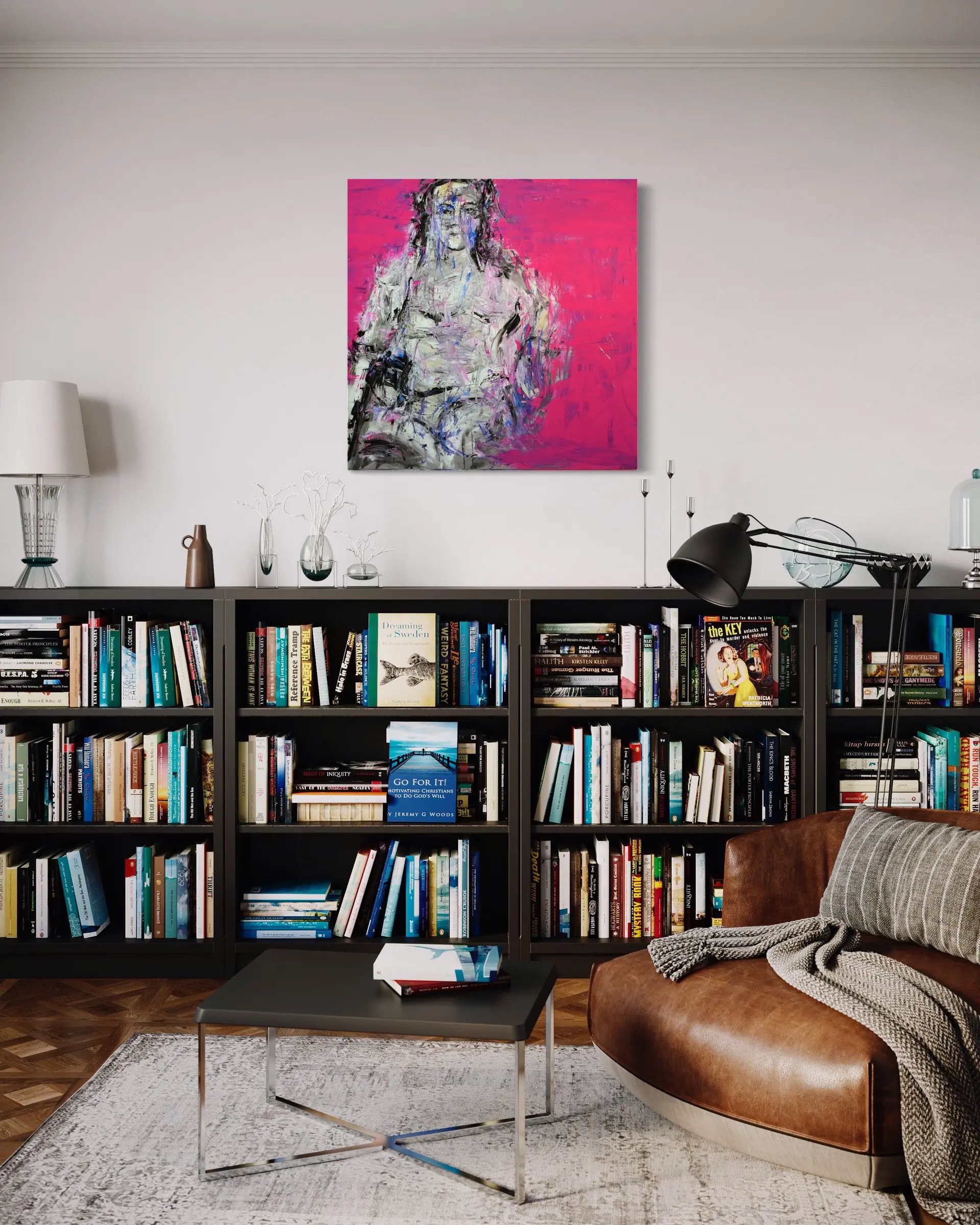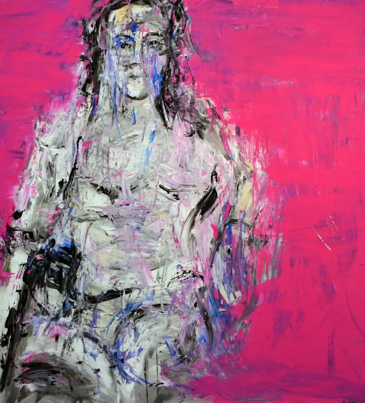 In this piece, Mashian continues to delve into the technique of working within a constrained palette, fostering experimentation with diverse forms of paint application. The figure emerges through layers of short, yet expressive brushstrokes, set against a backdrop of vibrant blue infused with overlays of magenta hues.