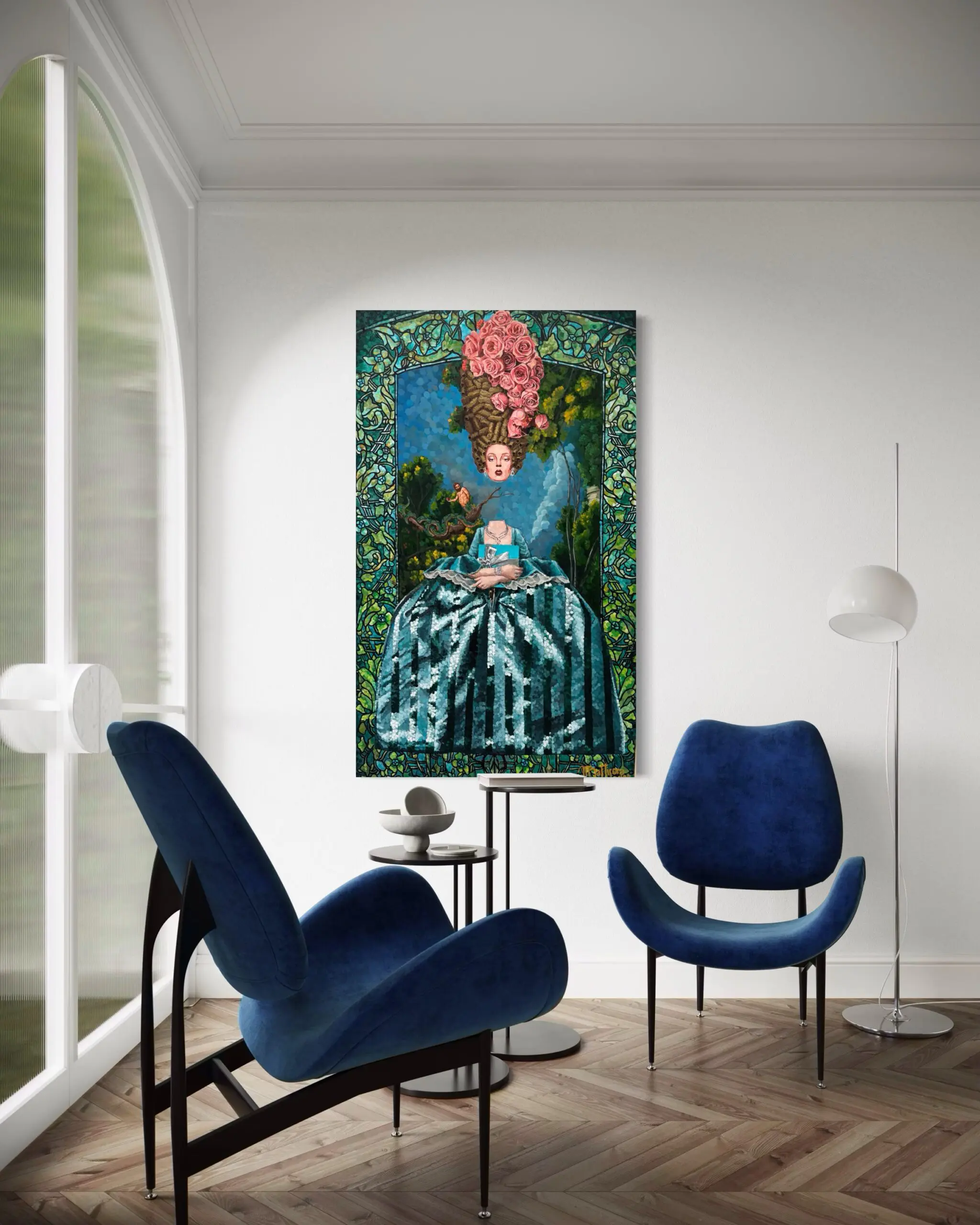 At first glance, the central figure exudes the luxurious elegance of Marie Antoinette, draped in luminous blue-green fabric and adorned with ornate jewels and delicate embellishments. Yet, in a bold surrealist twist, her floating head, crowned with an ornate tower of golden curls intertwined with blooming roses, subverts the formality of classic portraiture, transforming her into an emblem of excess, detachment, and historical satire.