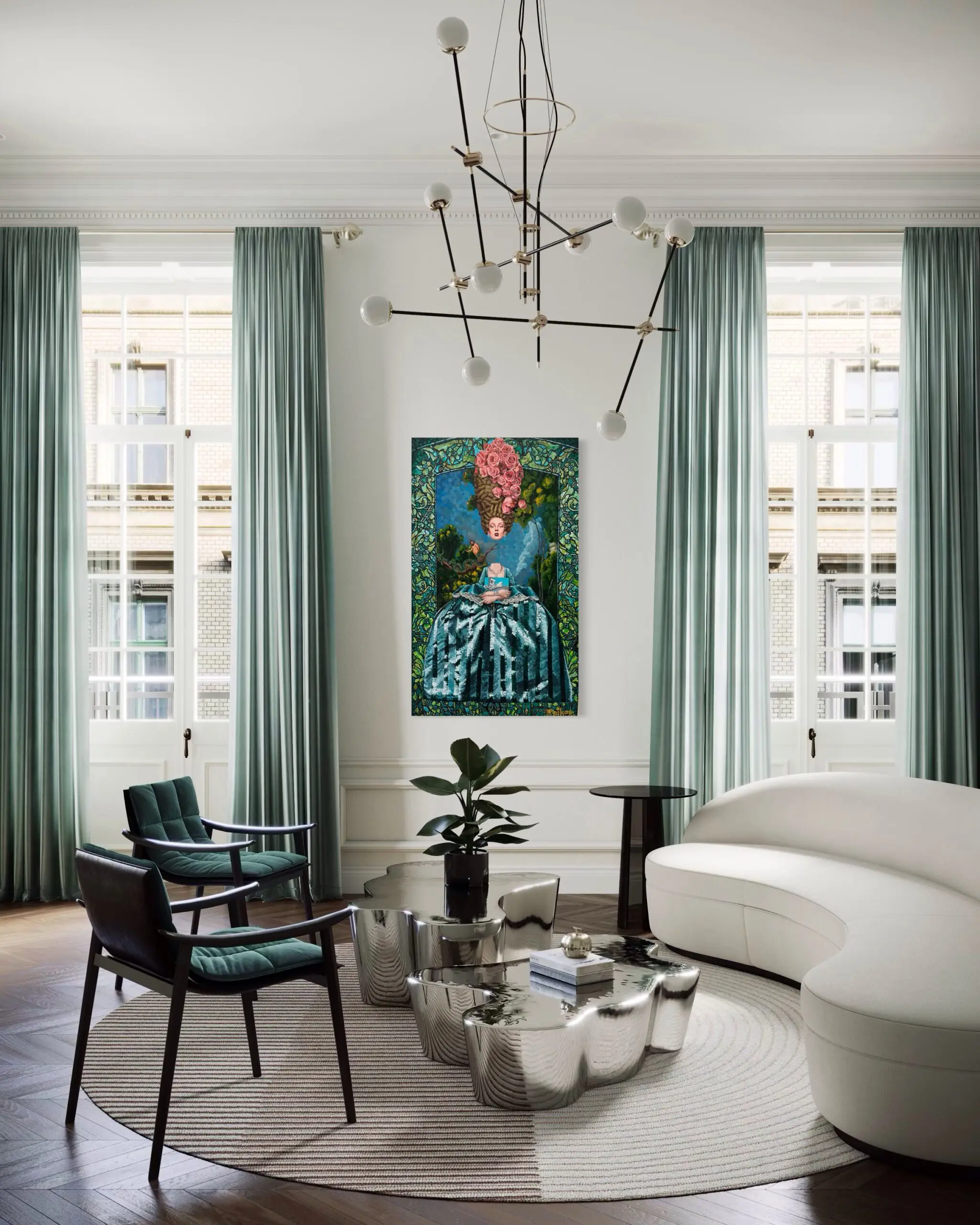 In “Marie Antoinette Tiffany’s,” Mauritzio Battifora masterfully blends Rococo extravagance with pop surrealism, creating a visually opulent yet deeply satirical commentary on wealth, vanity, and the fleeting nature of status. This stunning composition reinterprets 18th-century aristocratic portraiture, distorting its grandeur into a surreal, almost theatrical spectacle that challenges traditional notions of power and beauty.