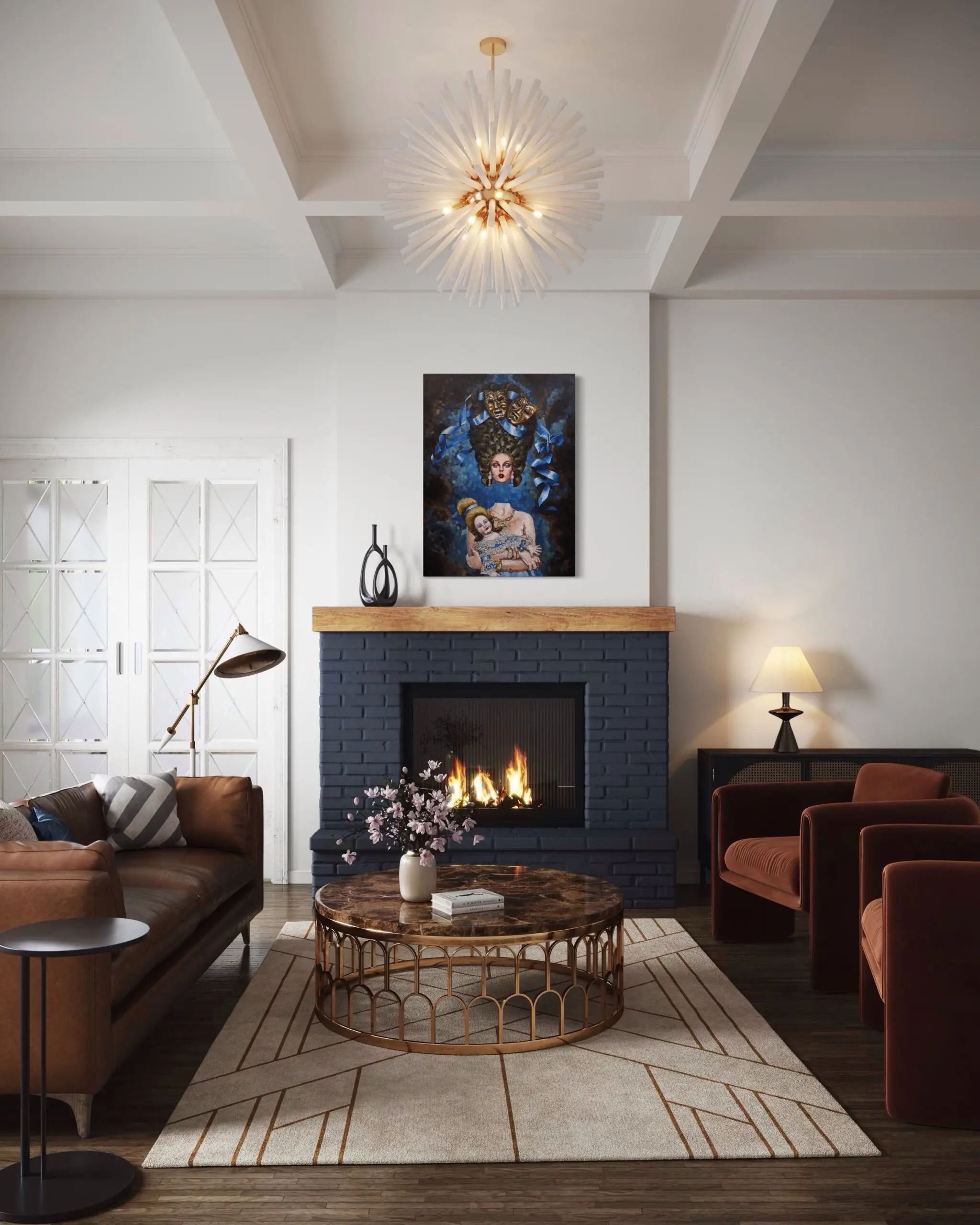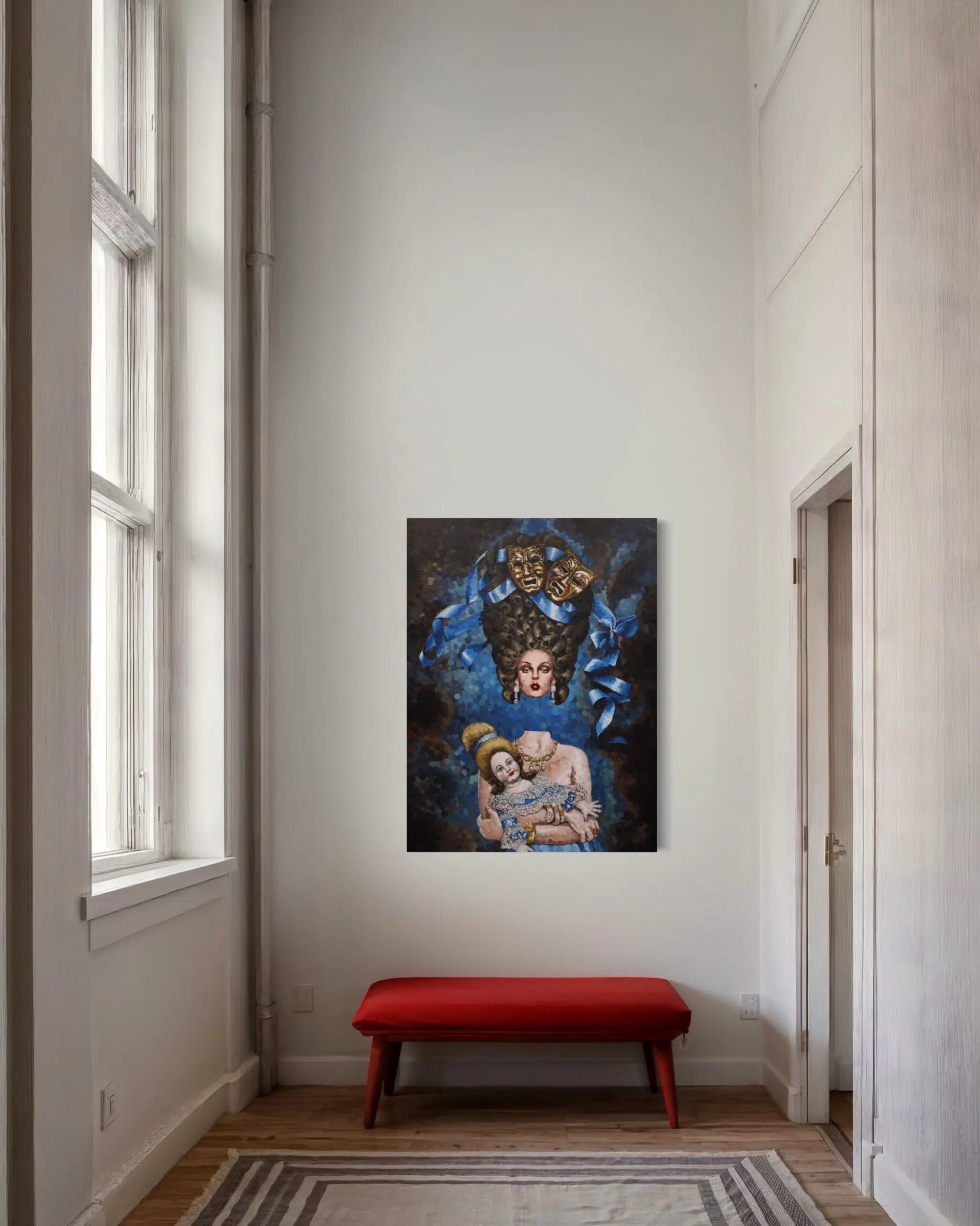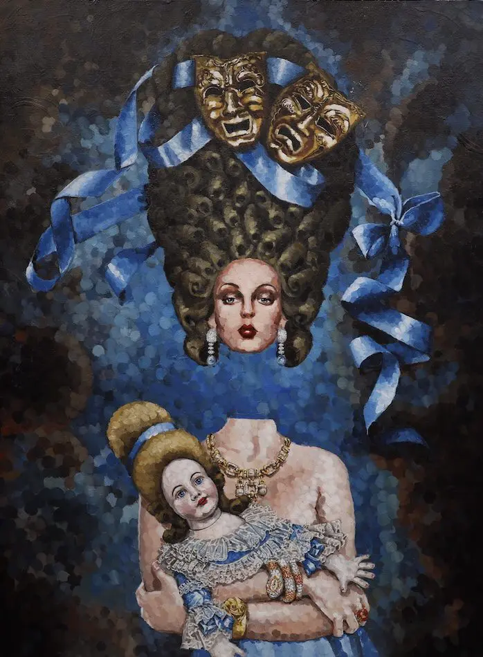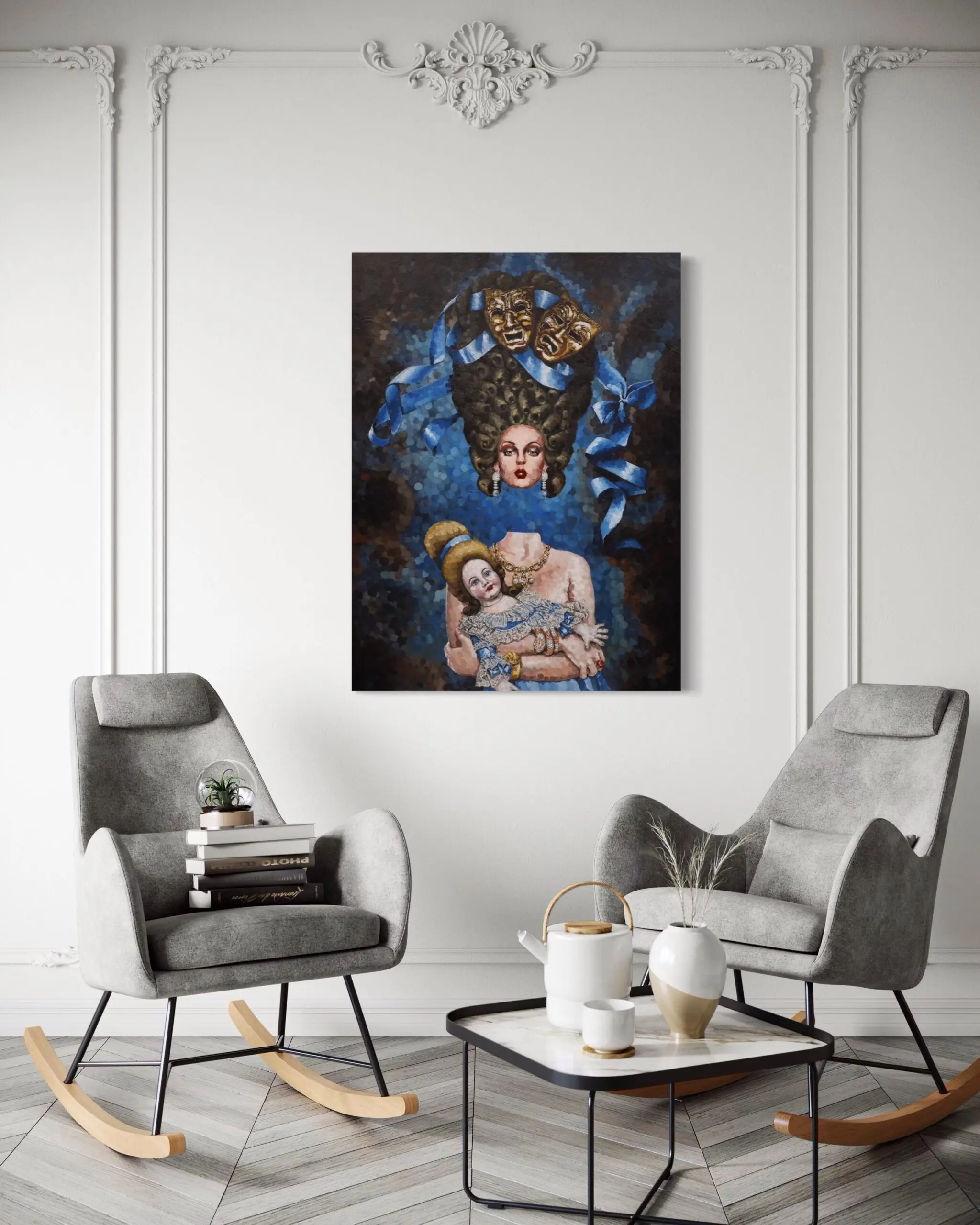 Central to the painting is a figure of a semi-nude Marie Antoinette, characterized by a dramatic, towering hairstyle adorned with theatrical masks, adding a layer of intrigue and complexity. The use of blue ribbons enhances the regal aspect, while the blue background creates a rich contrast that emphasizes the figure.The woman holds a doll, which symbolizes innocence or the pressures of motherhood and societal expectations. This choice adds a poignant commentary on femininity and the roles women are often expected to play. The use of masks invites viewers to reflect on themes of identity, performance, and the duality of our social persona versus private life, echoing the theatricality of our everyday lives. Like Marie Antoinette, men and women play a role and social media is our audience… Will they hate you ? Will they love you? Will they lift you up, or destroy you?