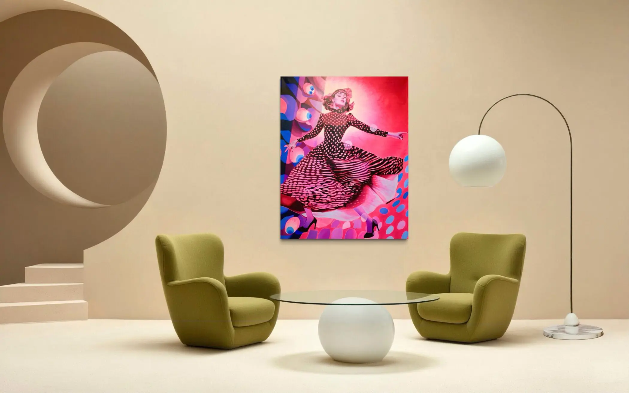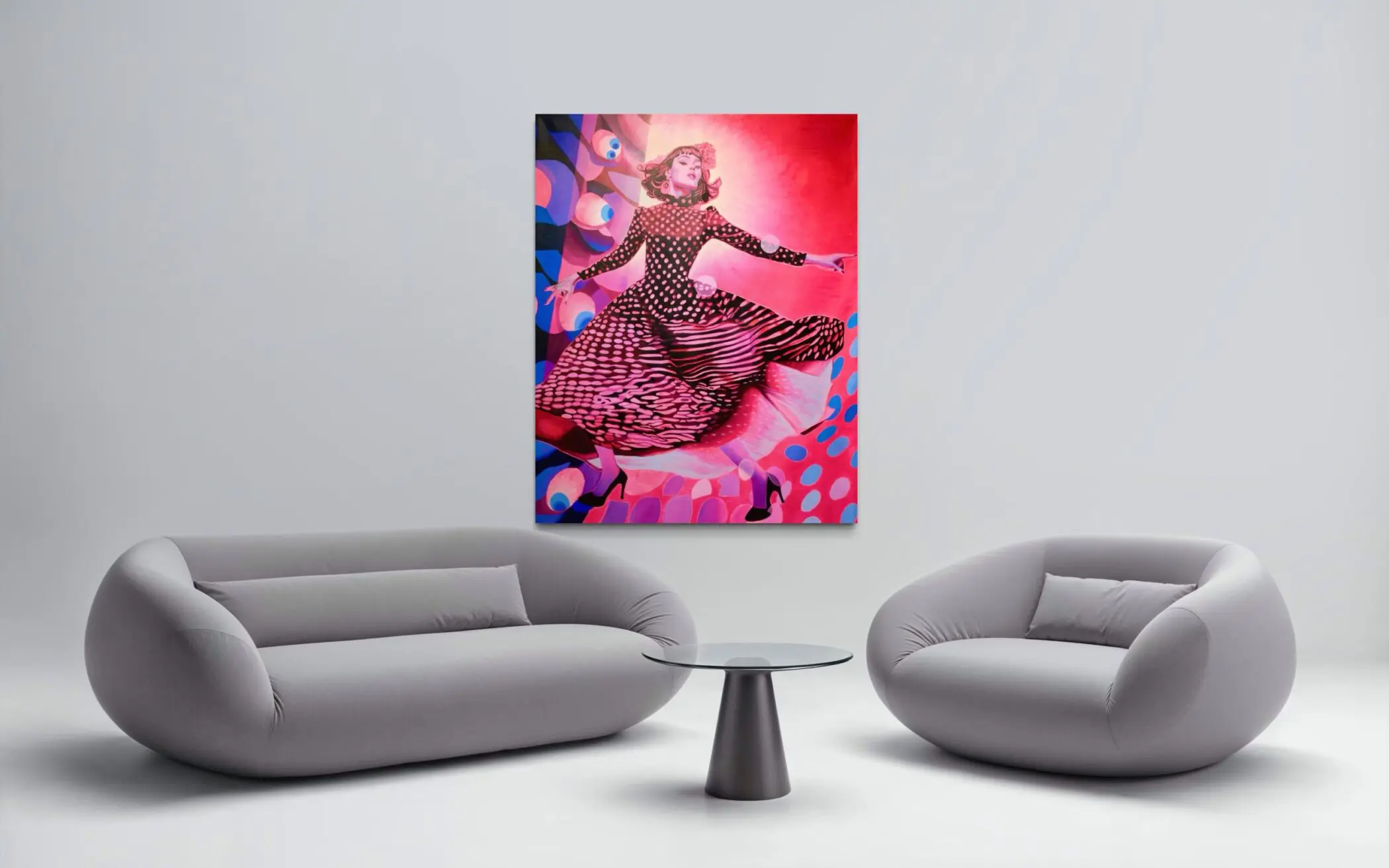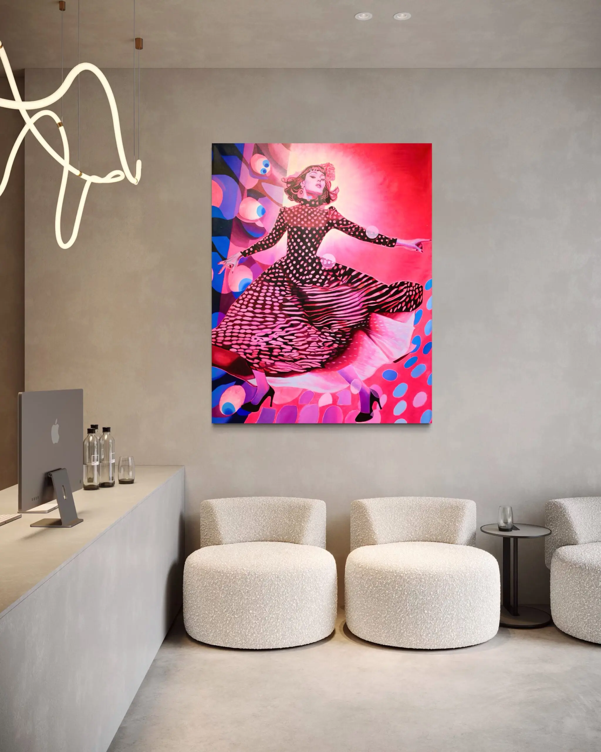 Marieta is a bold and radiant celebration of identity, movement, and legacy. Part of the Femininity and Race series, this striking acrylic painting reimagines the flamenco dancer as a symbol of cultural pride and feminine power. Swathed in vibrant hues of pink, red, and violet, Marieta moves with electrifying grace—rooted in tradition yet unapologetically modern.