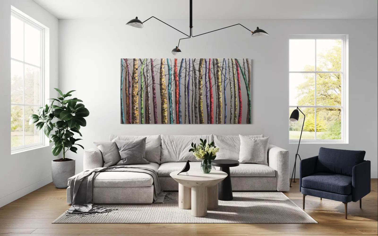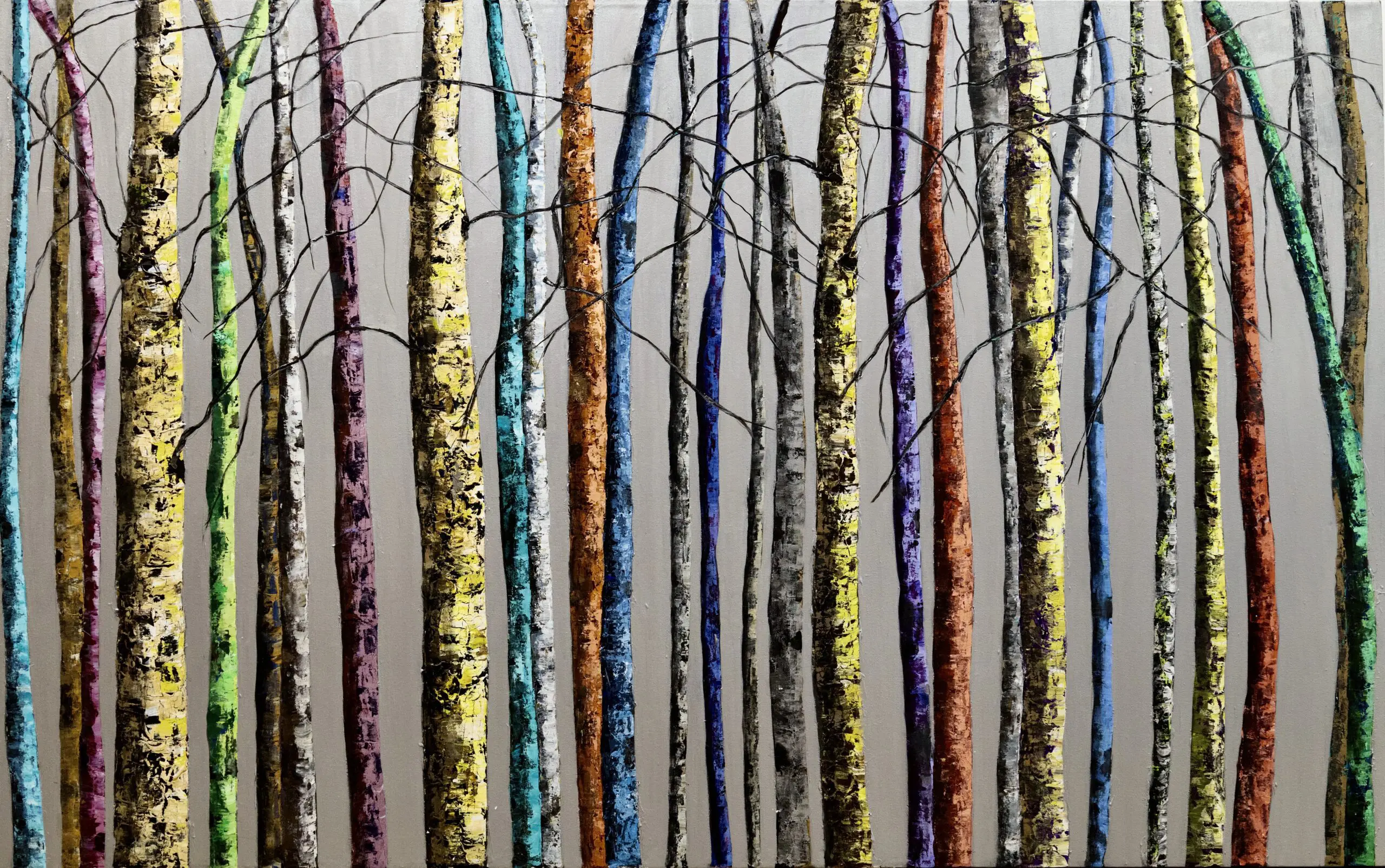 Haleh Mashian’s “Metallica III” presents a refined and contemporary interpretation of the forest, blending organic elements with a modern aesthetic. The vertical tree trunks, rendered in textured layers, rise against a smooth, neutral-toned background, creating a sense of depth and rhythm. Vibrant accents of turquoise, gold, copper, and deep blue weave through the natural black-and-white bark, introducing an unexpected play of color that brings energy to the composition.