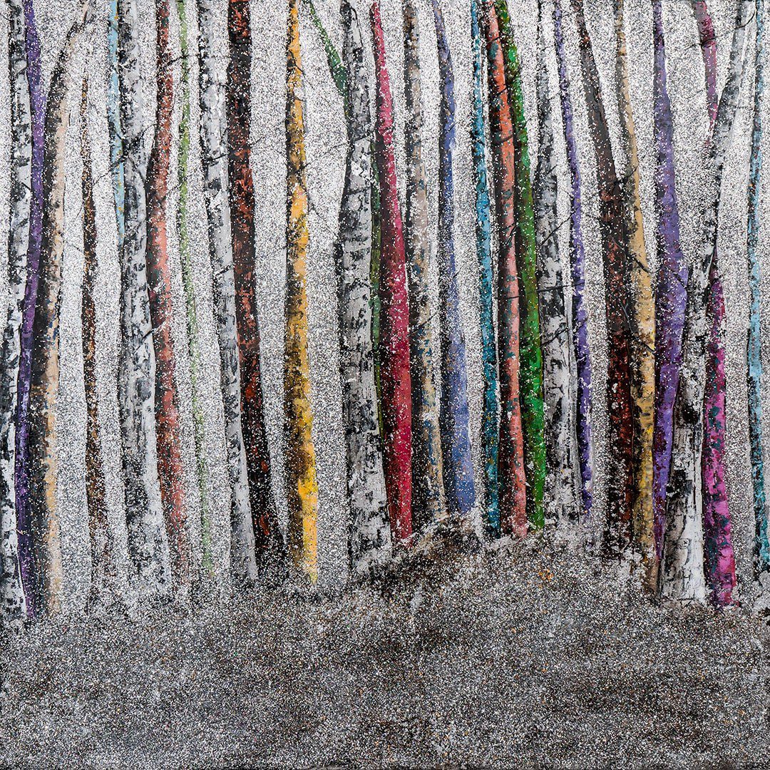 Haleh Mashian’s “Metallica I” is a stunning example of contemporary mixed media art that blends the natural world with a futuristic edge. In this abstract landscape painting, a forest takes shape through shimmering textures, metallic tones, and vibrant color.