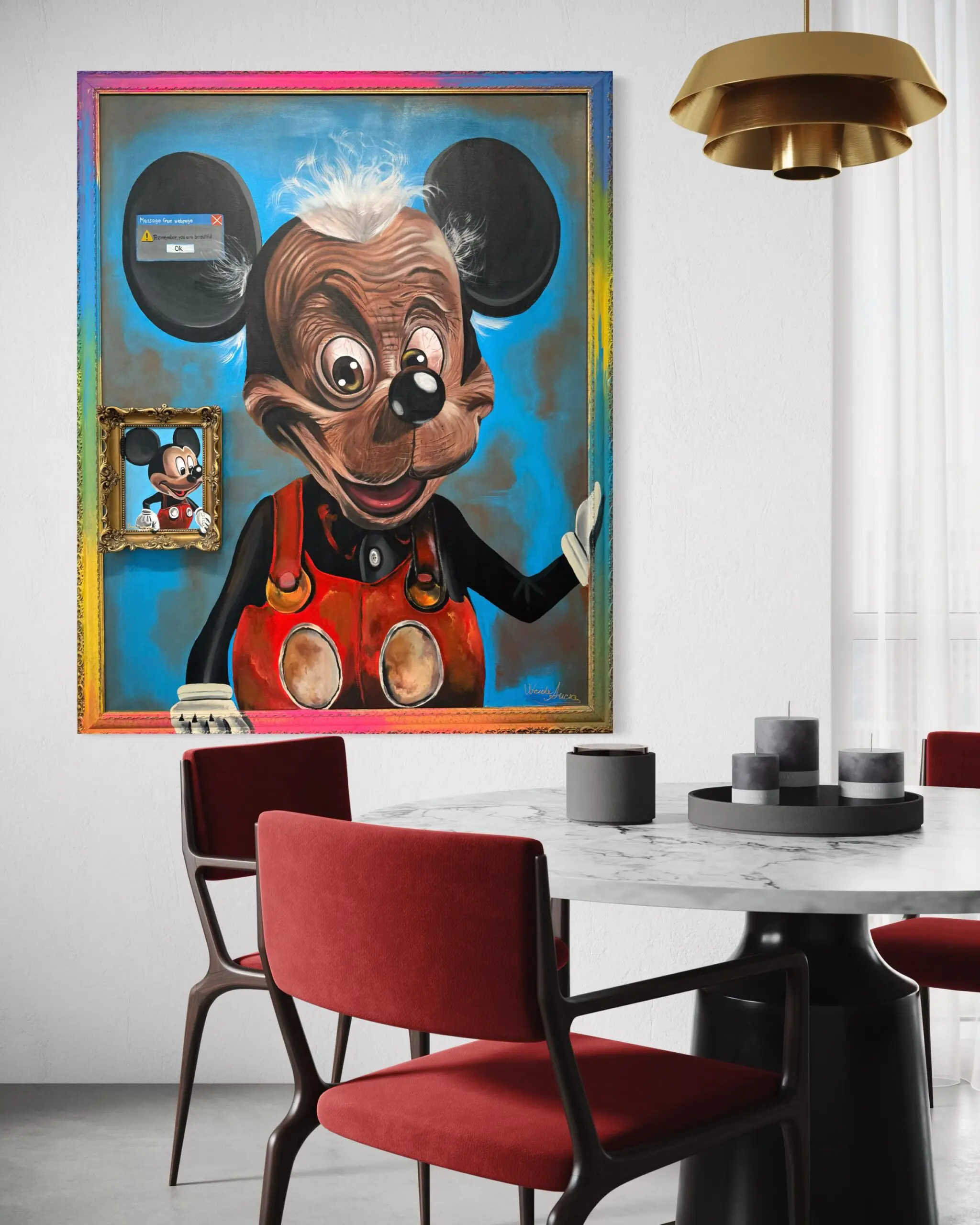 In this striking mixed-media work, Mickey Mouse is reimagined not as a sanitized corporate mascot, but as a timeworn icon—faded, cracked, and resolutely present. His crooked smile and softened hues evoke decades of cultural wear, positioning him as a survivor rather than a symbol. A pristine, golden version of his younger self lingers in the corner—an emblem of untouchable nostalgia—while the central figure confronts the viewer with raw authenticity. The piece plays with contrast: innocence versus experience, fantasy versus endurance. Rather than lament the passage of time, it honors resilience, offering a wry, poignant meditation on the aging of icons and the power of collective memory.