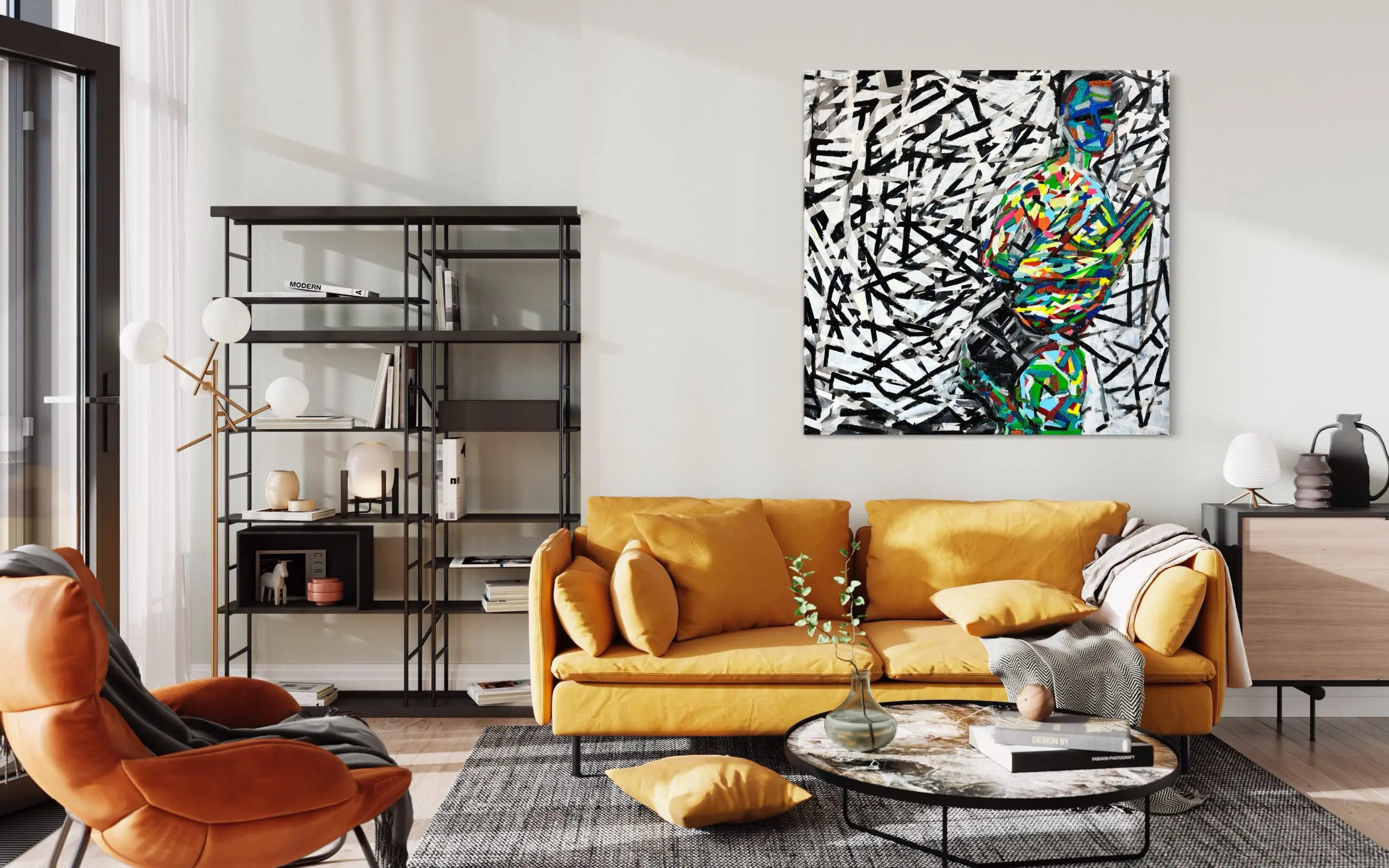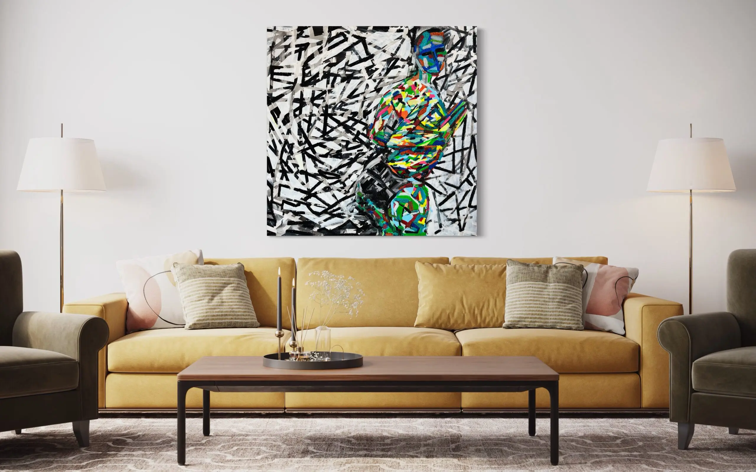 Within this mixed media composition, it portrays a woman ensnared within the intricate web of suppressed desires. The figure, boldly defying the constraints imposed upon her, emerges as a testament to defying the gravitational pull of longing. The abstract embodiment of this struggle, meticulously crafted through a fusion of acrylic, resin, and glitter, imbues this figurative artwork with a contemporary twist.