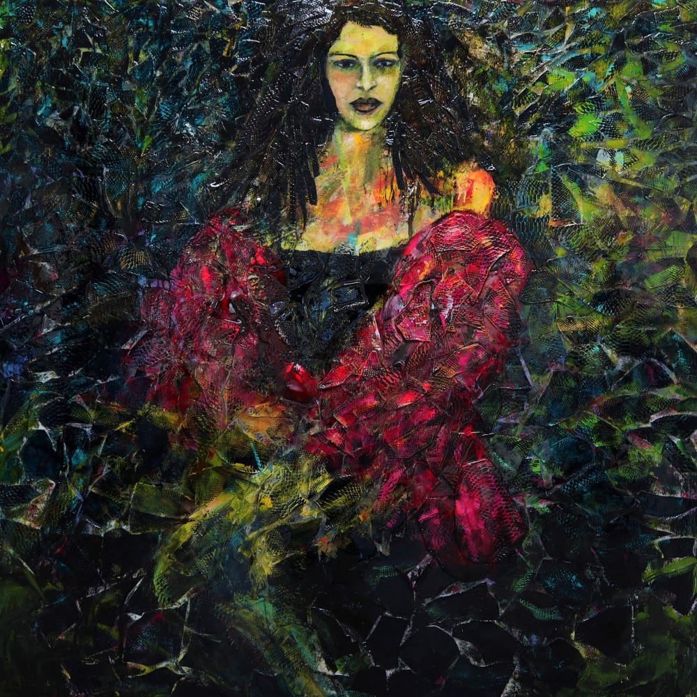 Haleh Mashian’s “Mona Hissa” is a captivating mixed-media painting that masterfully blends portraiture, abstraction, and rich texture. The artwork presents a mysterious female figure, her intense gaze emerging from a dark, layered background of deep greens, blues, and blacks. The expressive brushstrokes and sculptural impasto techniques create a dynamic interplay of light and shadow, adding an ethereal quality to the composition.