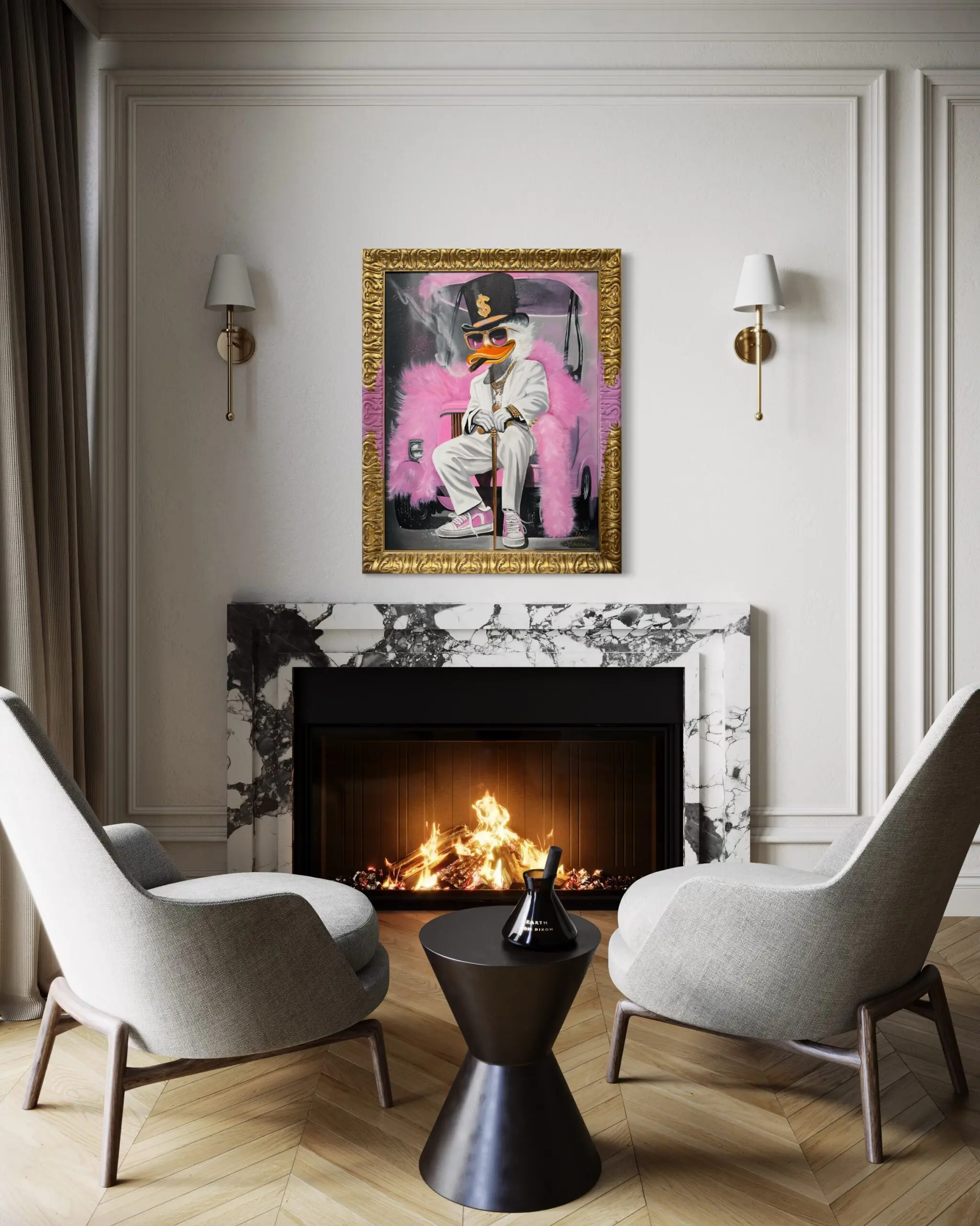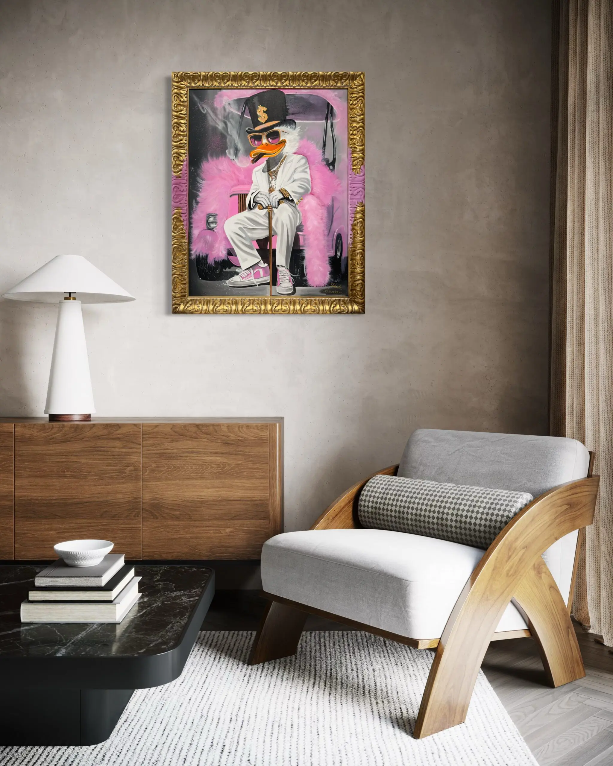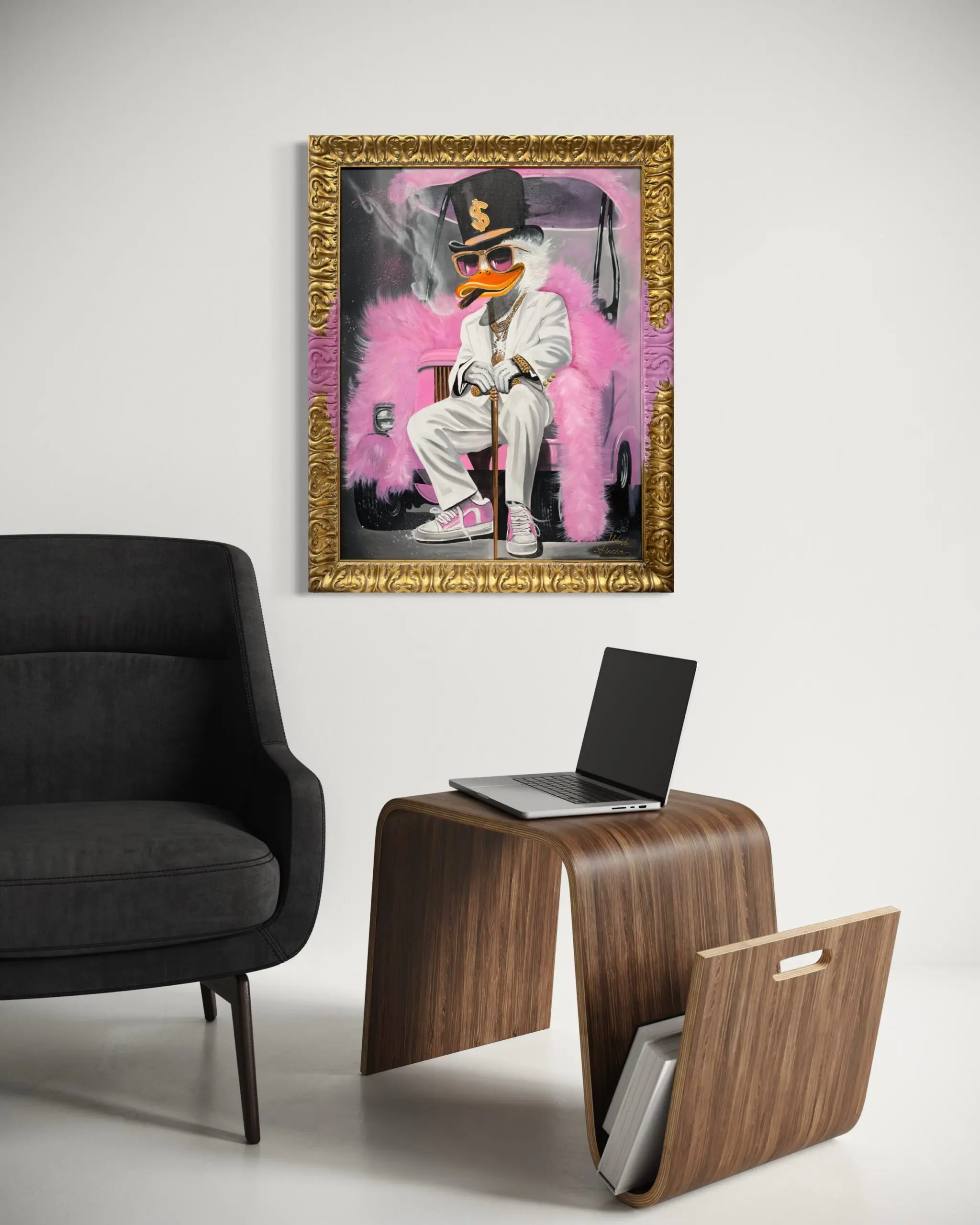 This pop surrealism inspired piece reimagines a classic cartoon character as a larger-than-life icon of wealth, power, and swagger. Dressed in a sharp white suit, oversized pink sunglasses, and designer sneakers, this duck oozes confidence while seated atop a hot pink vintage ride, surrounded by plush fur and smoke. His towering top hat, emblazoned with a gold dollar sign, signals the crown of a self-made king.