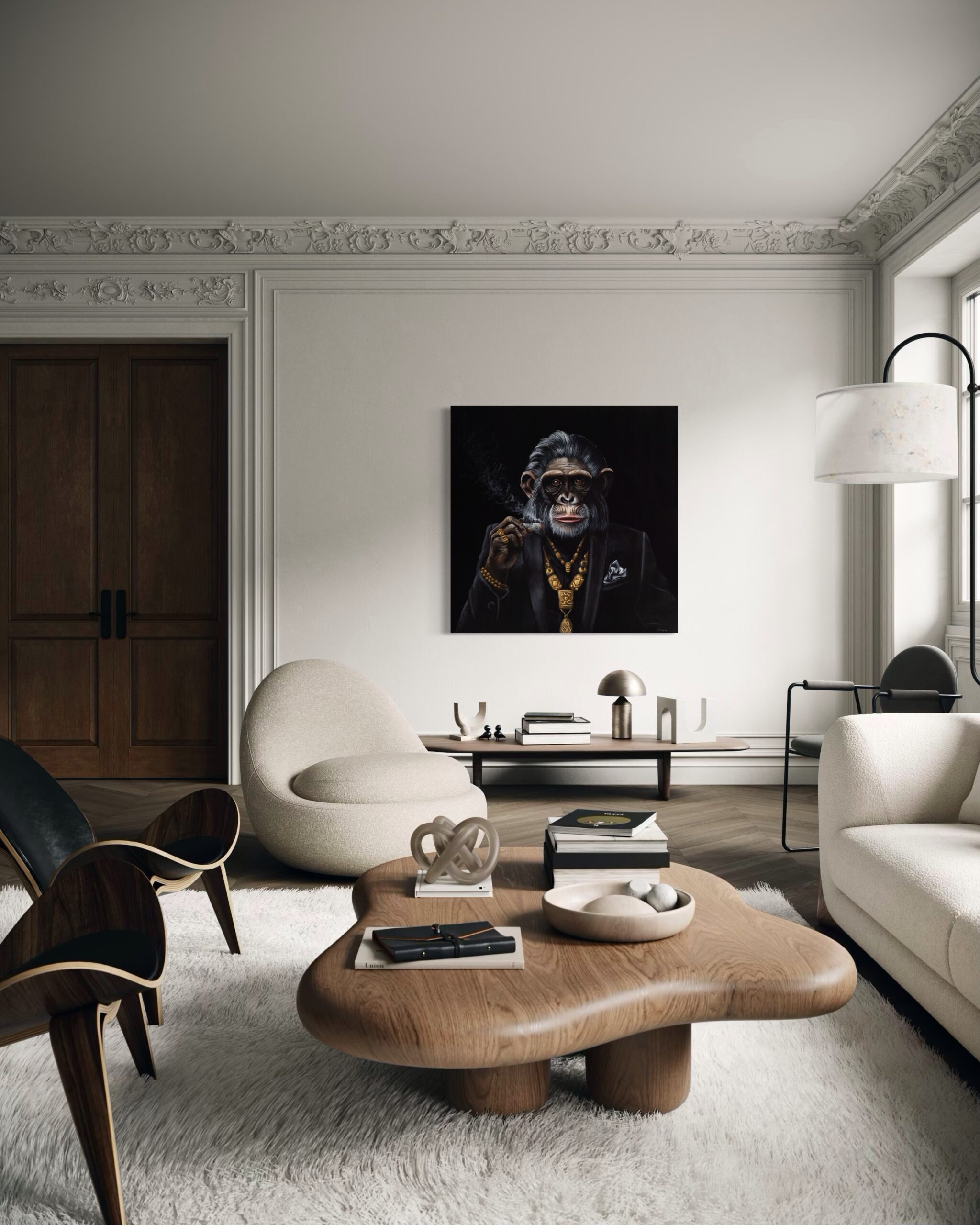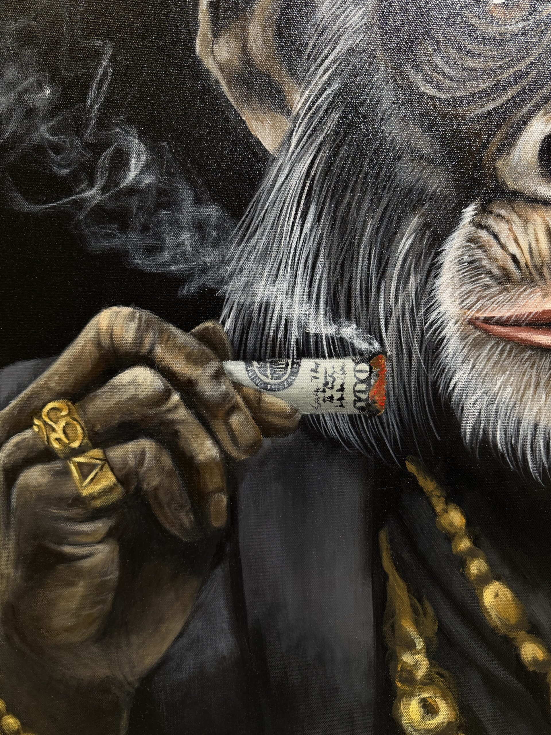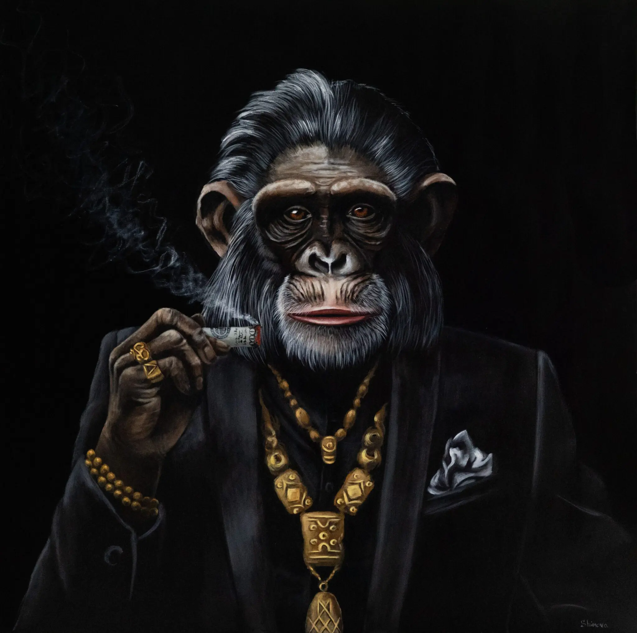 “Monkey Power” is a commanding portrait that merges primal intensity with the unmistakable aura of influence, status, and sophistication. The artist presents an imposing chimpanzee figure, its gaze brimming with human-like intelligence and quiet dominance, lips slightly parted as a wisp of cigar smoke curls into the air. The meticulous realism in the facial rendering—each wrinkle, each strand of hair draws the viewer into an atmosphere thick with mystique and gravitas.