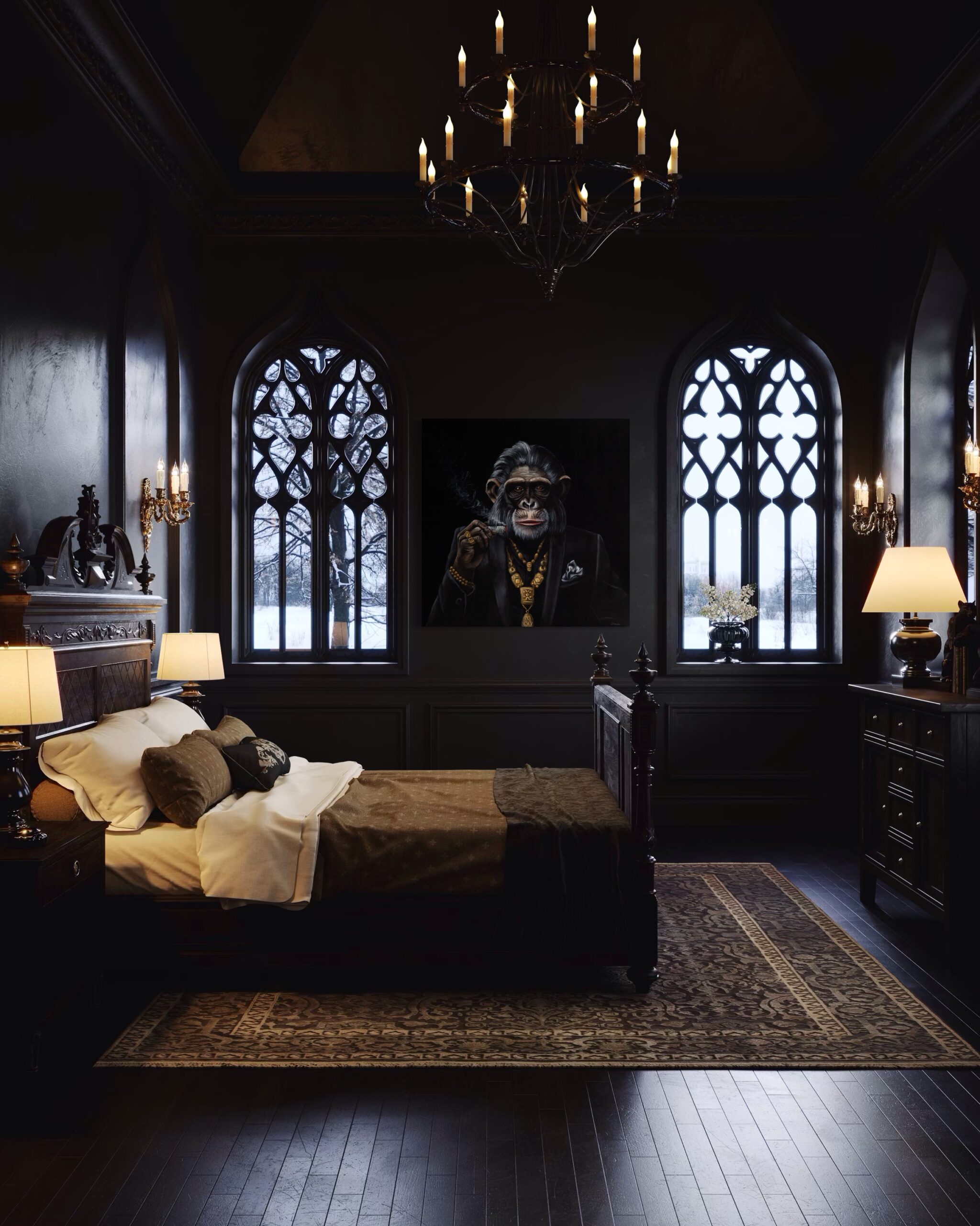 Beneath its surface opulence, “Monkey Power” speaks to deeper themes—the evolution of power, the blurring of primal instinct and calculated dominance, and the way aesthetics shape authority. Is this a meditation on status and identity, or a bold statement on the humanization of control and excess? The subject appears caught between its origins and its aspirations, a being of both instinct and ambition, wrapped in wealth and mystique.