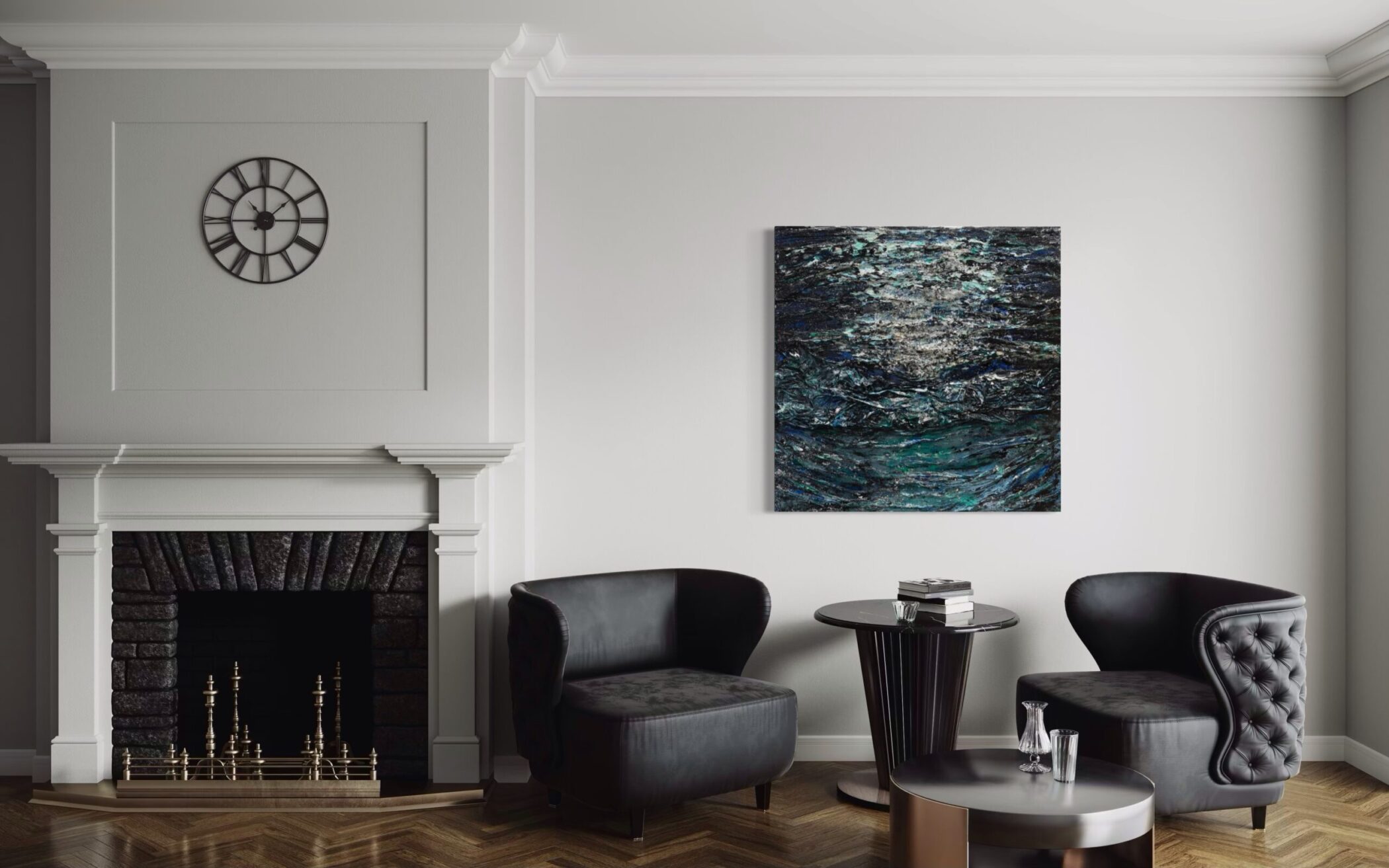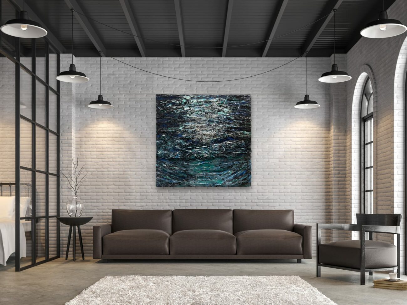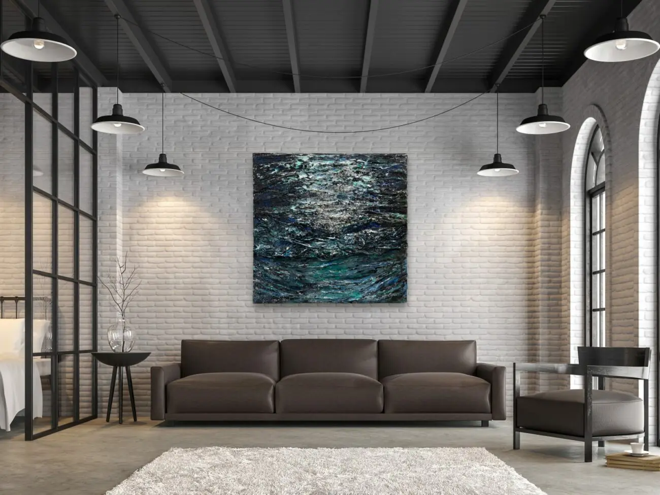 What sets “Moonlight Reflection” apart is its masterful balance of contrast. Deep blacks and cool blues create a vast, inky abyss, while silvers and icy whites ripple across the surface, simulating the way moonlight catches and dances on water. The light appears both fragmented and directional, forming an organic path that leads the viewer’s eye across the canvas. There is a sense of quiet energy here—a tension between the vast unknown and fleeting illumination.