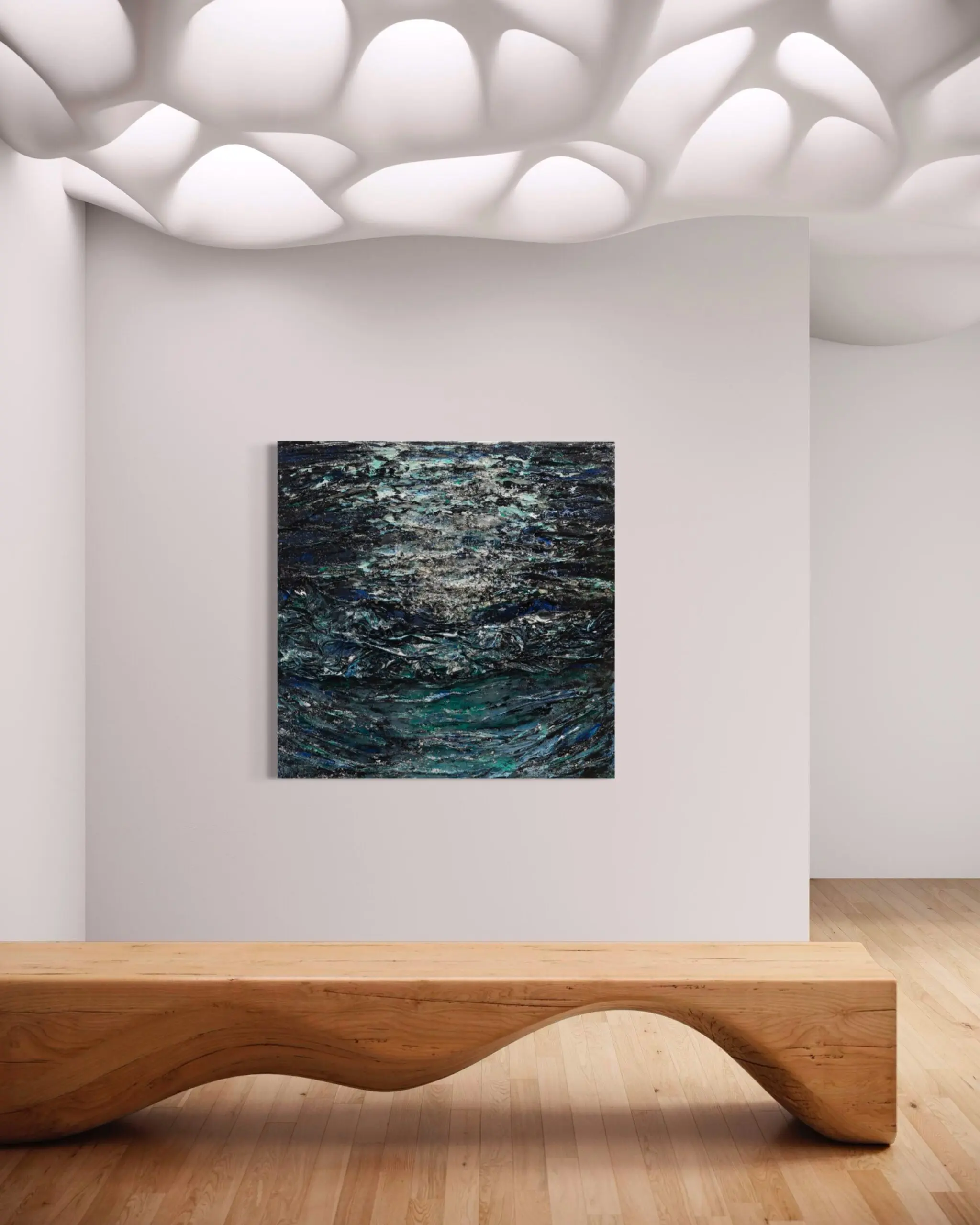 Mashian’s use of mixed media enhances the painting’s tactile quality. Thick impasto layers create a sculptural surface, reinforcing the texture of undulating water. The paint itself takes on the characteristics of waves—cresting, dissipating, and reforming—allowing the artwork to shift visually depending on light and perspective. The reflection is not smooth or predictable; it is fragmented and organic, much like real water under the glow of the moon.