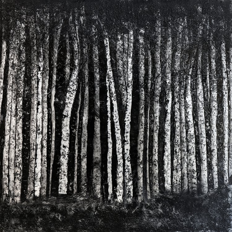 The depth of the scene is accentuated by the layering of black and white tones, with the darker background receding into mystery while the foreground remains crisp and defined. The impasto texture of the paint gives the bark a tactile, almost sculptural presence, reinforcing the organic forms of the trees. Fine, delicate branches weave through the upper portions of the painting, creating a contrast between structure and softness.