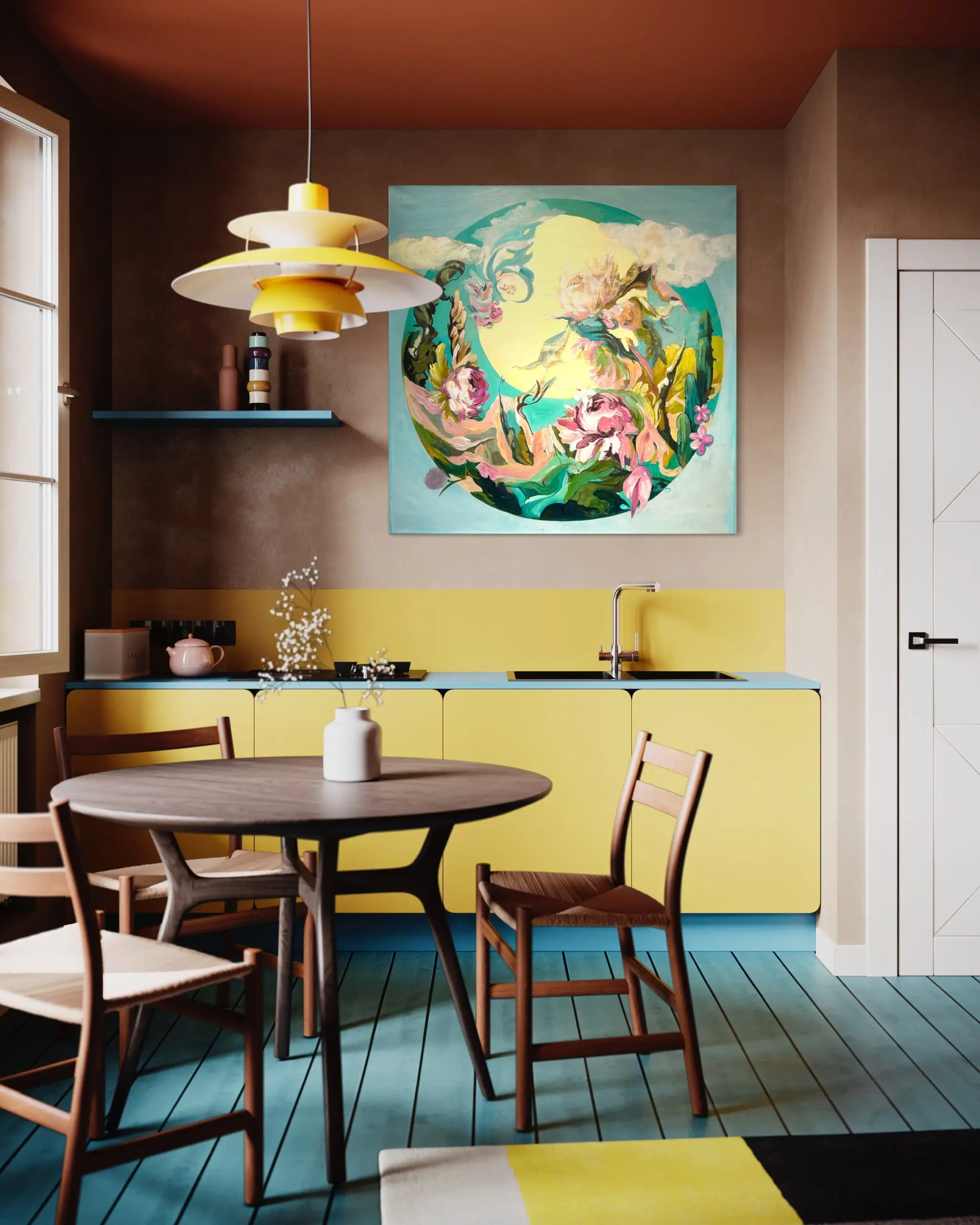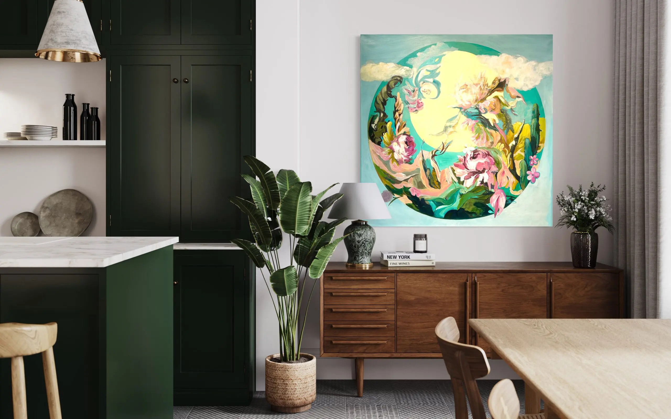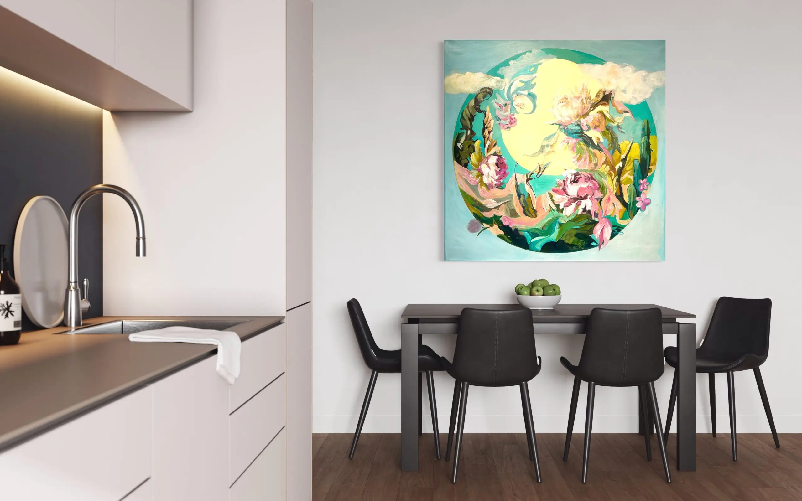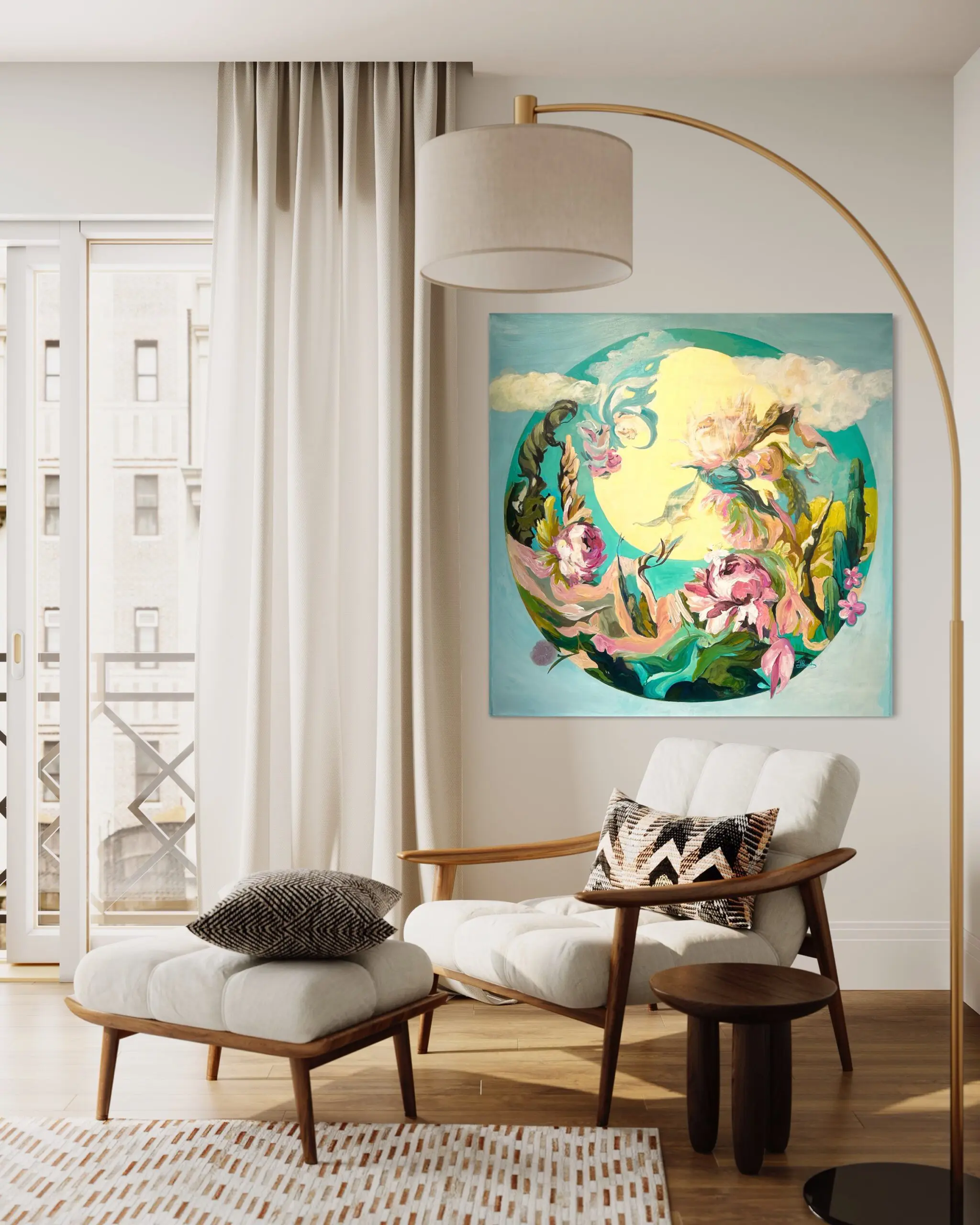 In this surreal and ethereal painting, we are transported to a floating floral scene where nature, flowers, the sky, the moon, and the clouds converge in a symphony of joy. The canvas is a vibrant tapestry of interconnectedness, celebrating the harmony and beauty found in the natural world.