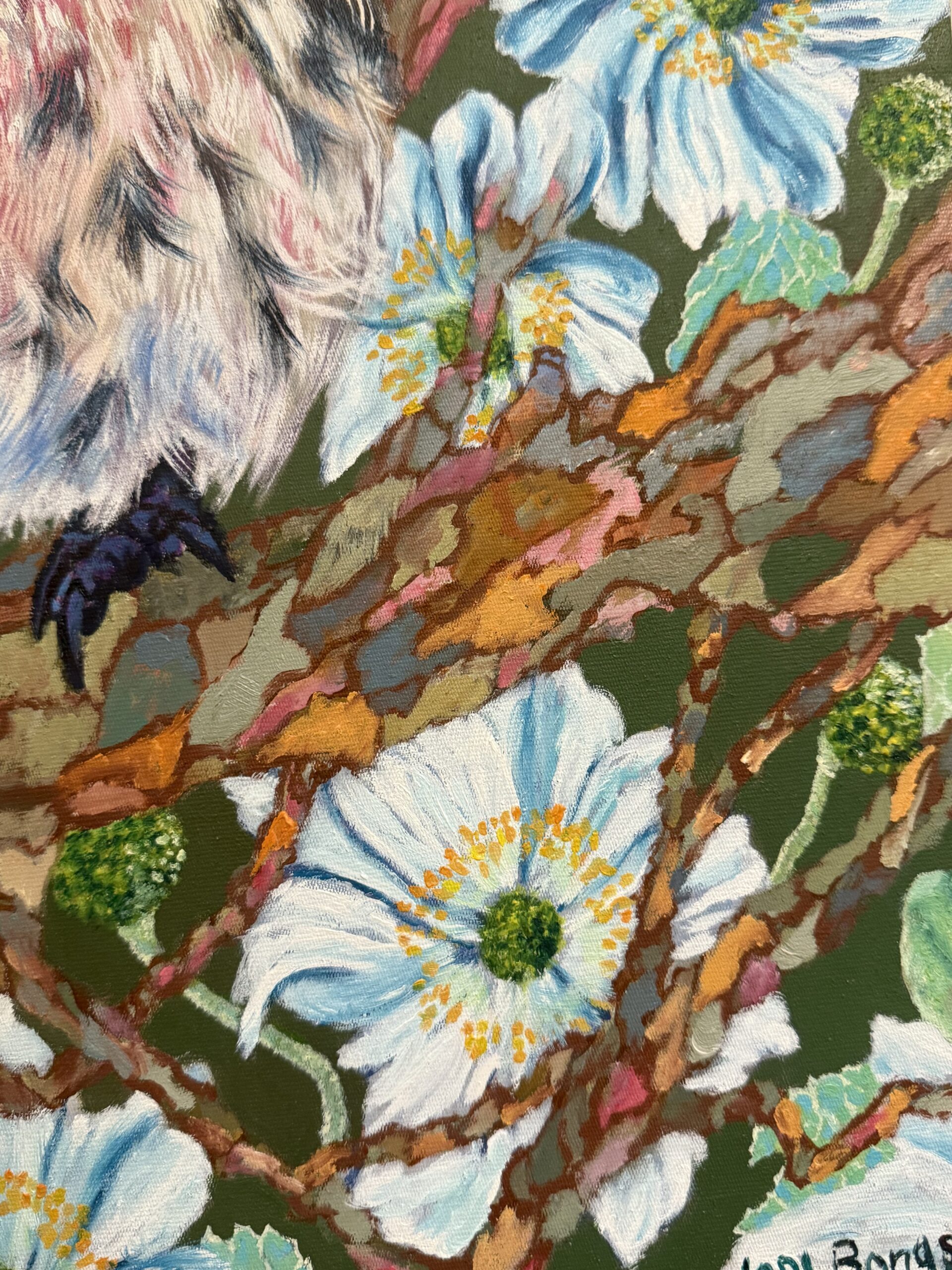 With this piece, Bonassi solidifies her signature ability to weave the organic with the ethereal, presenting a vision of nature that is both celebratory and deeply introspective. A work that demands engagement, it invites viewers to lose themselves in its intricate layers, where every branch, bloom, and feather tells a story of life’s quiet complexities.