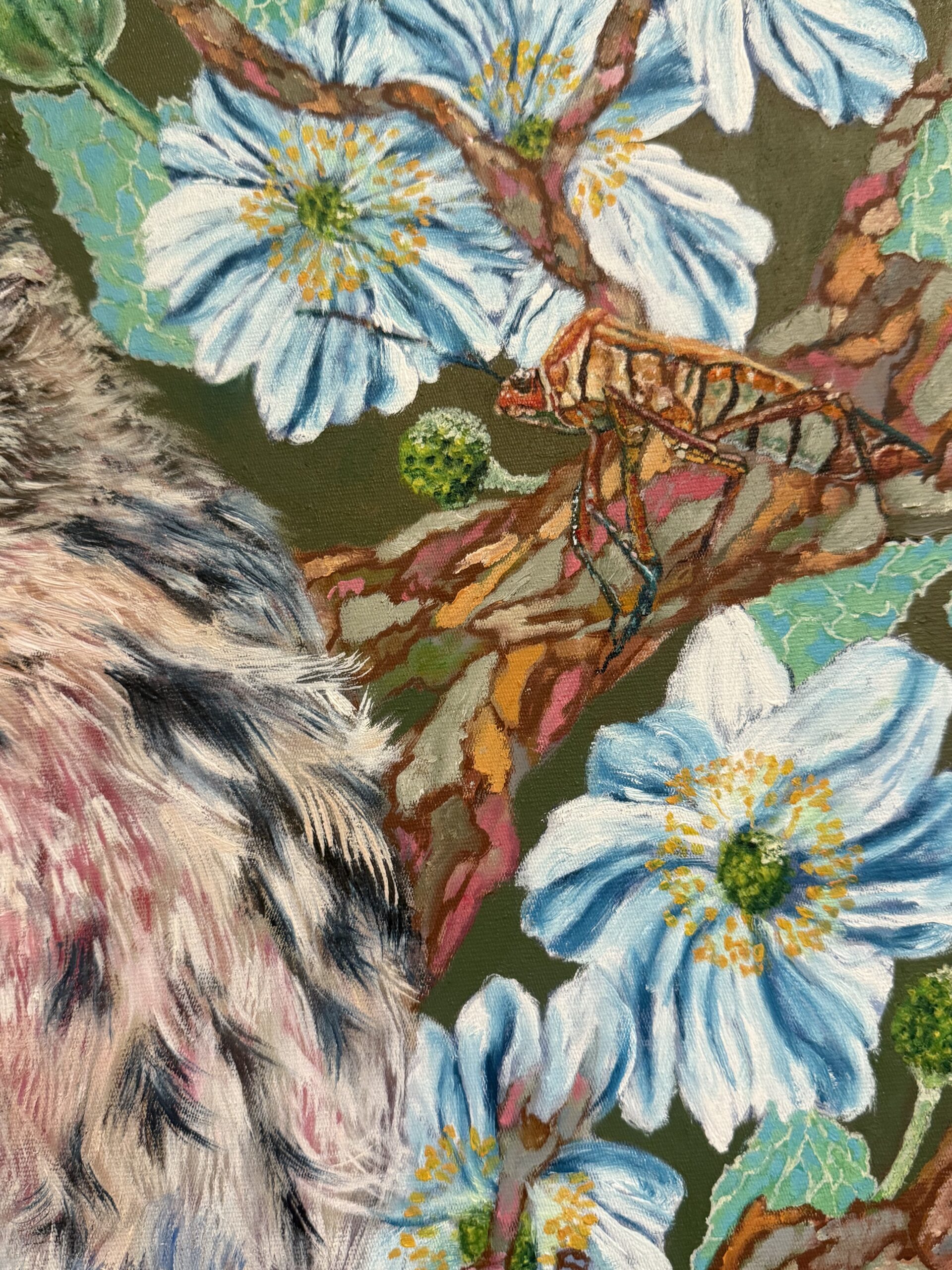 Bonassi’s ability to blend precise detail with a dreamlike, decorative sensibility creates an atmosphere that is both hyper-real and fantastical. The painting’s rich textural layering and dynamic color harmonies elevate it beyond traditional wildlife portraiture, transforming it into a meditation on interconnectedness, resilience, and the delicate balance between beauty and survival.