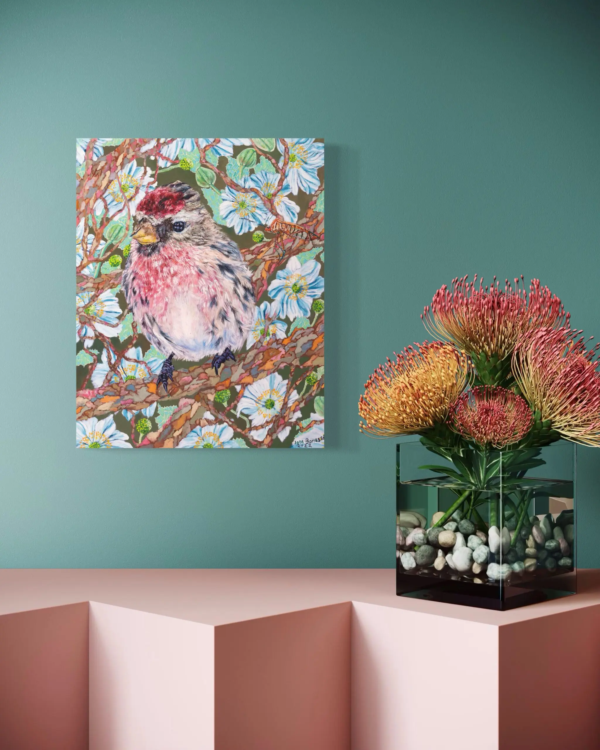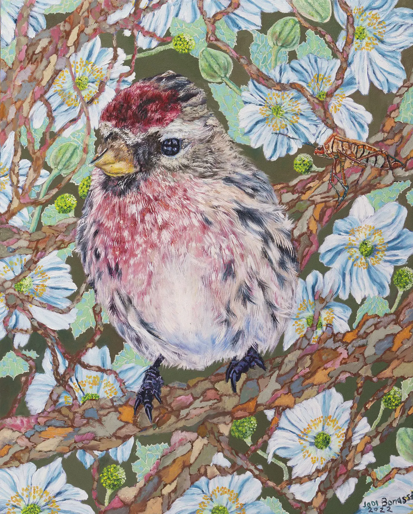 Jodi Bonassi’s work is a stunning interplay of realism, pattern, and expressive texture, where the delicate fragility of the natural world is rendered with a striking, almost surreal intensity. At the center of this vibrant tableau is a red-capped bird, its downy plumage captured in exquisite detail, every feather a testament to the artist’s deep sensitivity to form and texture. The bird’s gaze, at once alert and contemplative, suggests an intimacy with its surroundings—an awareness of the intricate, living tapestry in which it is embedded.