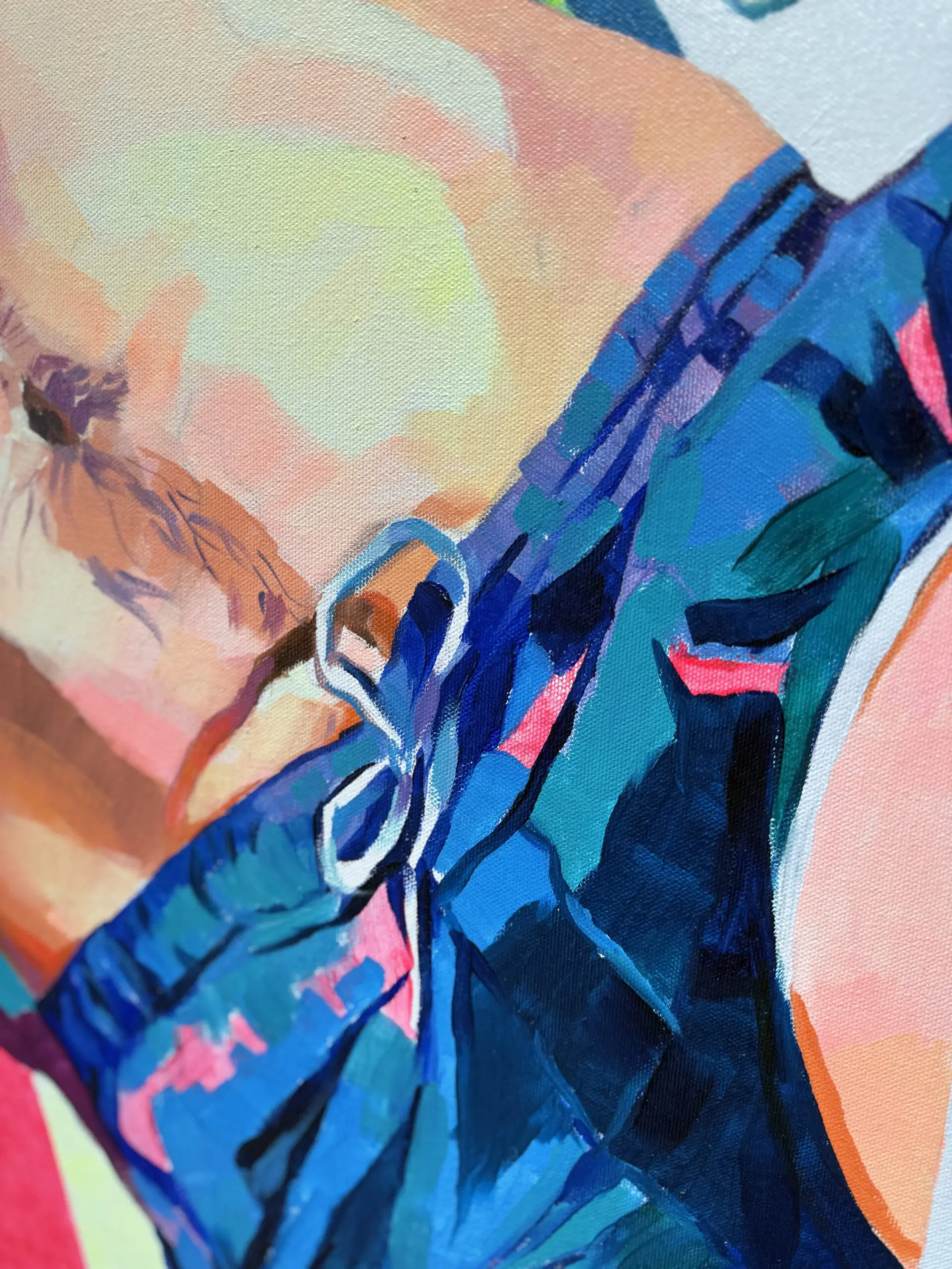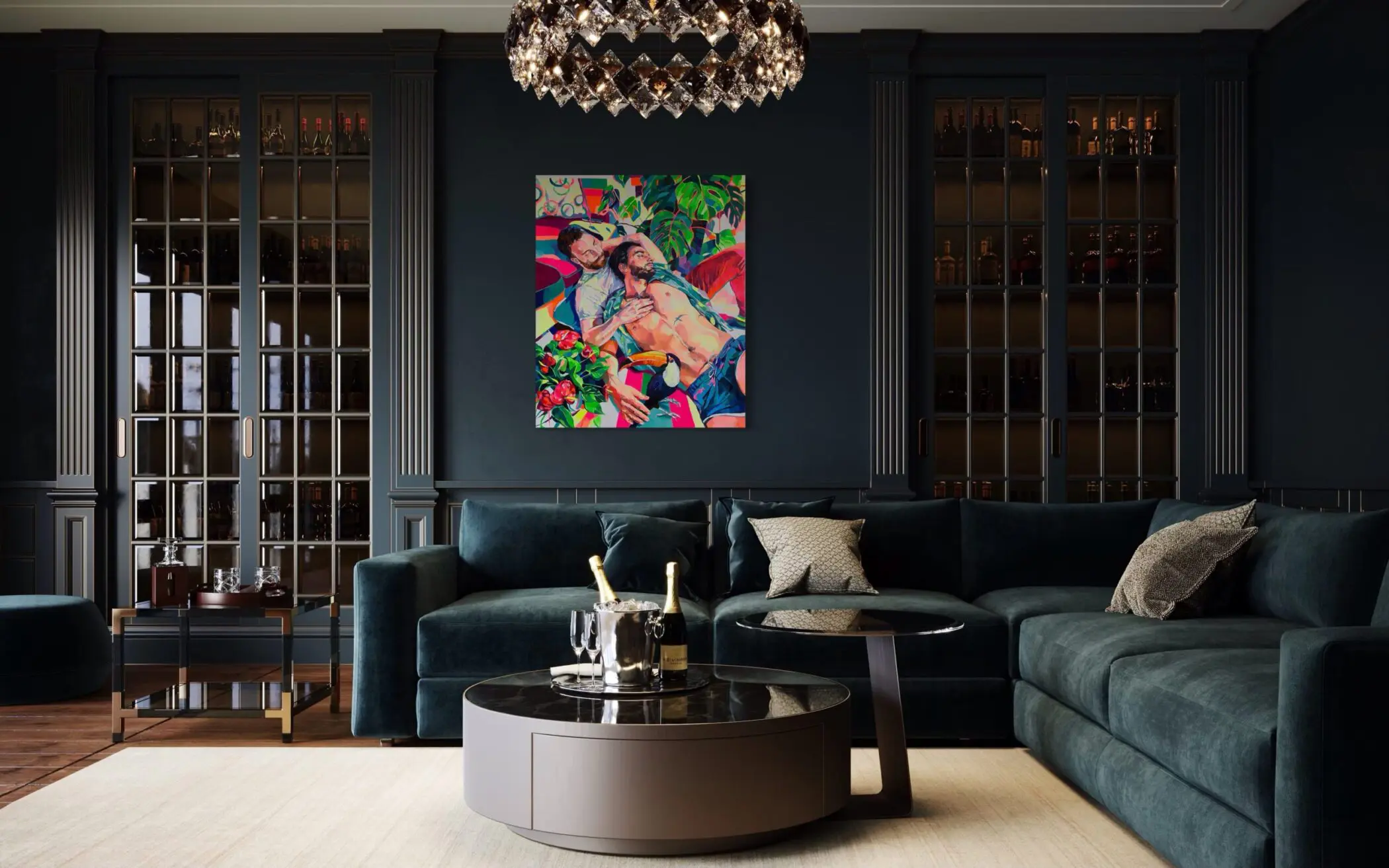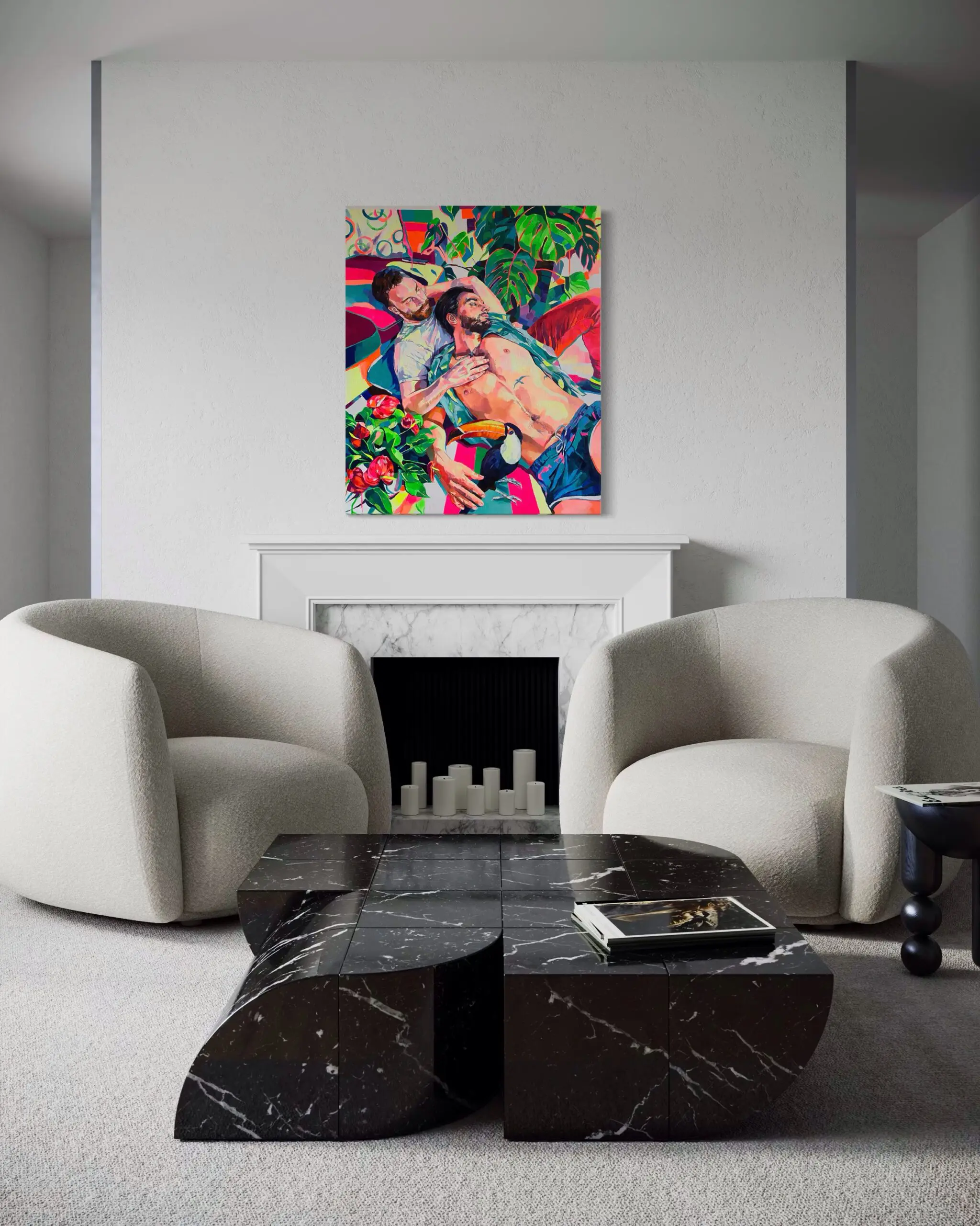 Two reclining figures, rendered in bold, gestural strokes, exist in a state of tender repose, their bodies intertwined within a riot of verdant foliage and riotous color. One figure’s contemplative gaze extends outward, while the other’s touch is both grounding and affectionate, reinforcing the intimacy of the moment. The presence of a toucan—a surreal yet fitting addition—adds a heightened sense of whimsy, its bold beak punctuating the fluidity of form and color like an exclamation mark within the dreamlike scene.