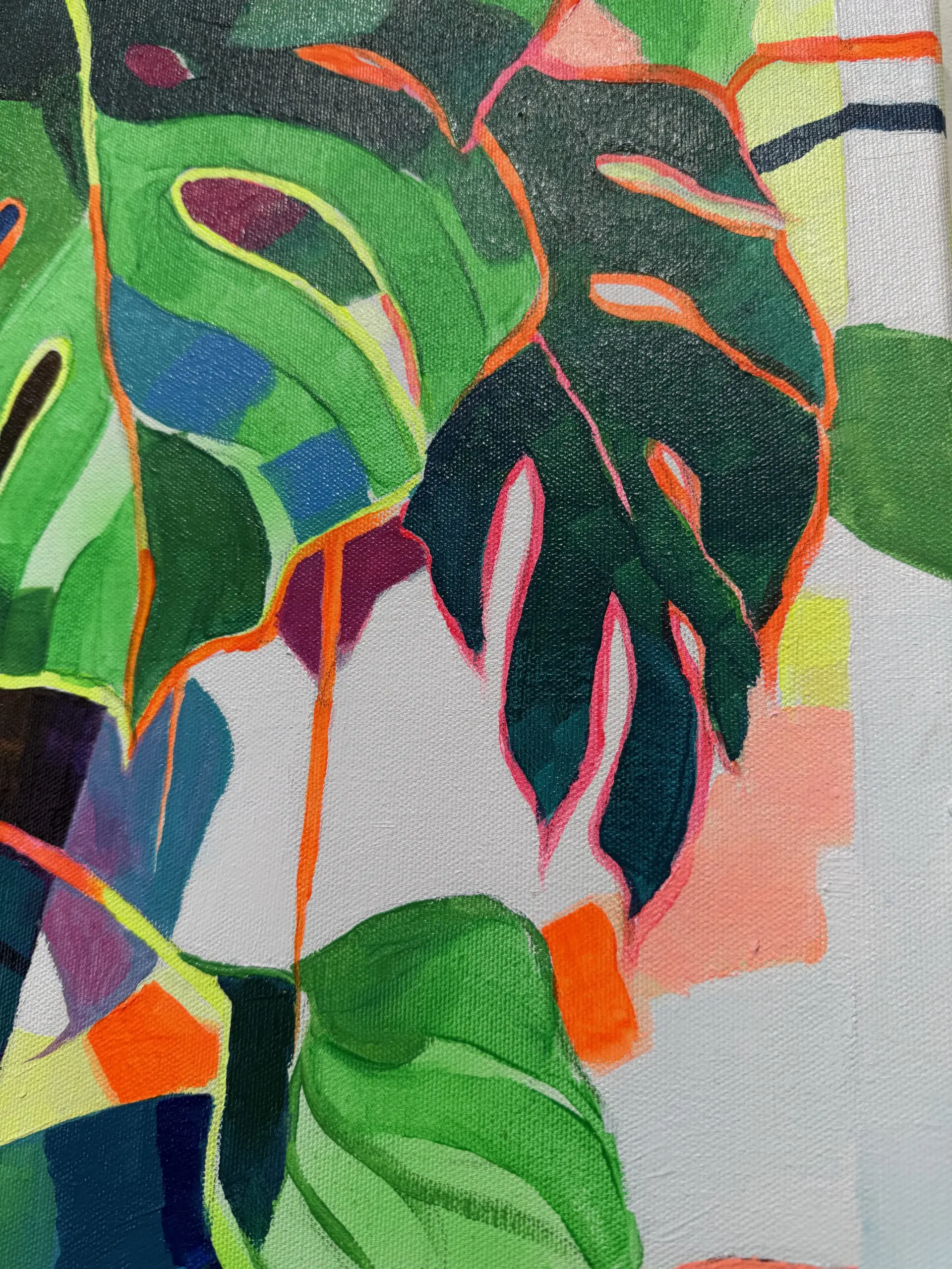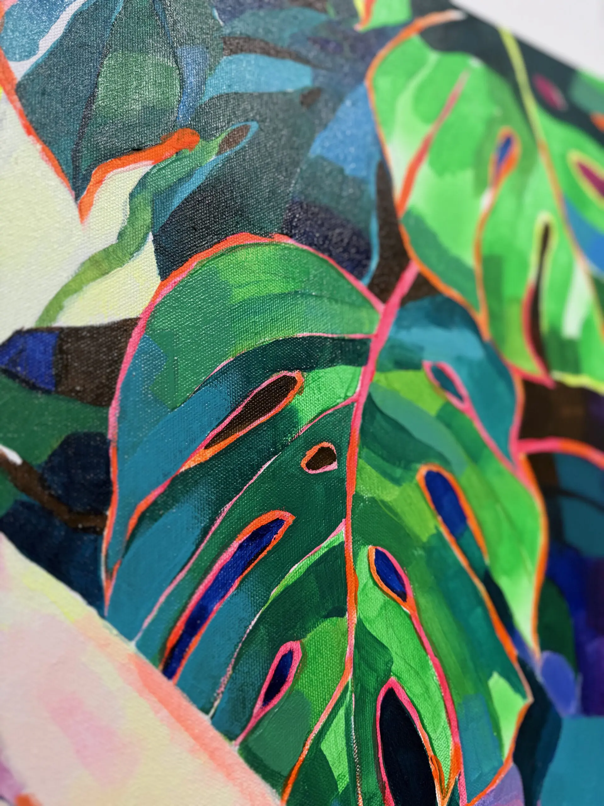 The palette is intoxicating—coral, emerald, and cerulean collide in a rhythmic, pulsing symphony, where each brushstroke breathes life into the composition. The interplay of patterns, from flowing textiles to sprawling leaves and petals, dissolves the distinction between figure and environment, reinforcing a sense of oneness with nature. The painting radiates sensuality and warmth, yet beneath the lushness lies an undercurrent of ephemeral beauty—the fleeting nature of idyllic moments and the impermanence of paradise.