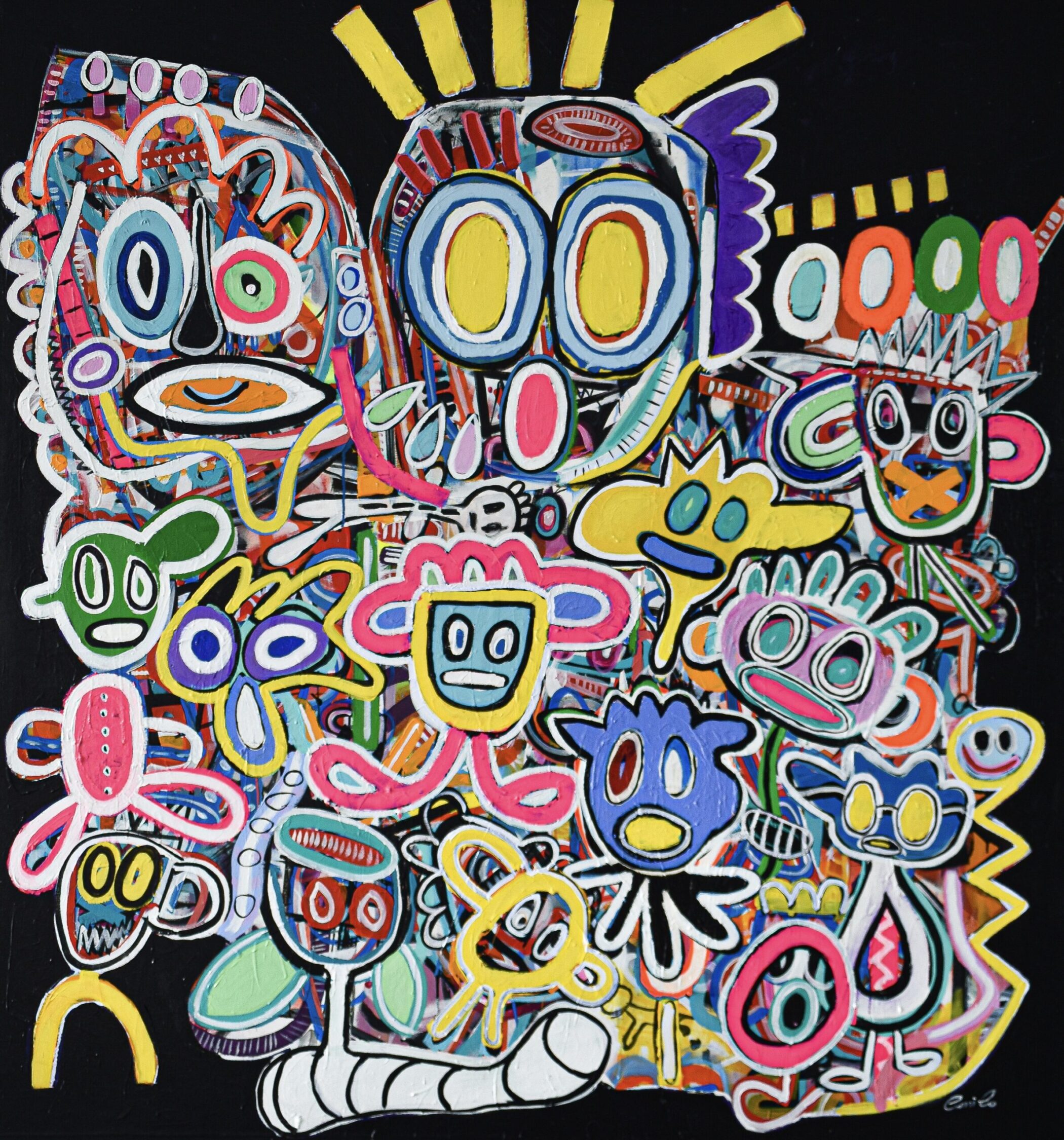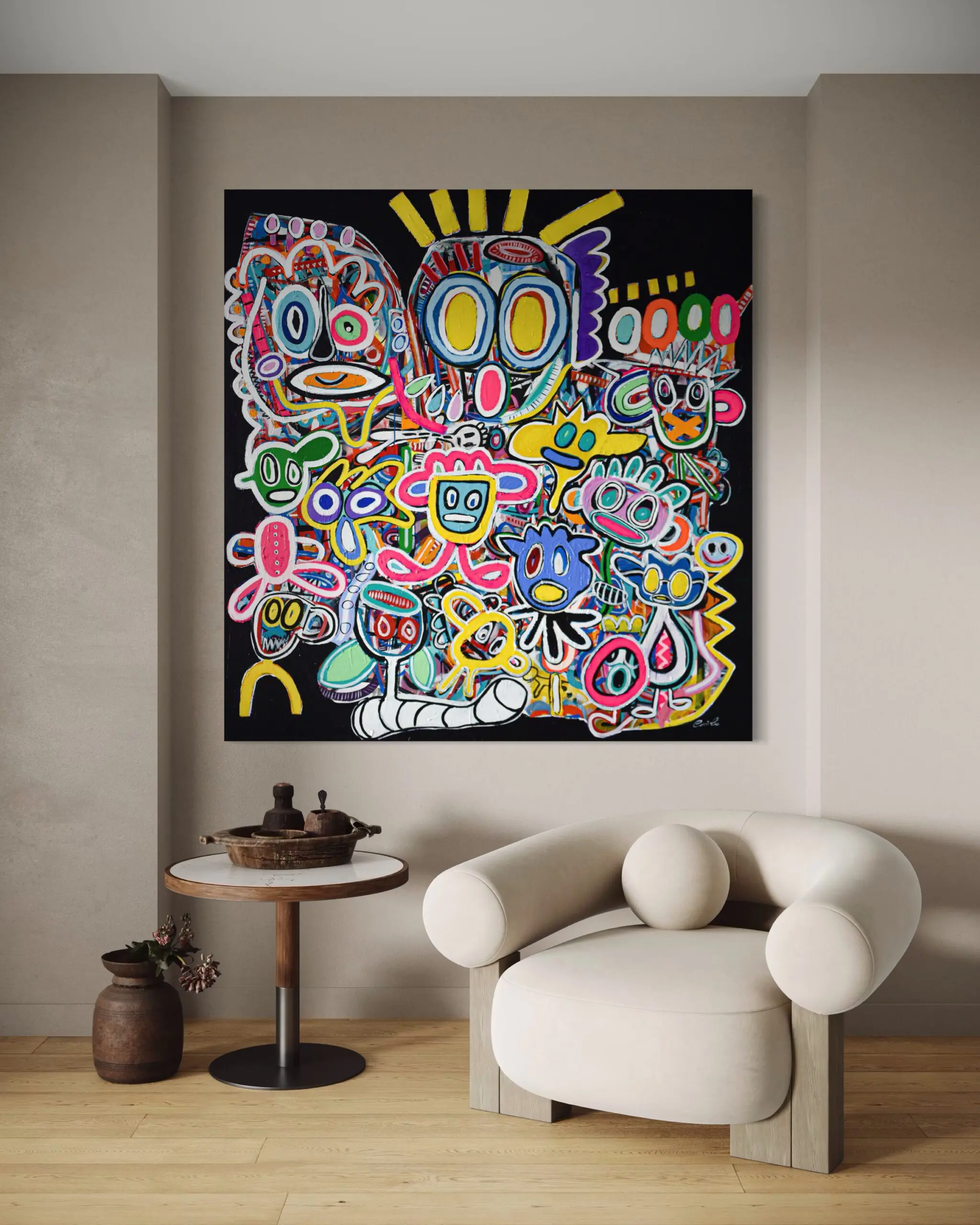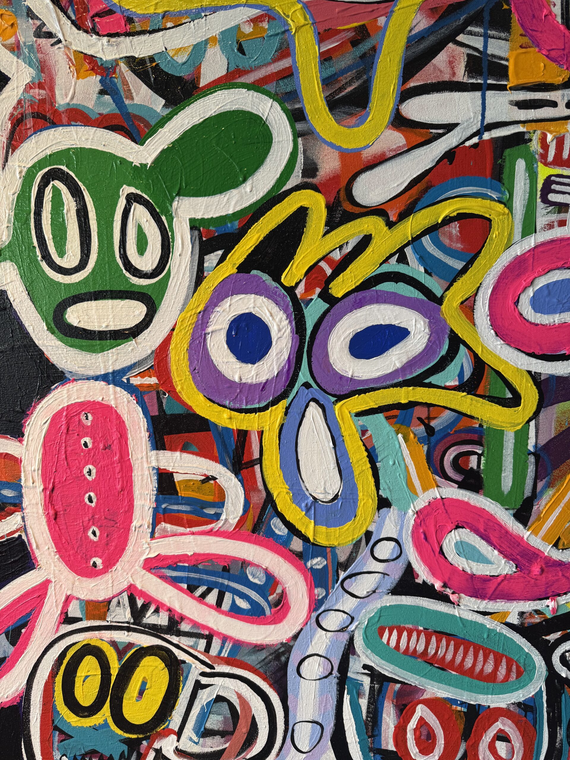 Against a deep black void, a kaleidoscopic ensemble of characters erupts, their exaggerated features—wide, staring eyes, gaping mouths, and erratic linework—transforming into visceral totems of emotion. The neon palette—electric pinks, blues, yellows, and greens—radiates against the darkness, heightening the painting’s sense of movement, chaos, and celebration. The work is alive, its very essence laughing, shouting, and reveling in its own existence.