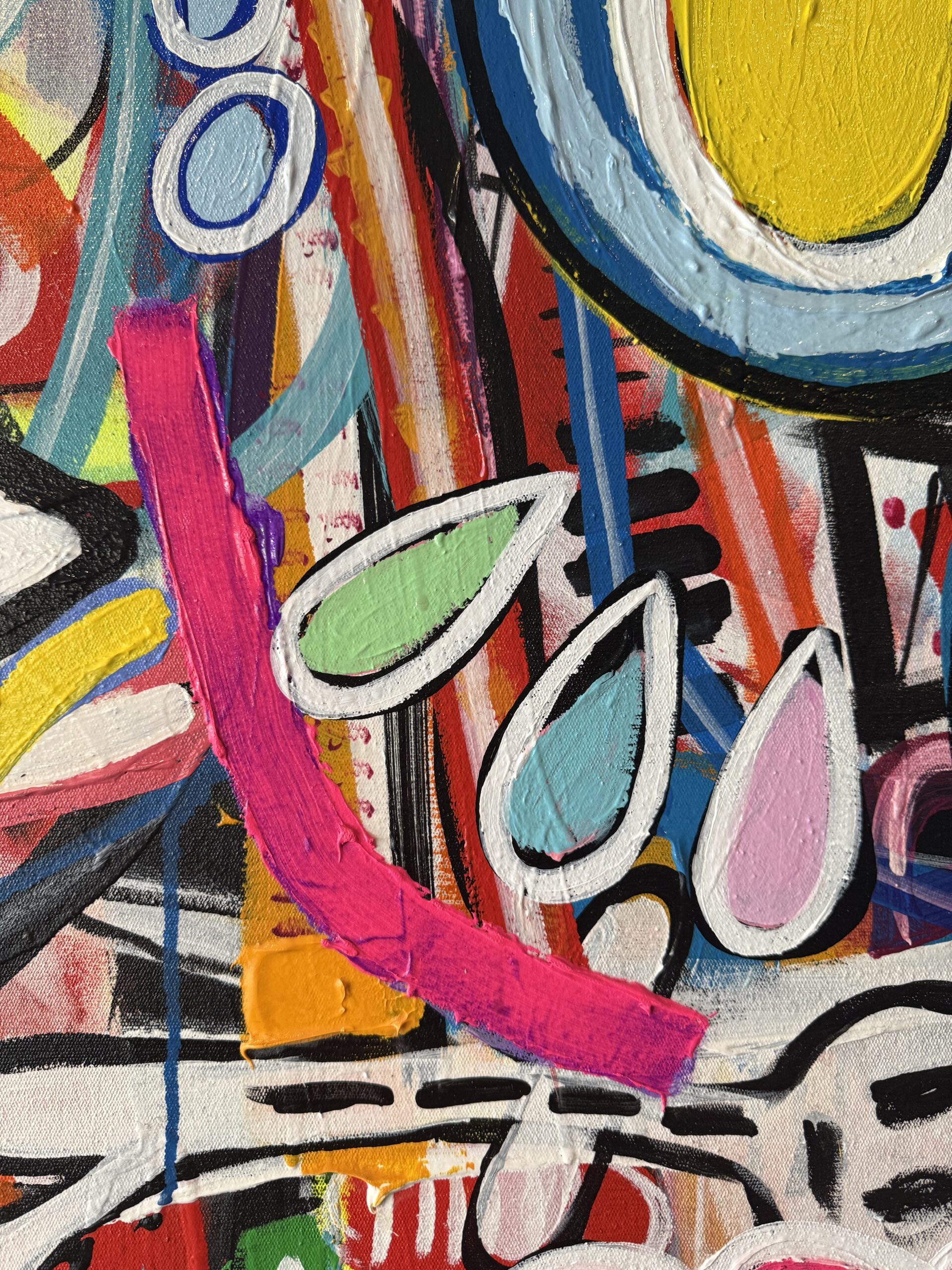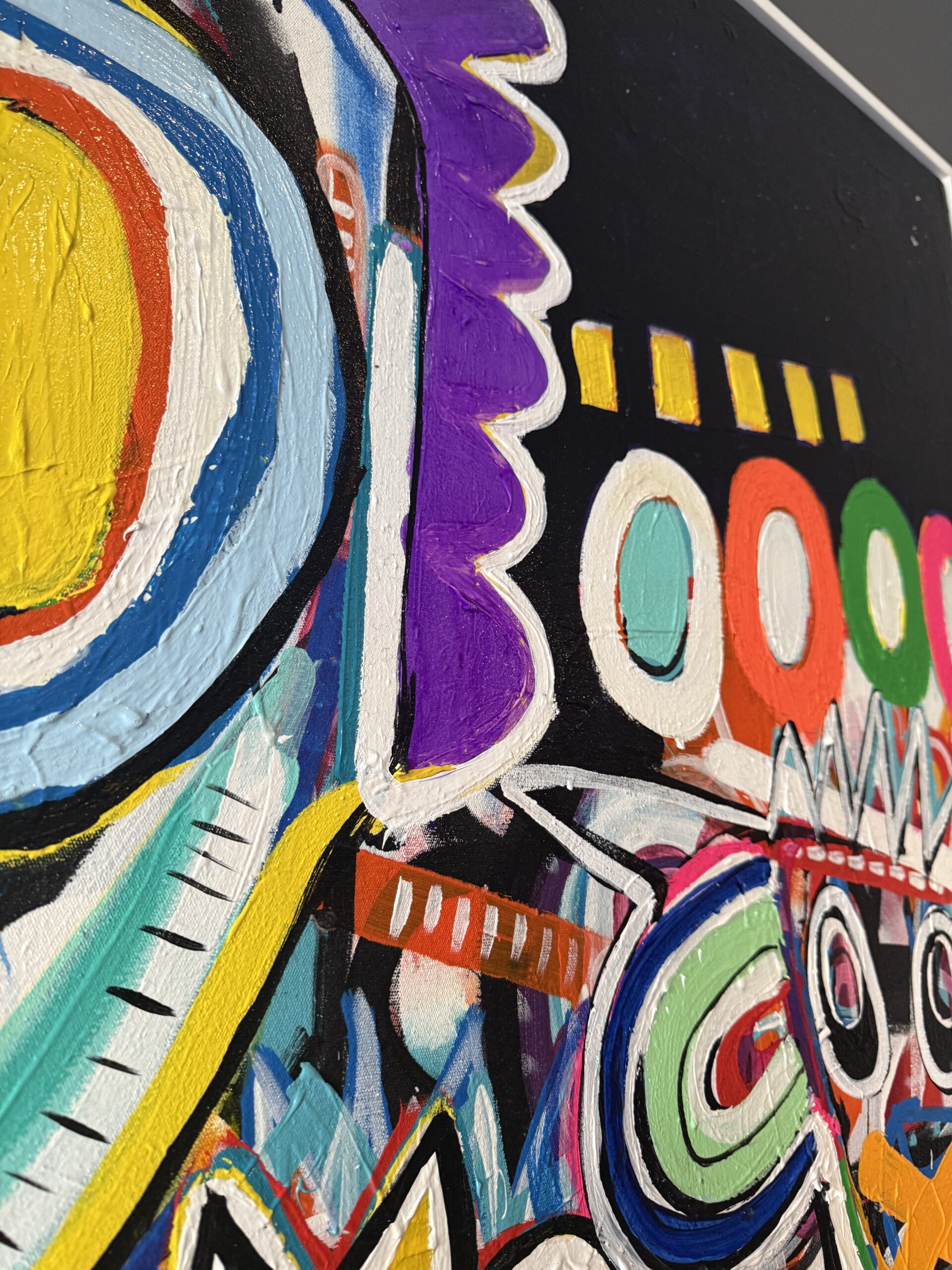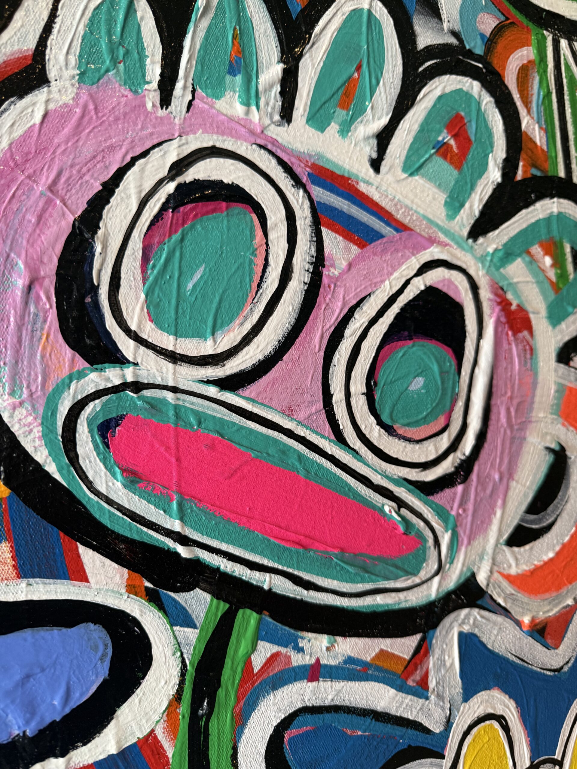 Against a deep black void, a kaleidoscopic ensemble of characters erupts, their exaggerated features—wide, staring eyes, gaping mouths, and erratic linework—transforming into visceral totems of emotion. The neon palette—electric pinks, blues, yellows, and greens—radiates against the darkness, heightening the painting’s sense of movement, chaos, and celebration. The work is alive, its very essence laughing, shouting, and reveling in its own existence.