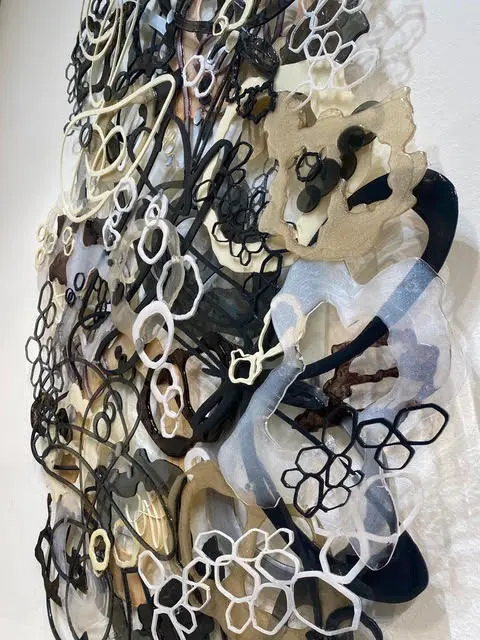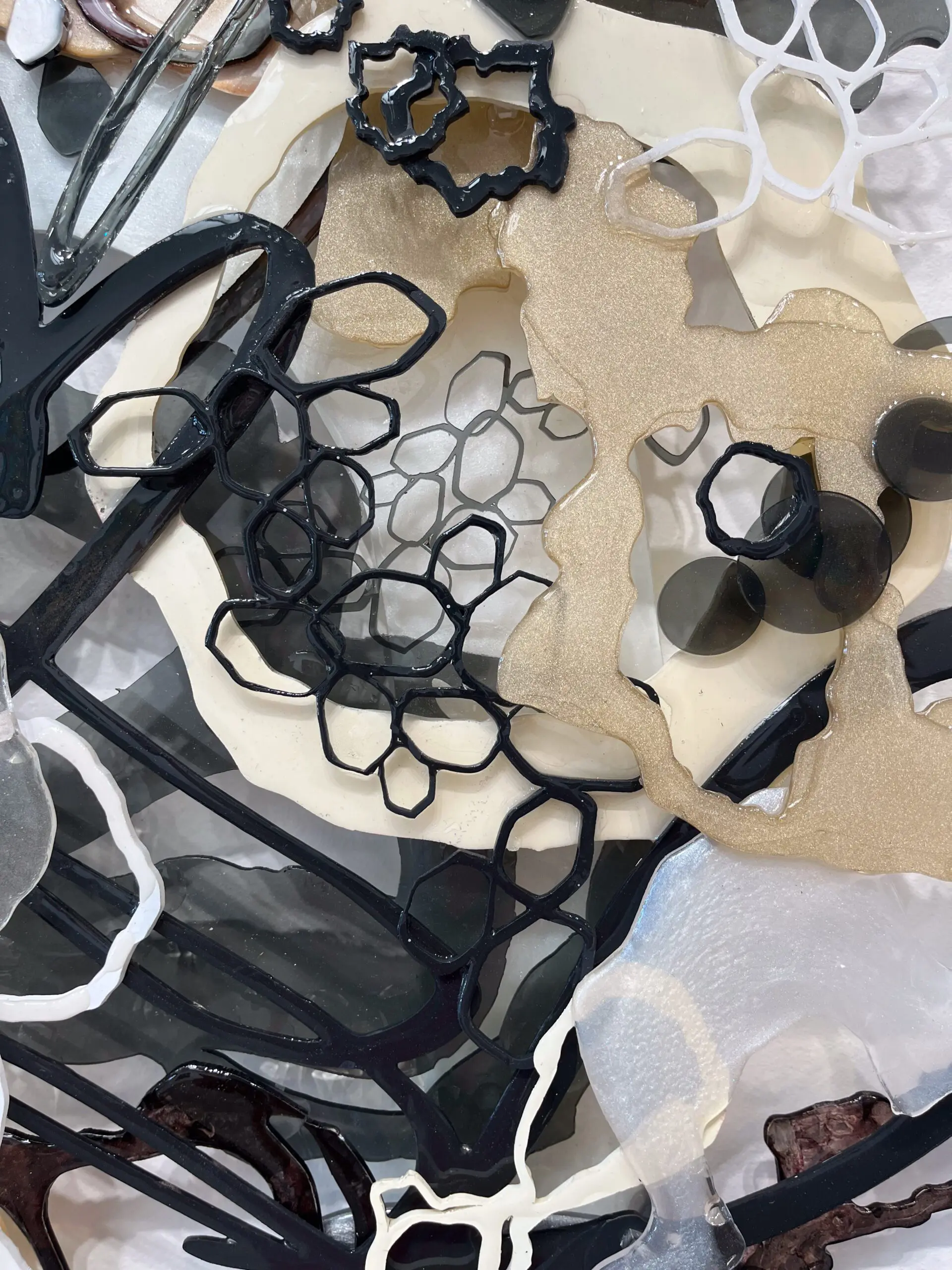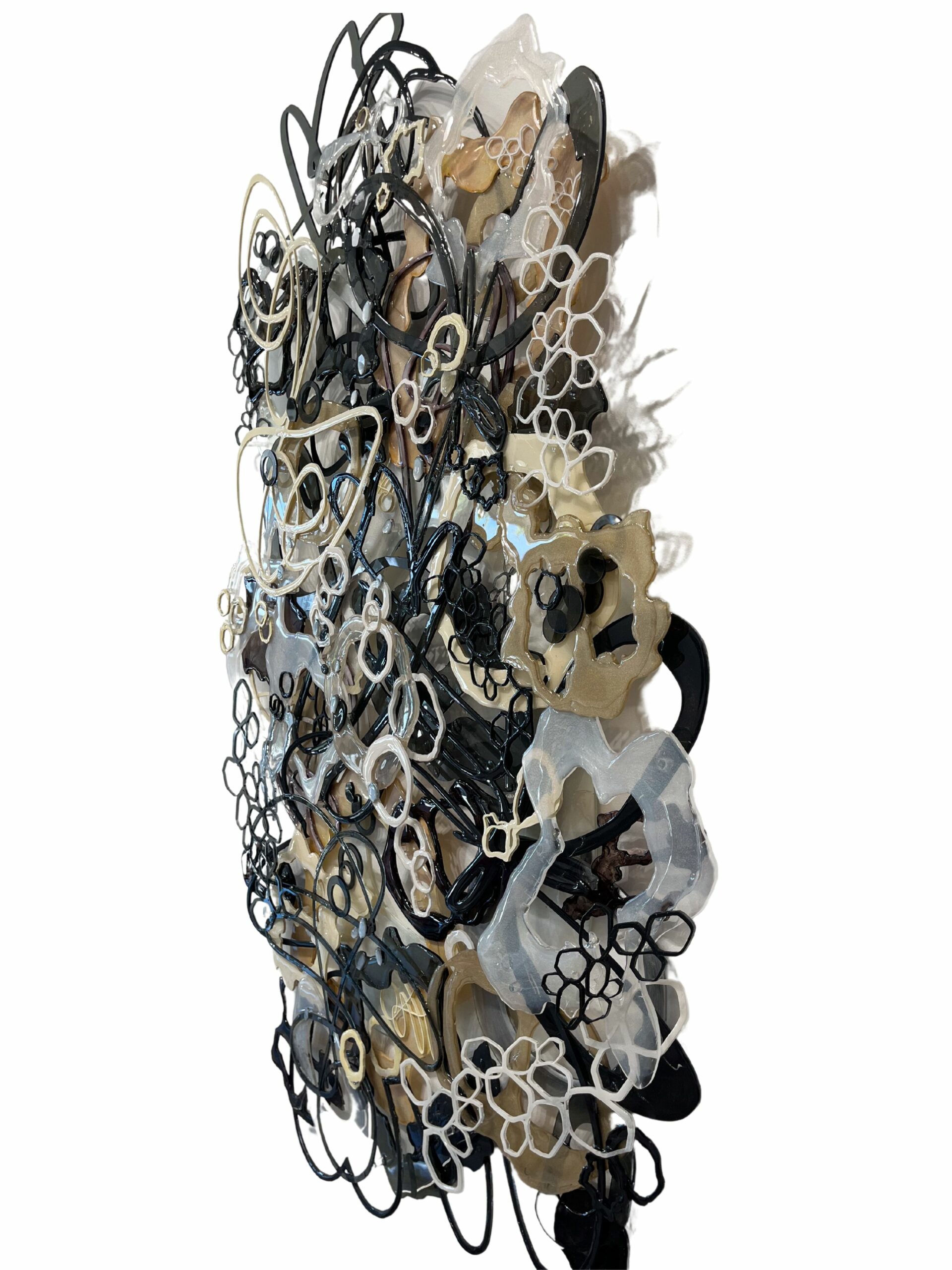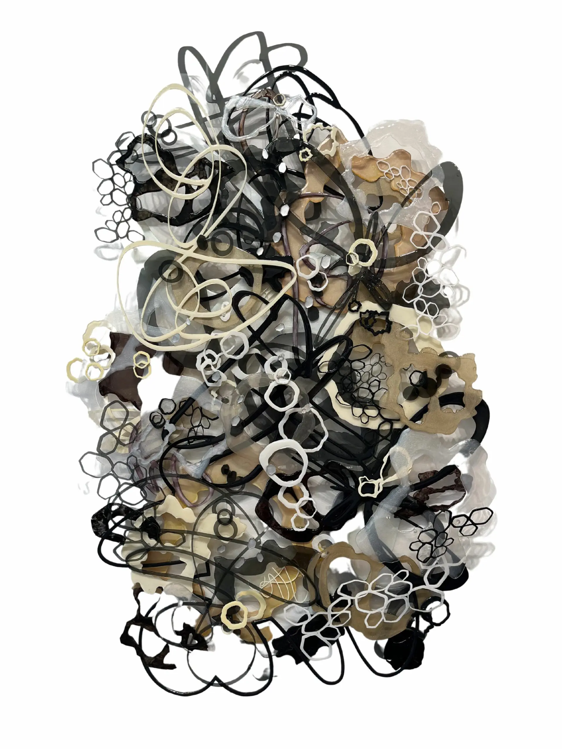 An opulent mixed-media marvel, woven from the intricate interplay of acrylic, ink, epoxy, and laser-cut plexiglass. Overlapping forms gracefully traverse the composition in sophisticated neutral tones encompassing grays, beige, black and white. Circular shapes, imbued with a glossy finish, emulate ethereal luminosity, each detail a testament to Jennifer Haley’s artful precision. Intricately stylized drips fall like liquid gold as honeycomb-shaped white and black forms intermingle in an abstract embrace, embodying the convergence of conceptual mastery and craftsmanship.