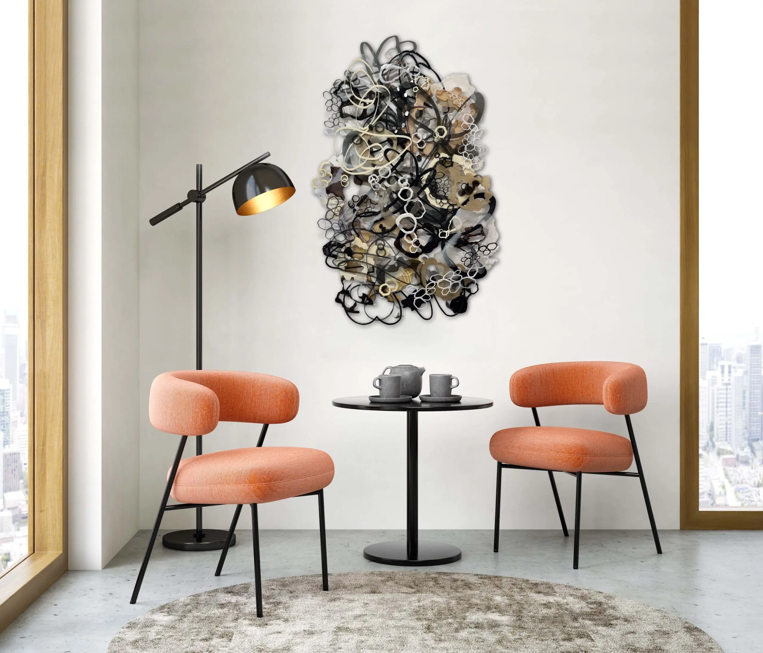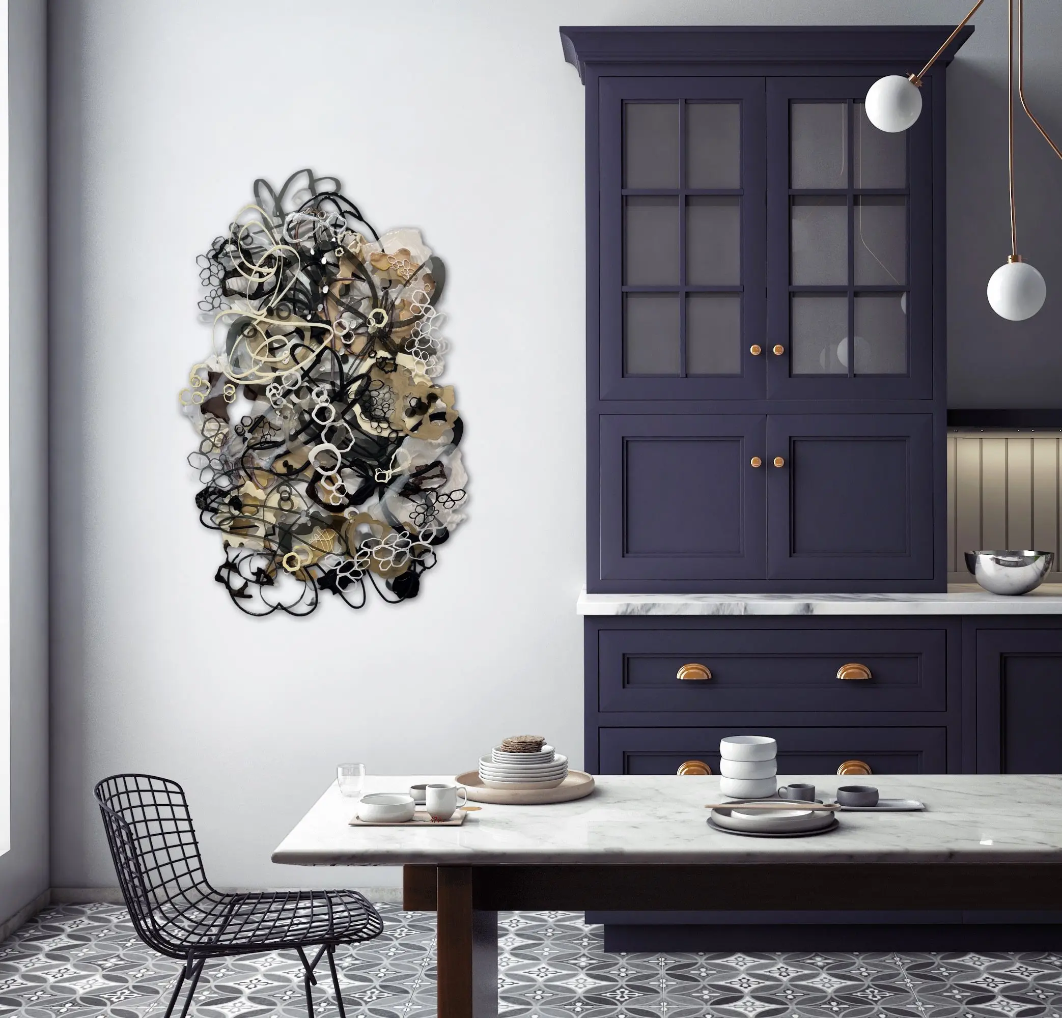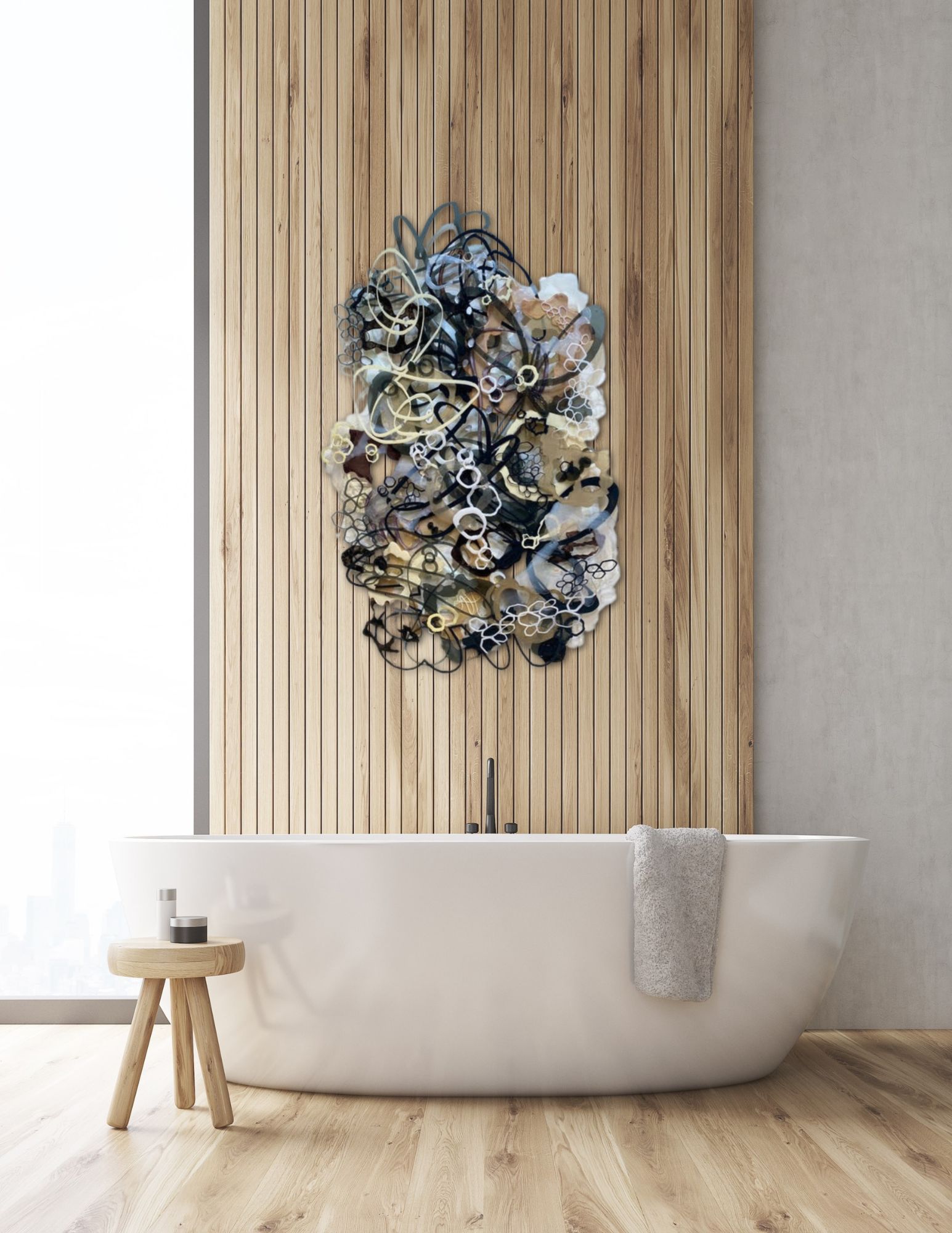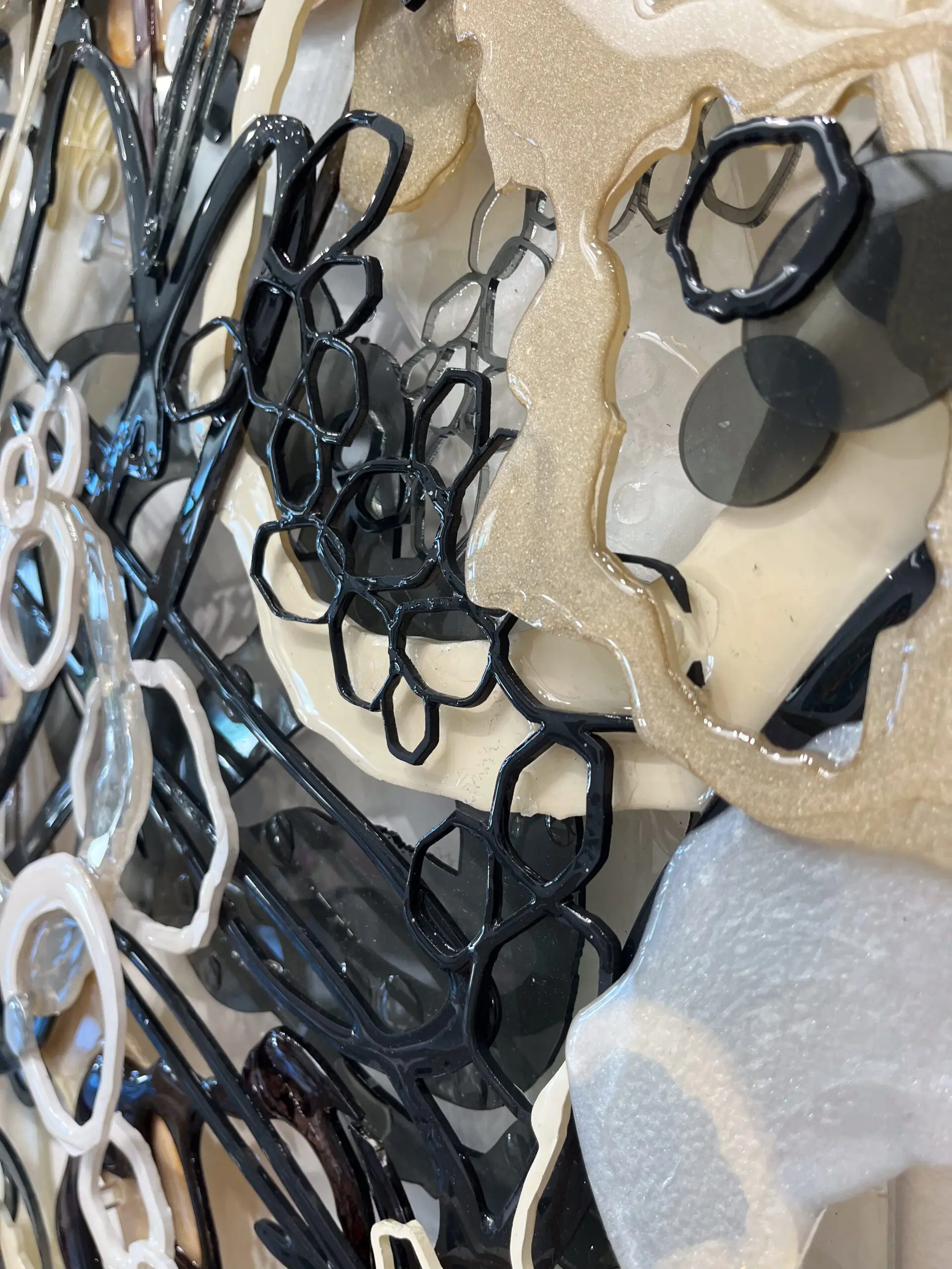 An opulent mixed-media marvel, woven from the intricate interplay of acrylic, ink, epoxy, and laser-cut plexiglass. Overlapping forms gracefully traverse the composition in sophisticated neutral tones encompassing grays, beige, black and white. Circular shapes, imbued with a glossy finish, emulate ethereal luminosity, each detail a testament to Jennifer Haley’s artful precision. Intricately stylized drips fall like liquid gold as honeycomb-shaped white and black forms intermingle in an abstract embrace, embodying the convergence of conceptual mastery and craftsmanship.