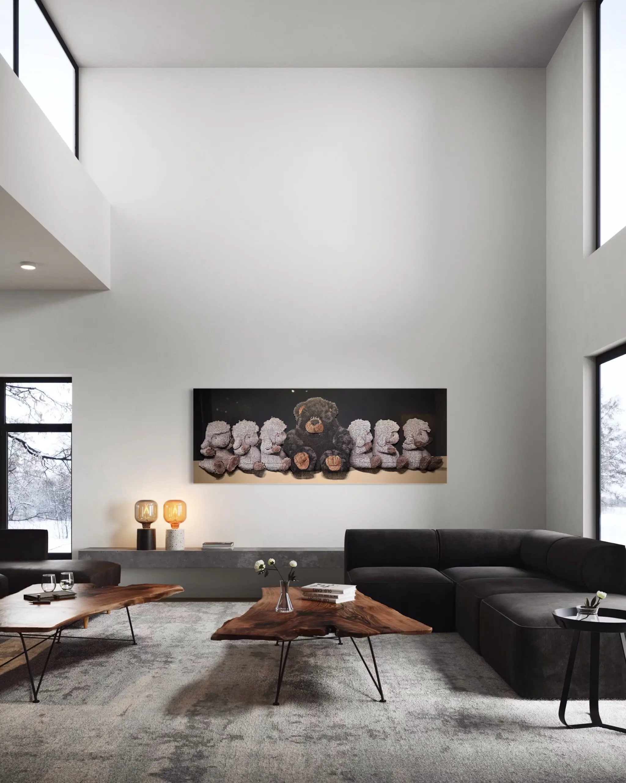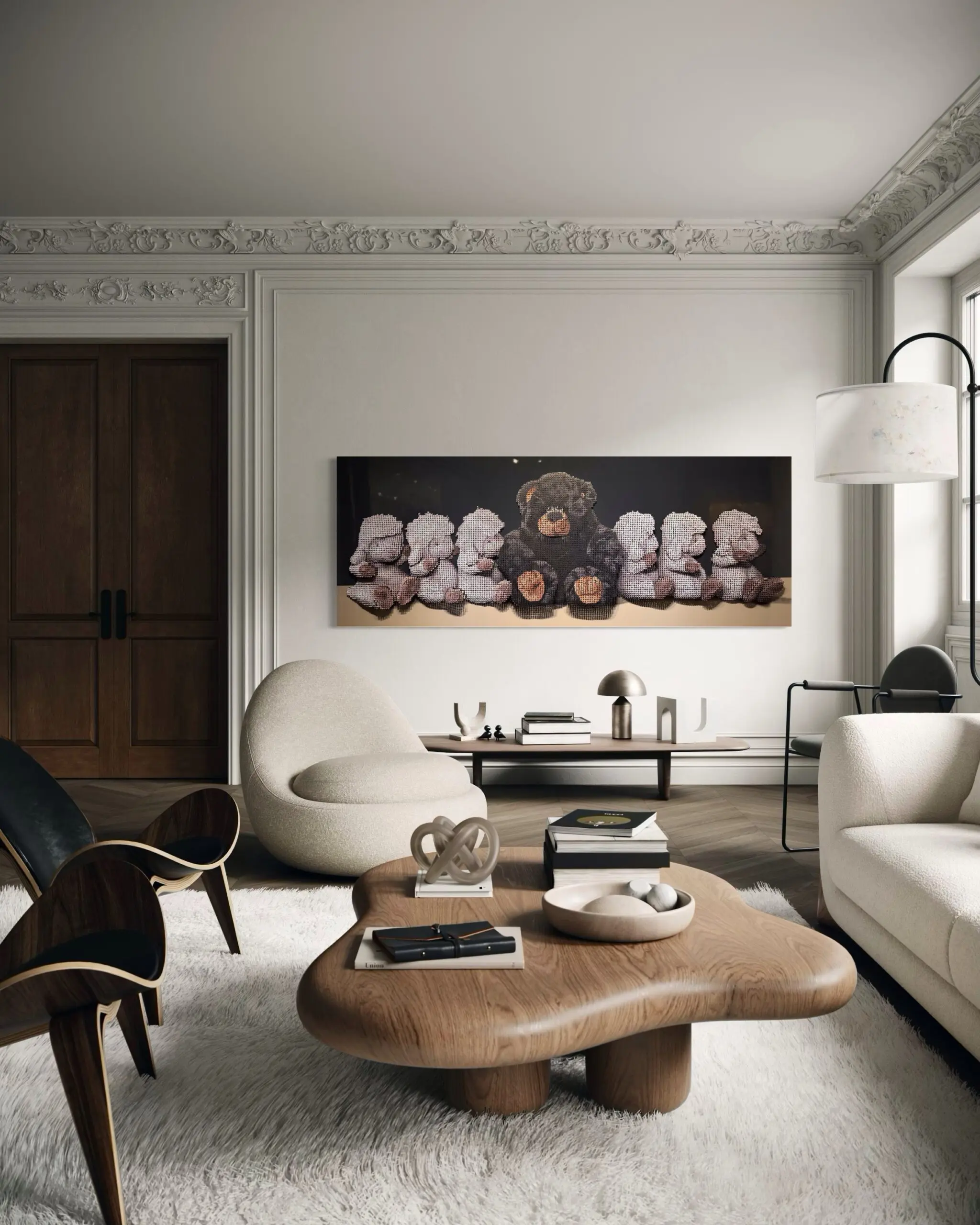 At the center of the piece, a lone black teddy bear stands in stark contrast to a uniform row of white ones, creating a powerful visual metaphor for difference, exclusion, and the weight of imposed expectations. The sharp, metallic rigidity of the screws introduces an unexpected tension—while they physically bind the composition together, they also represent the restrictive structures that define inclusion and exclusion in society. The gradual tonal shifts and depth of the screws create a stunning illusionistic effect, drawing the viewer into a narrative that blurs the boundaries between material, message, and meaning.