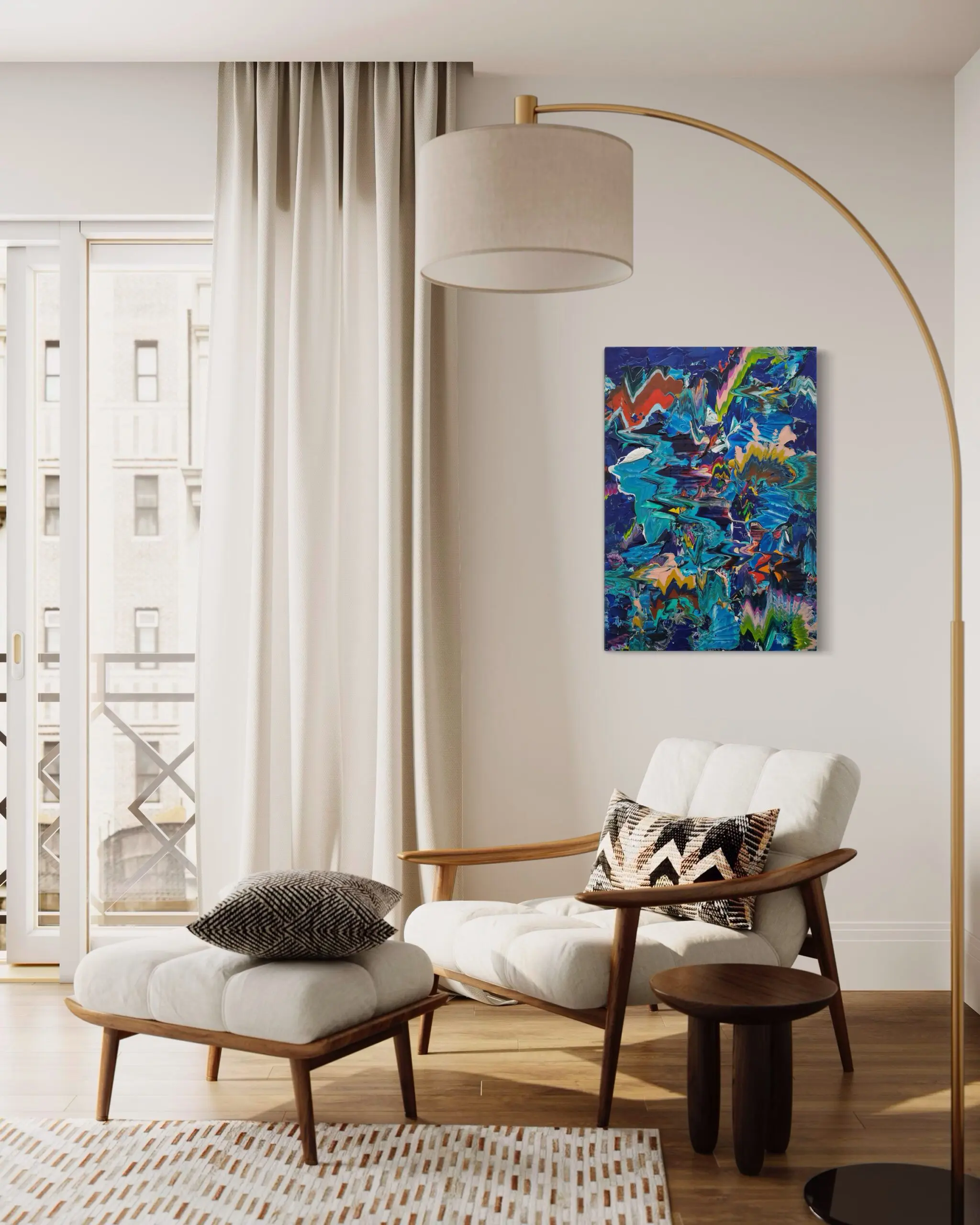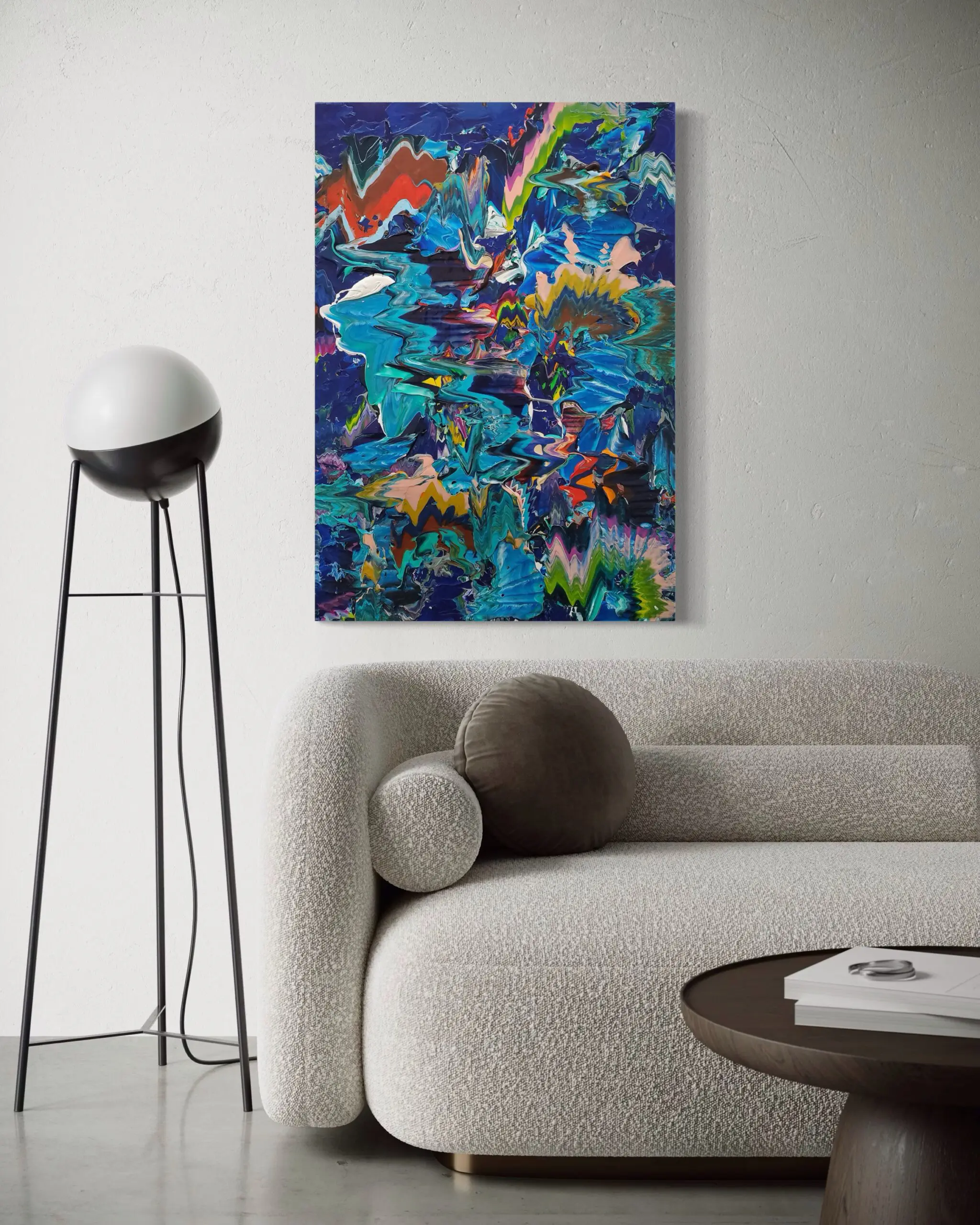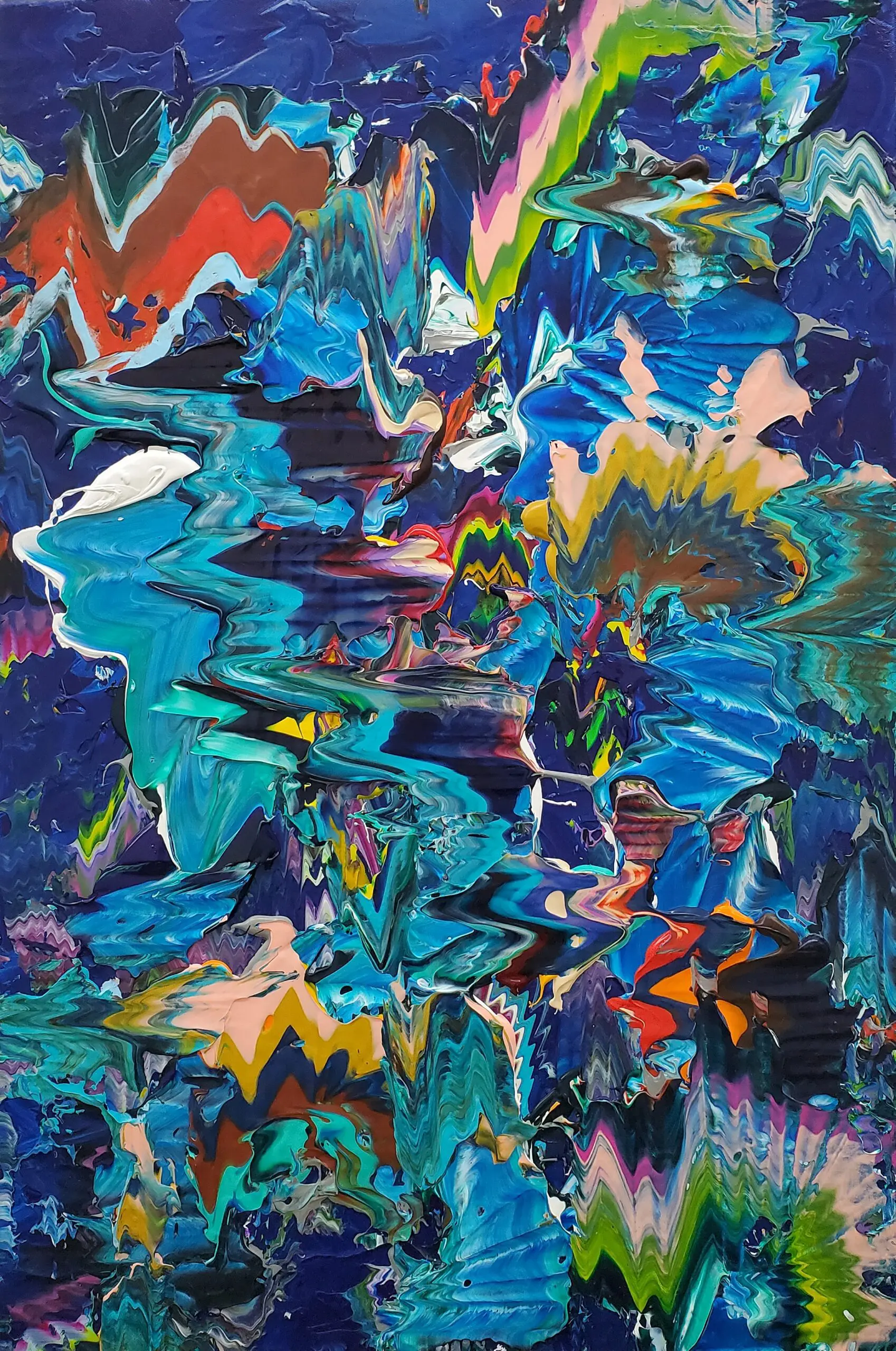 This piece captures the sensation of traversing a moonlit landscape where the natural world transforms under the glow of the night sky. Standish’s latest work presents a striking contrast between deep, saturated blues and jagged eruptions of vibrant color, echoing the way moonlight reveals the hidden vibrancy of the nocturnal wilderness. The composition is dense, layered, and restless, with fractured forms that appear to shift and recombine, much like the shifting shadows and fleeting glimmers of bioluminescent life.